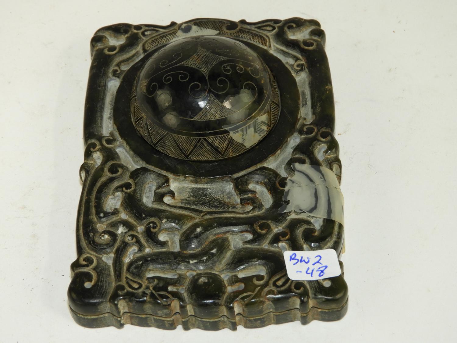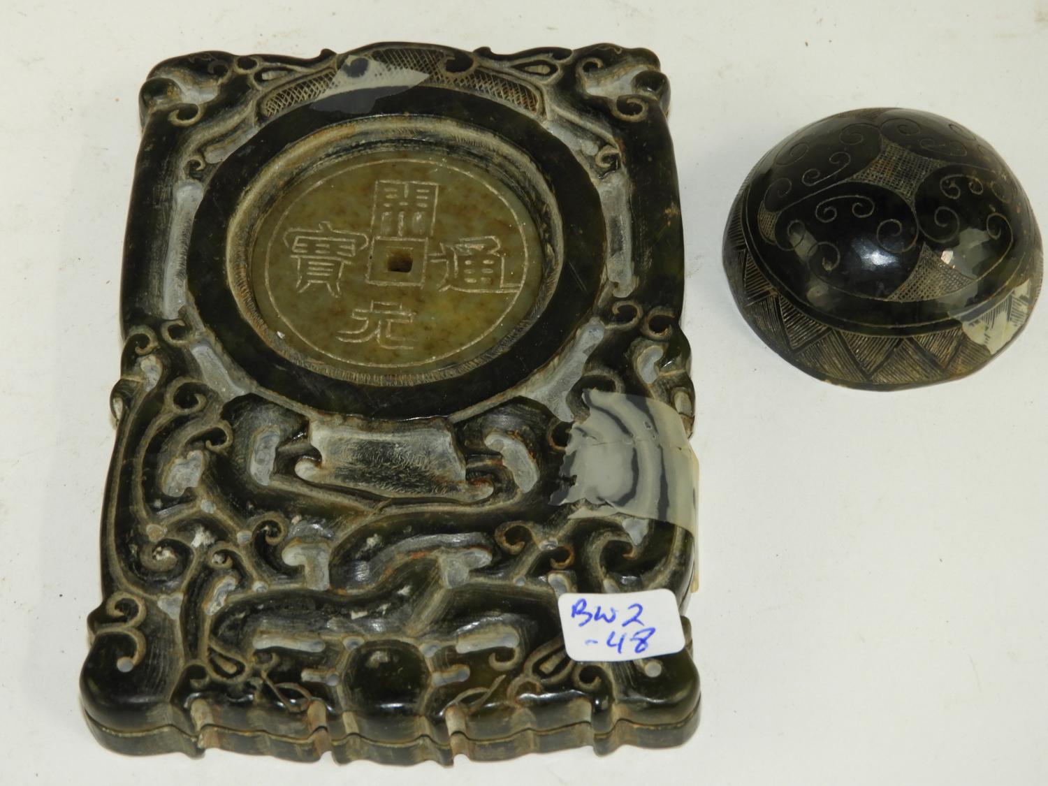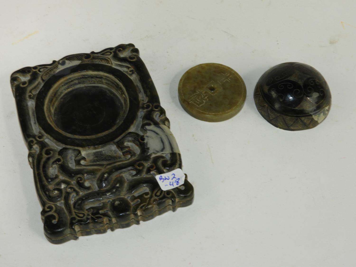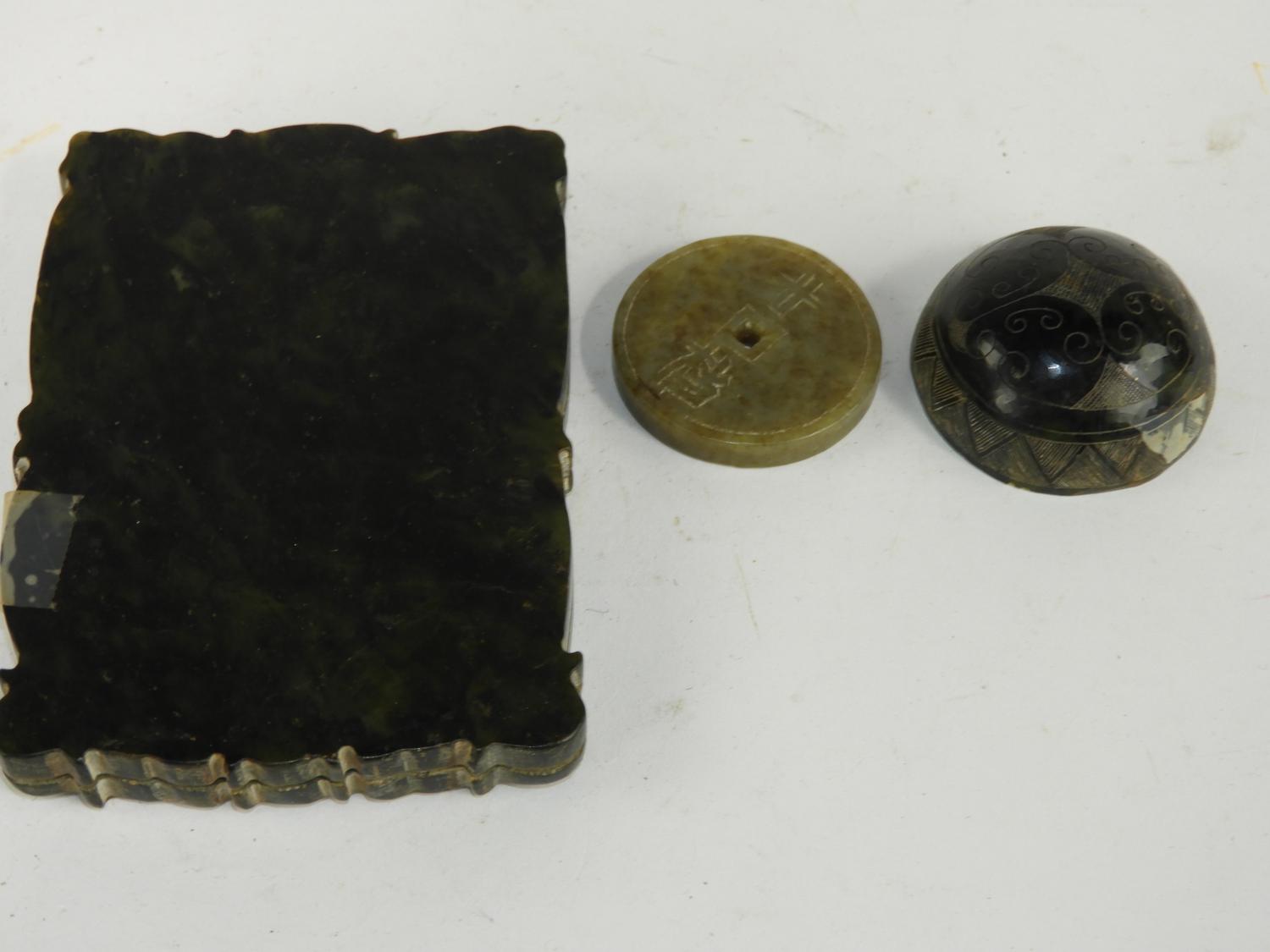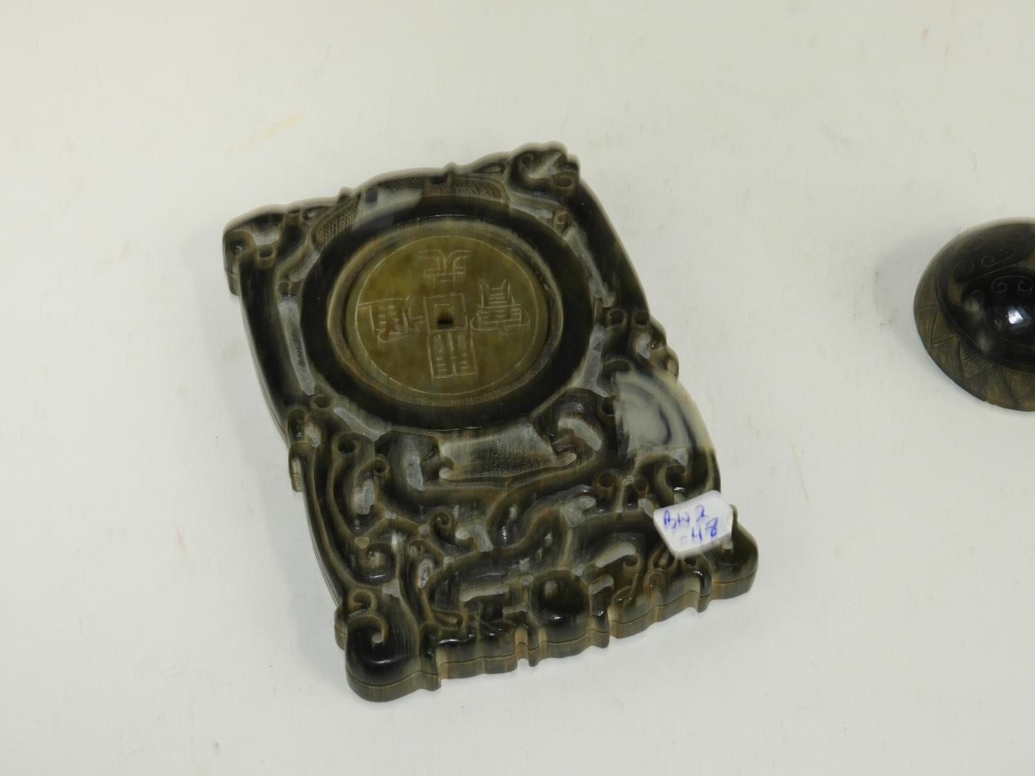 carved hardstone plaque with covered bi-disc, 4 1/4" x 3"