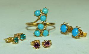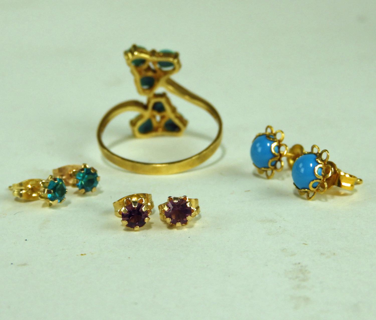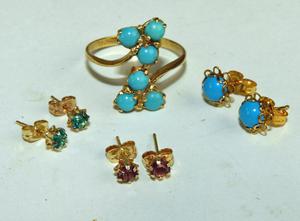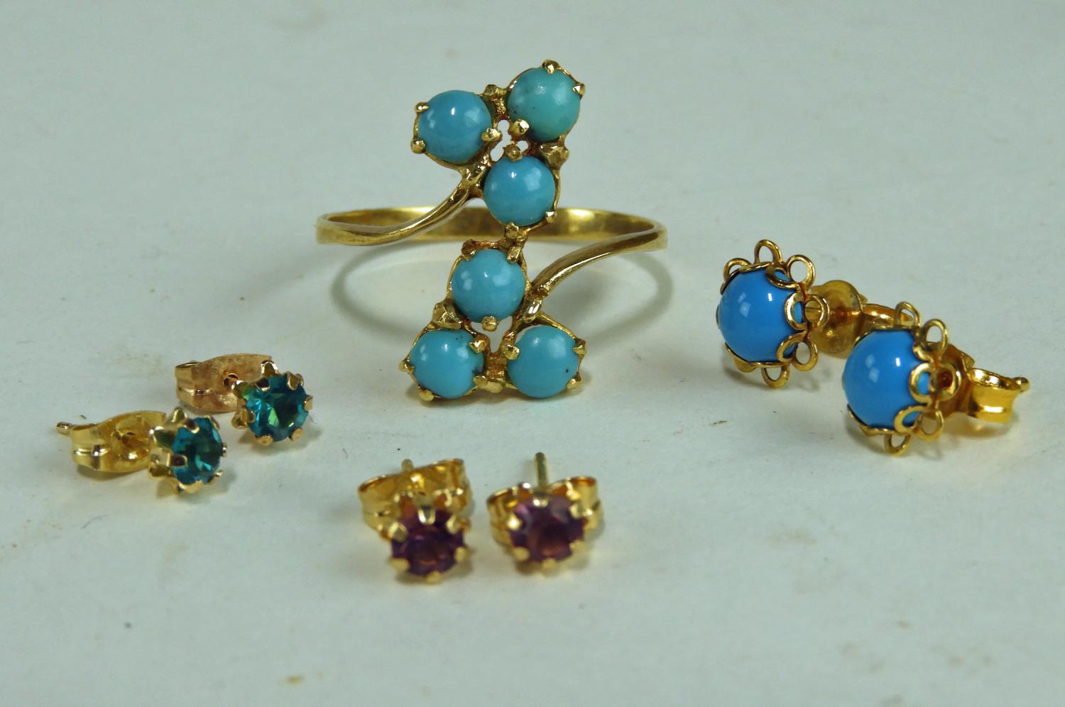 2pr 10k gold stud earrings with turquoise ring / earrings