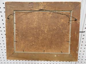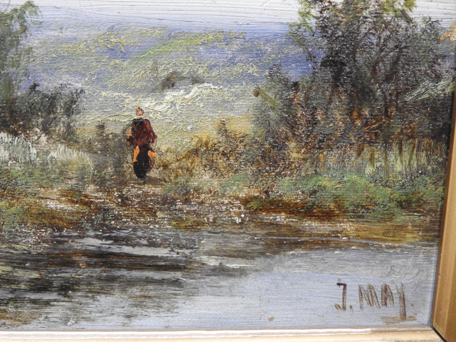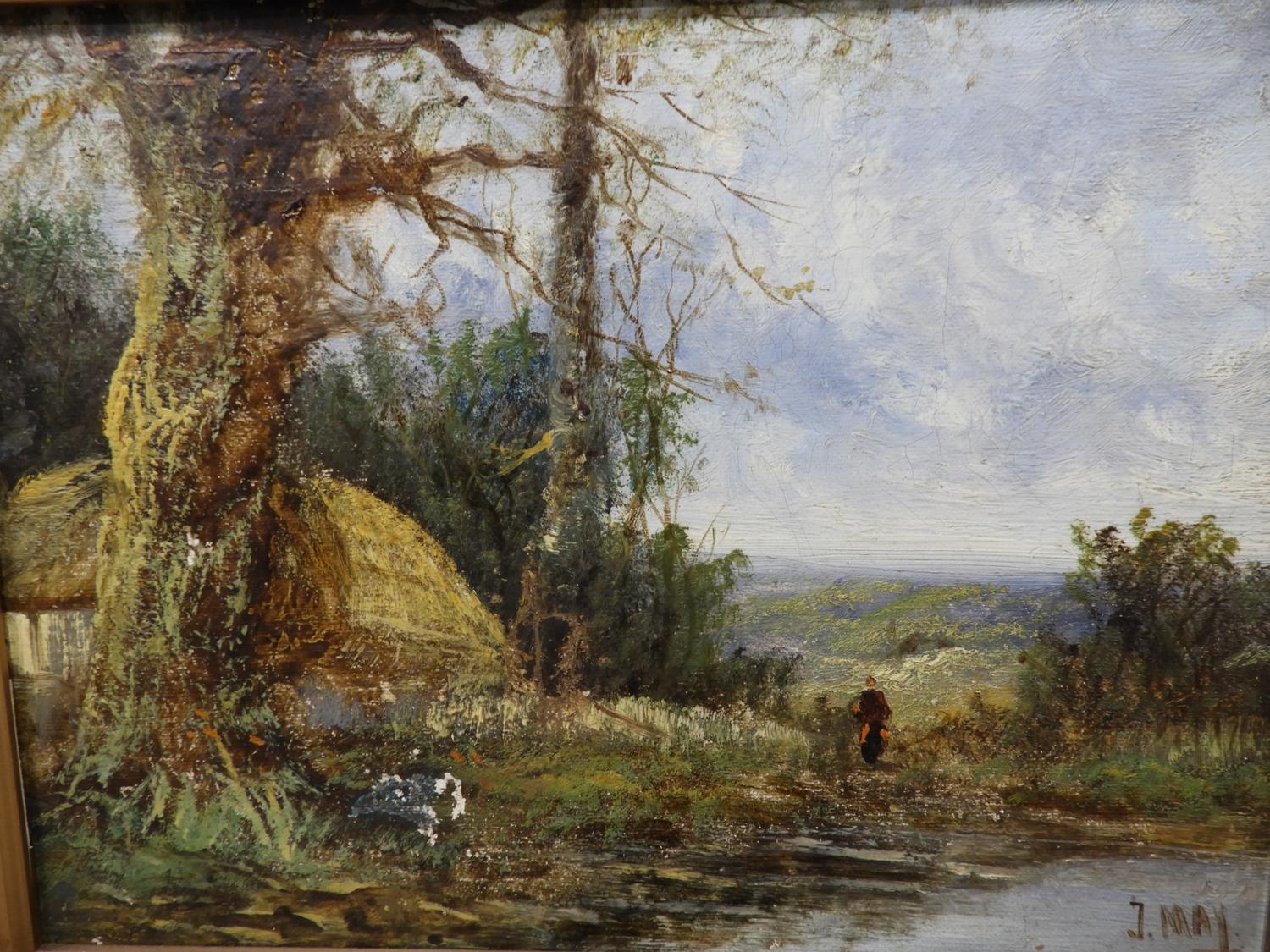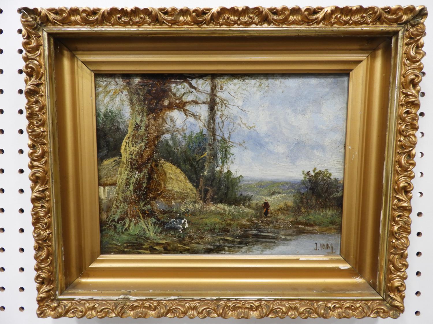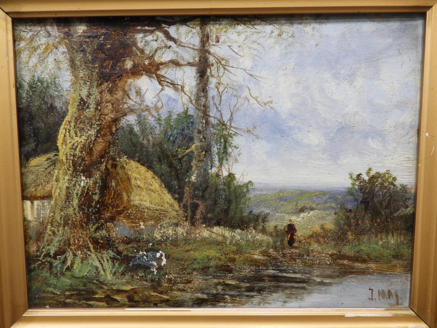 j. may, oil on board, 9" x 11", "figure by thatched cottage"