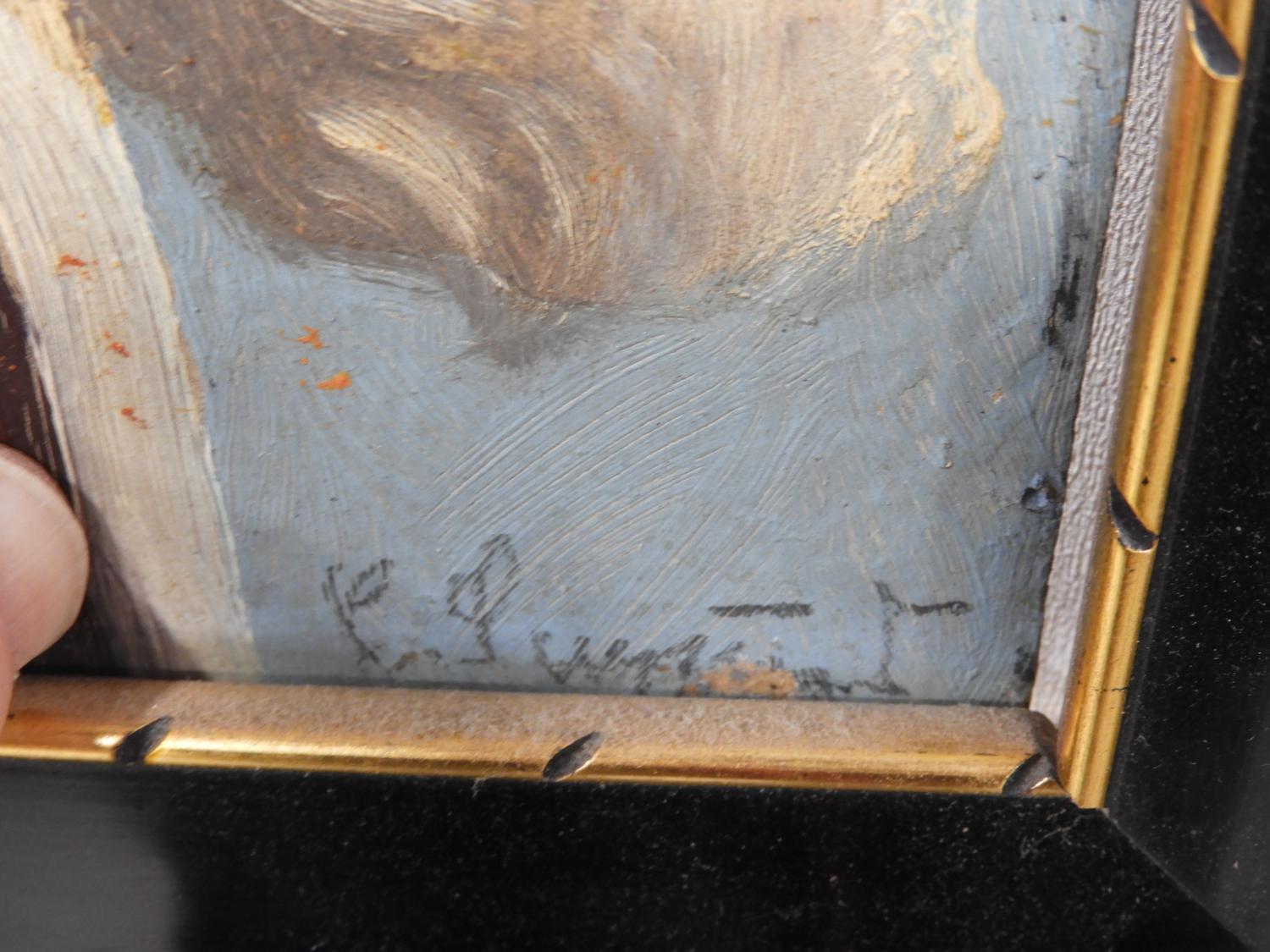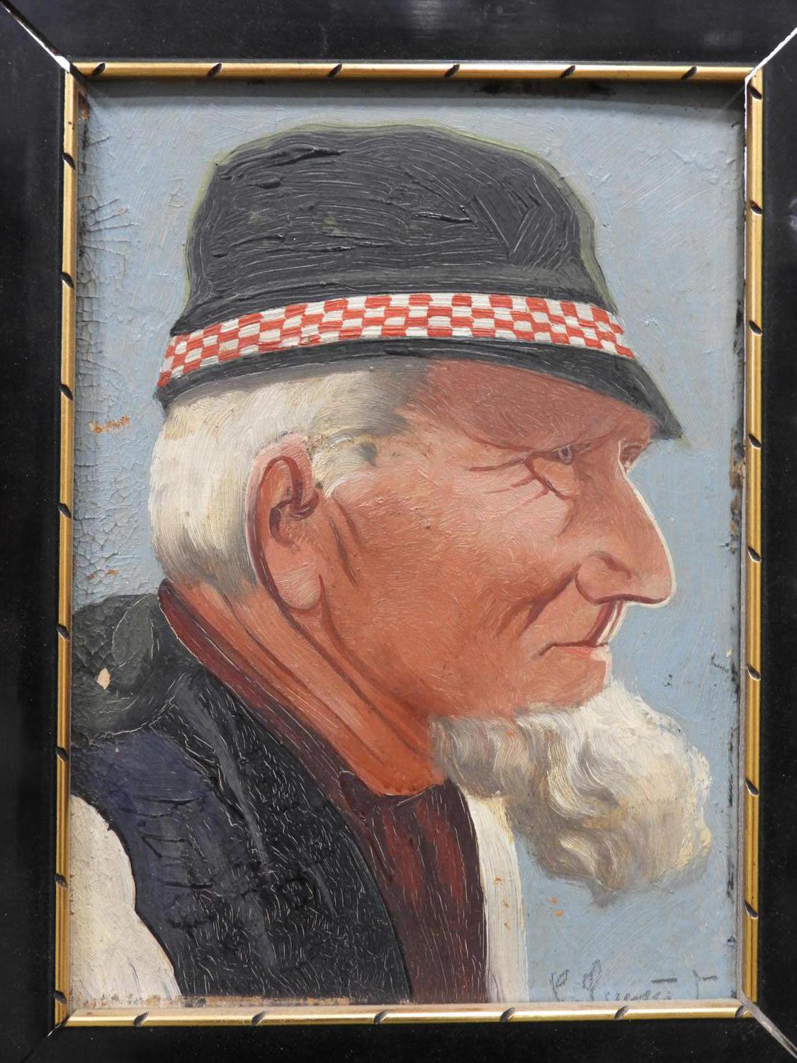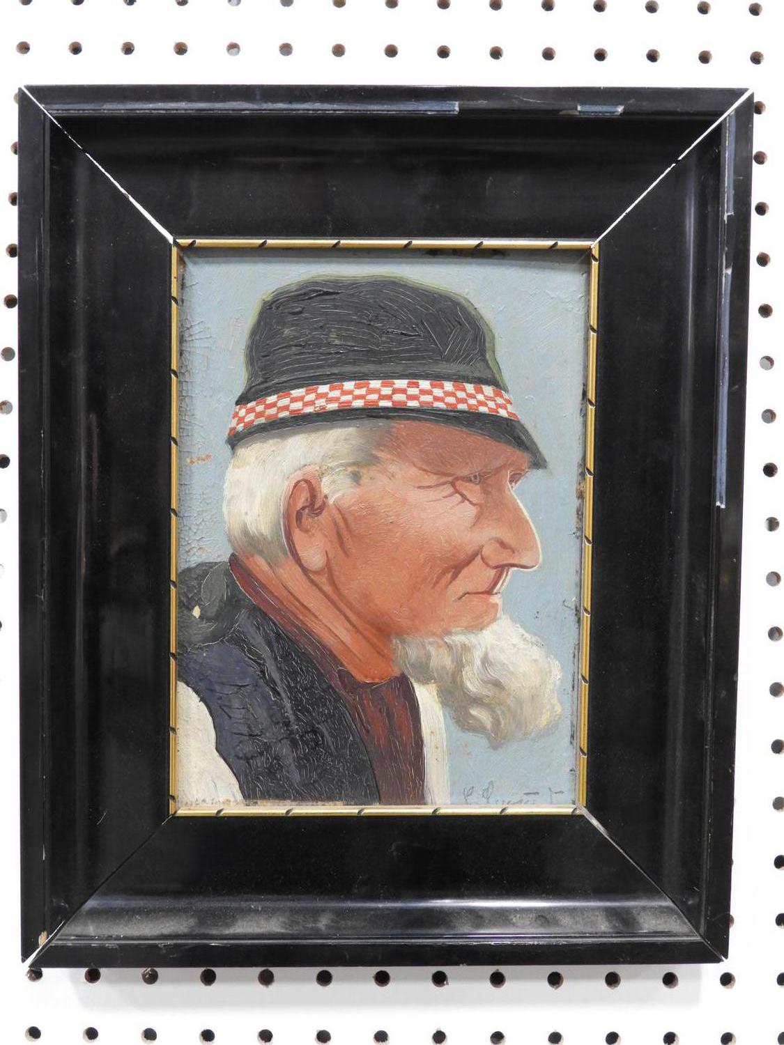 indistinctly signed, oil on board, 7 1/2" x 6 1/2", "portrait of a swiss climber"
