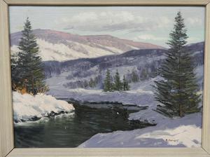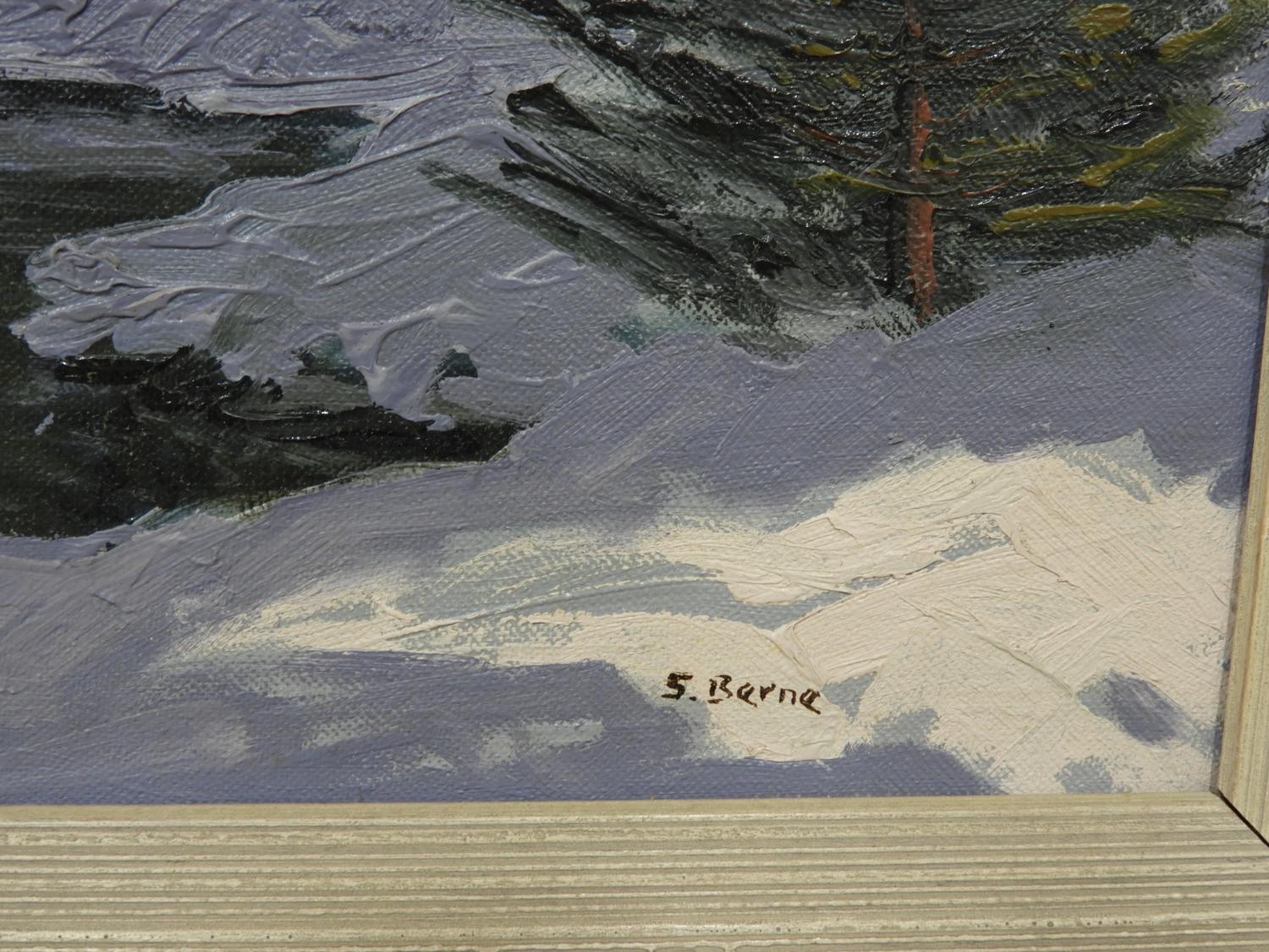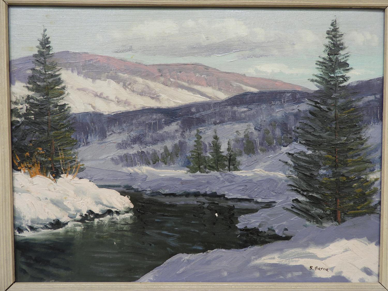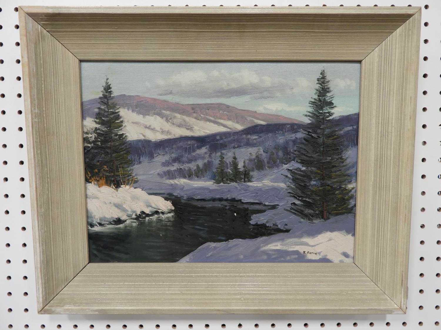 sydney berne(1921-2013), oil on board, 12" x 16", "winter landscape"