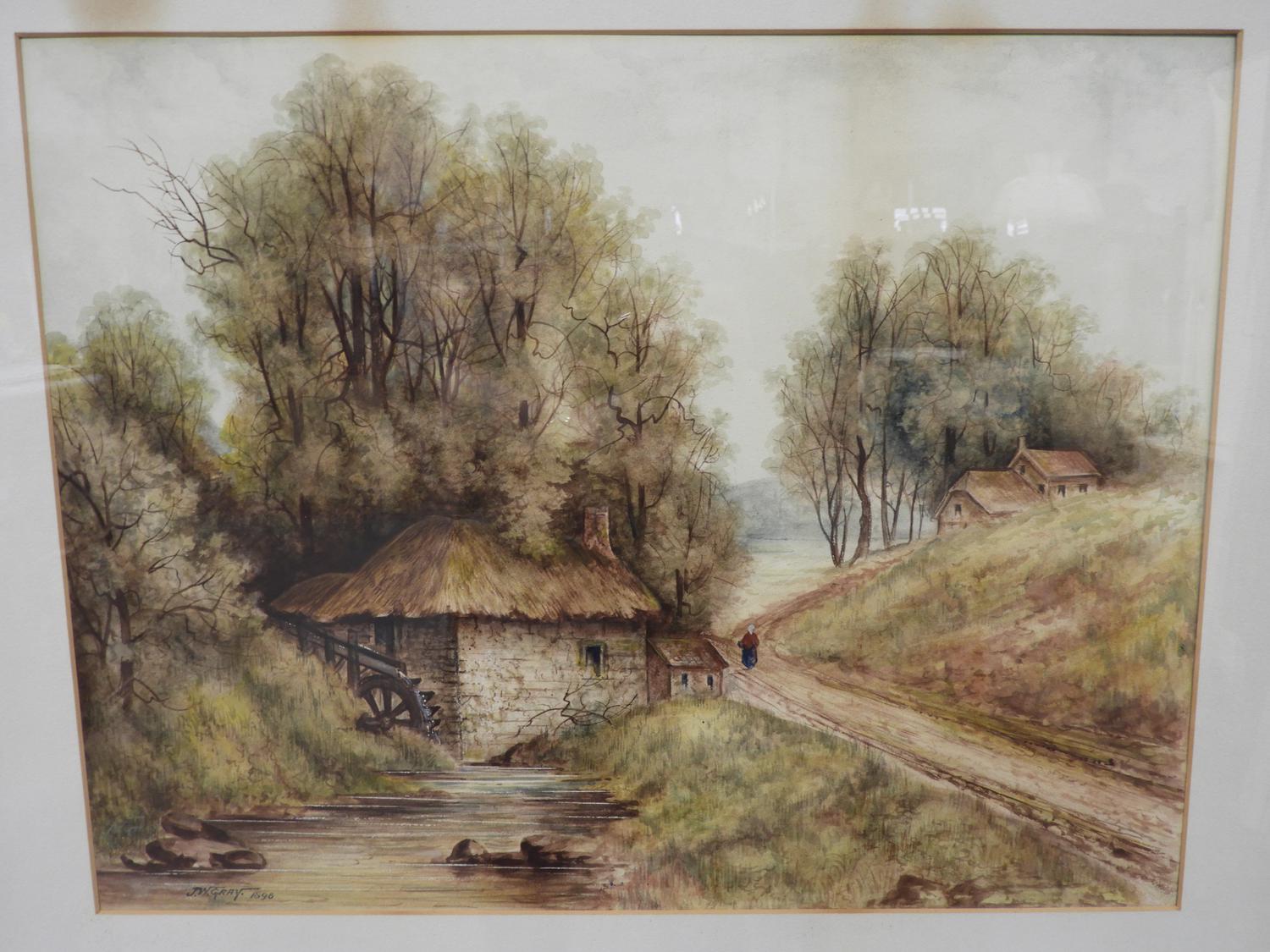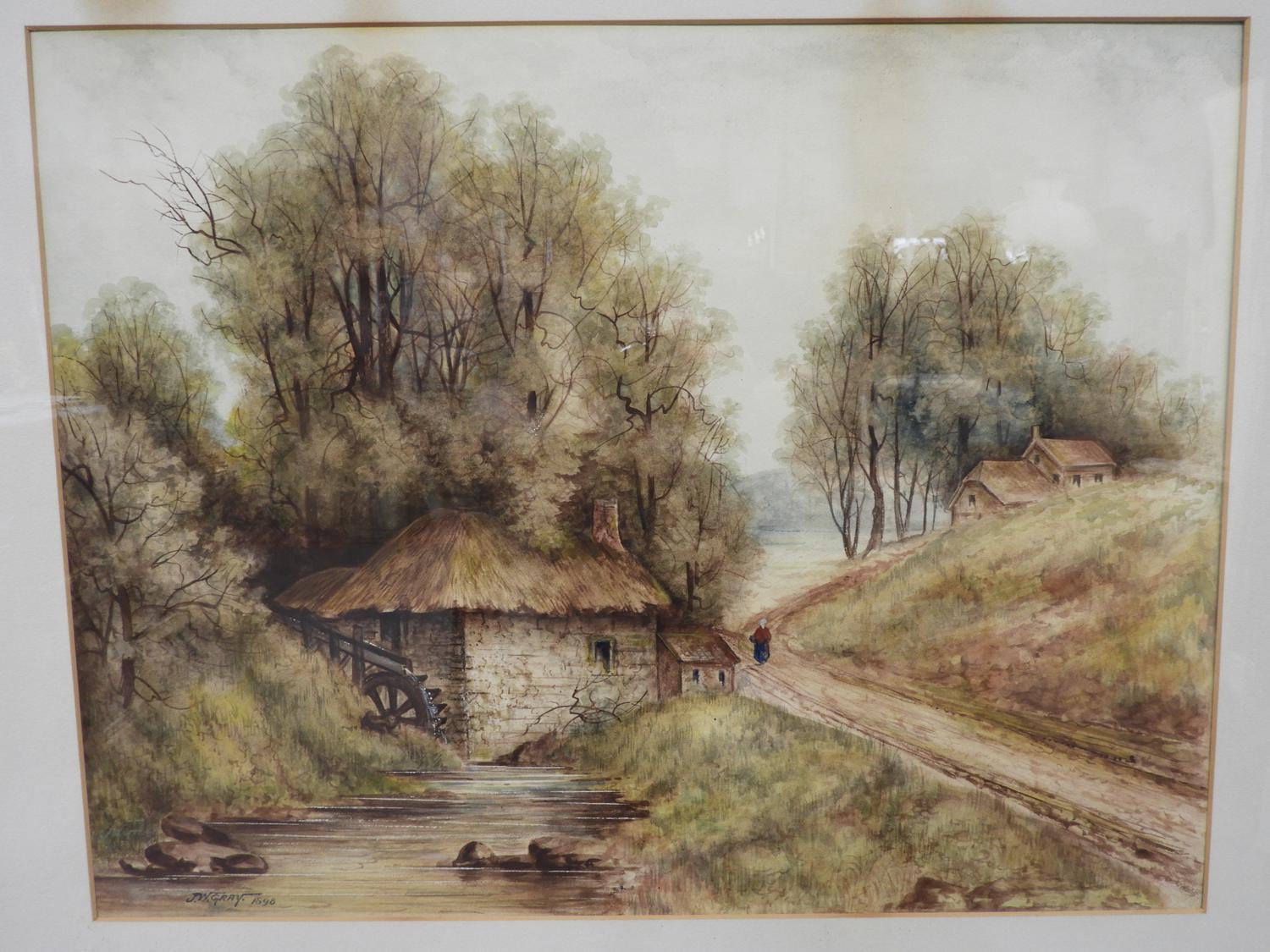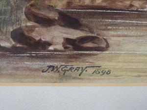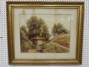 john warren gray (1824-1912), watercolour, 18" x 22 1/2", "landscape with thatched cottage and figure"