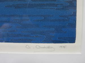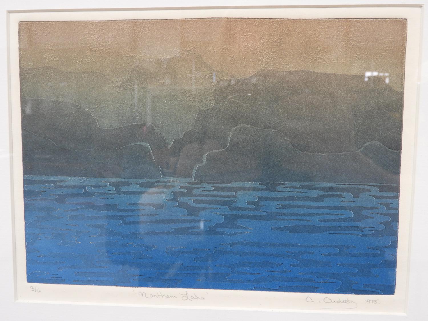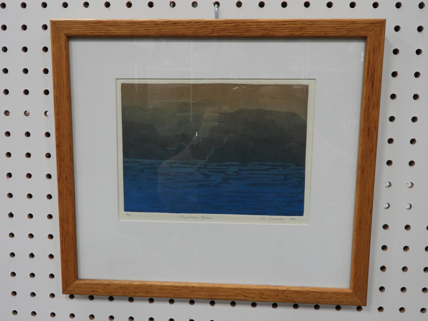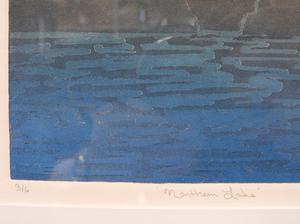 c. outcestry, d.1975, woodblock print #3/6, 6 1/2" x 8 1/4", "mountain lake"