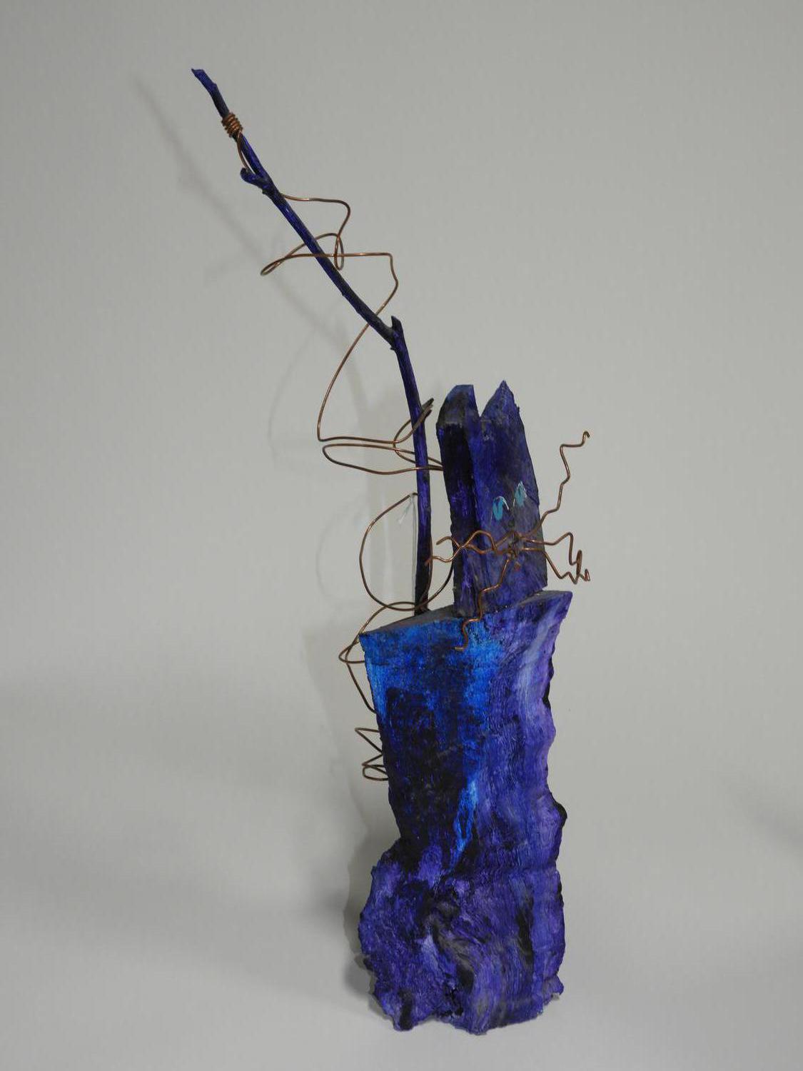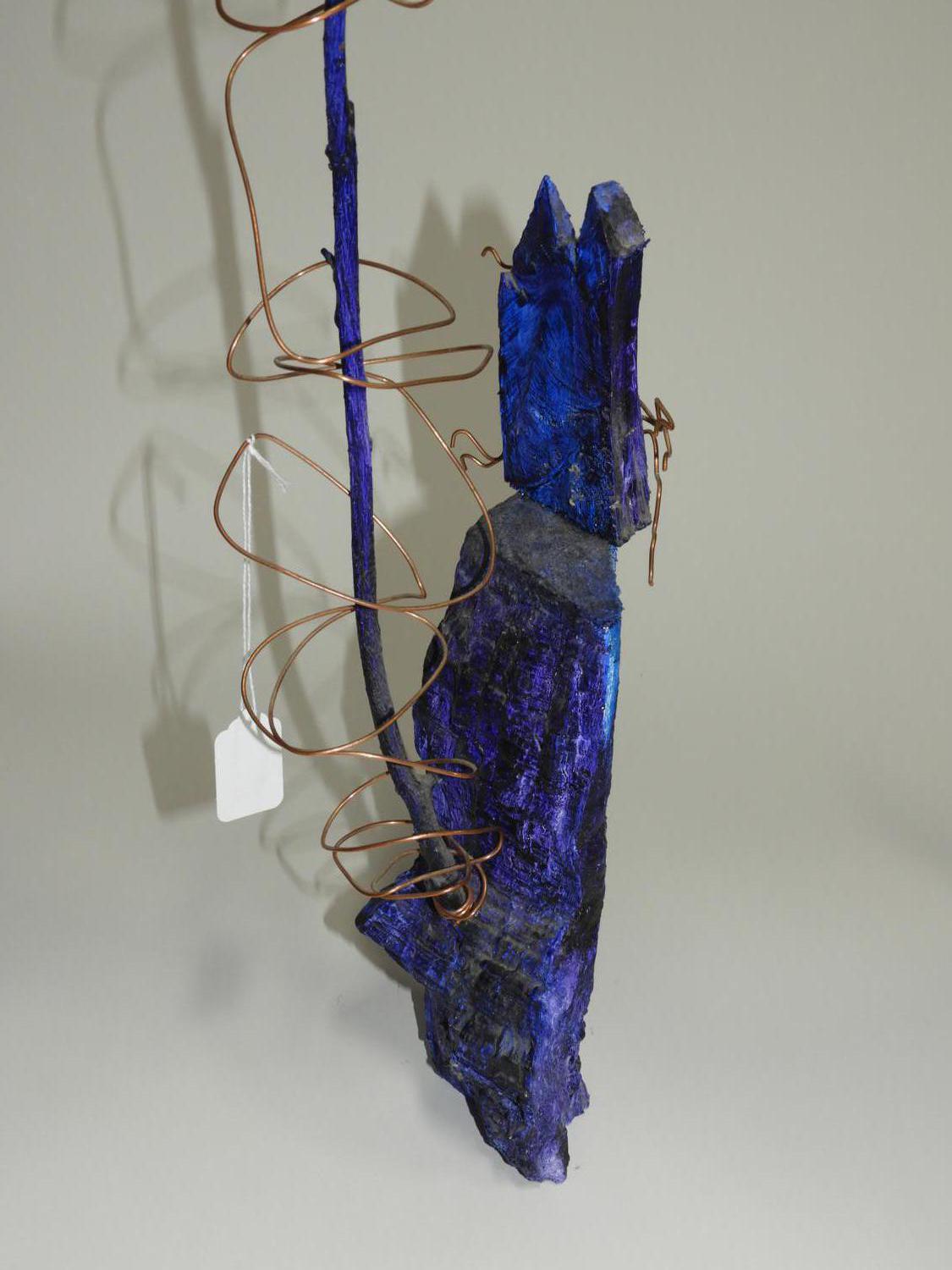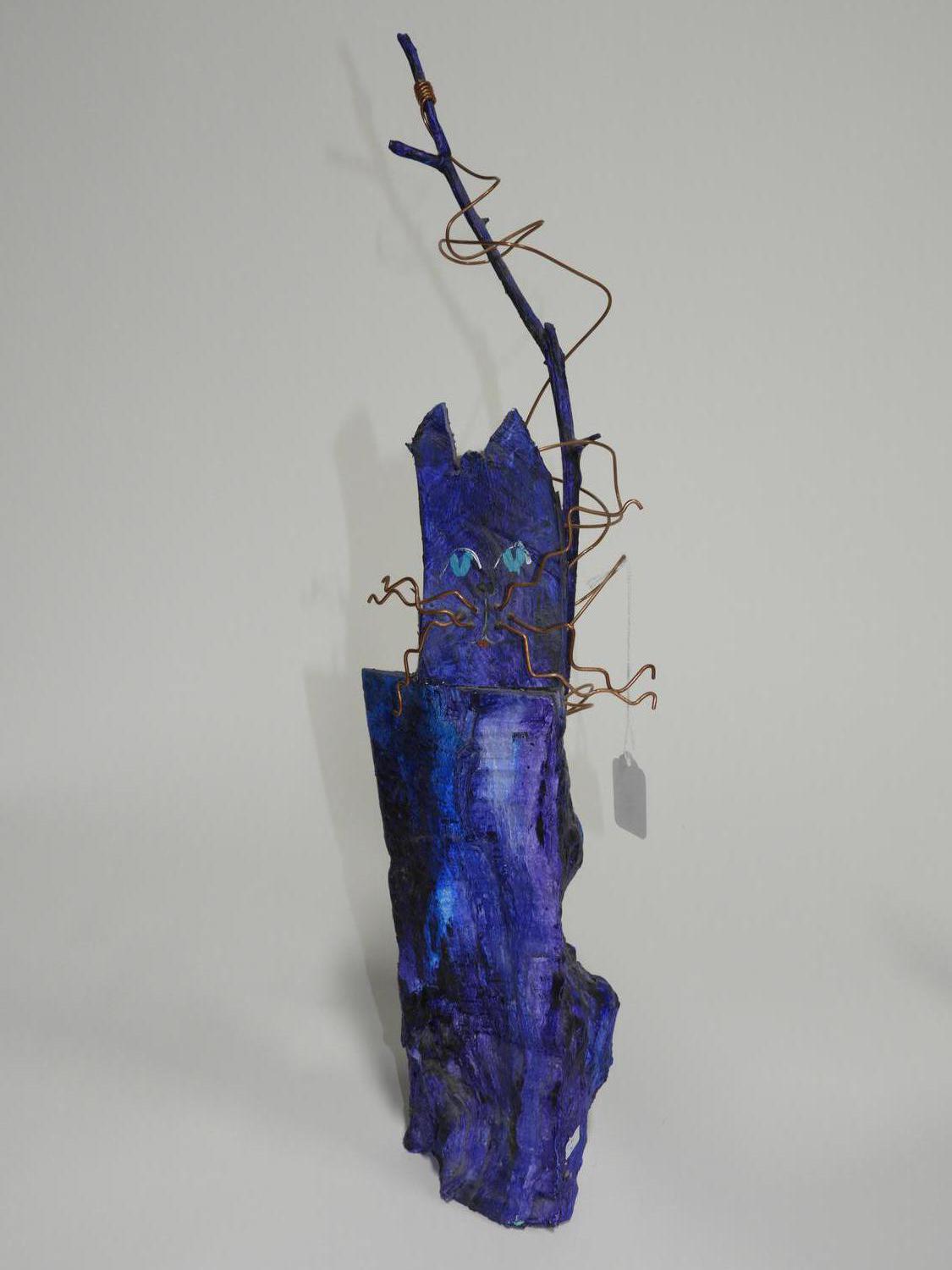 unsigned painted wood sculpture, 22 1/2" x 5", "purple cat with copper whiskers"