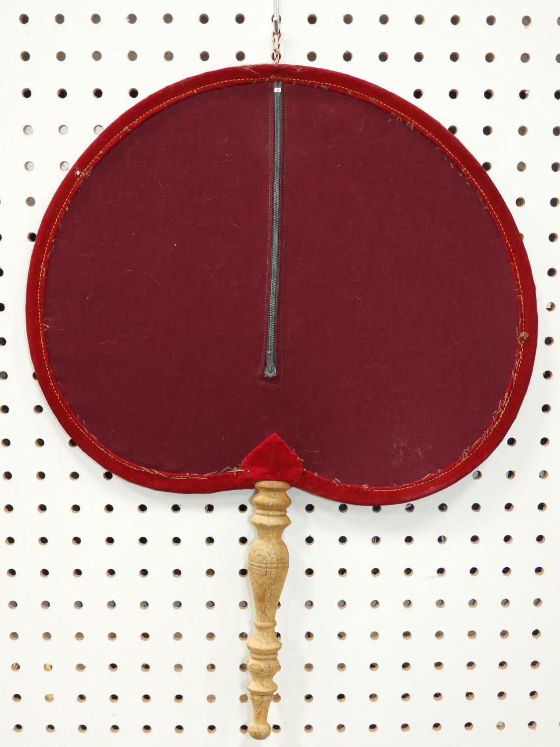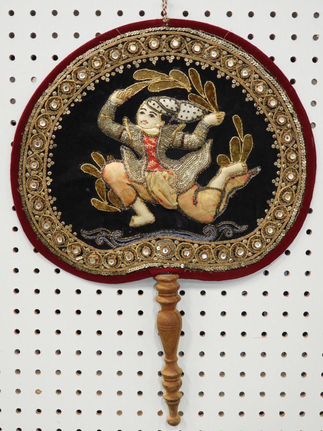 south asian metallic thread embroidered pictoral fan, 14 1/4" x 14 1/4"