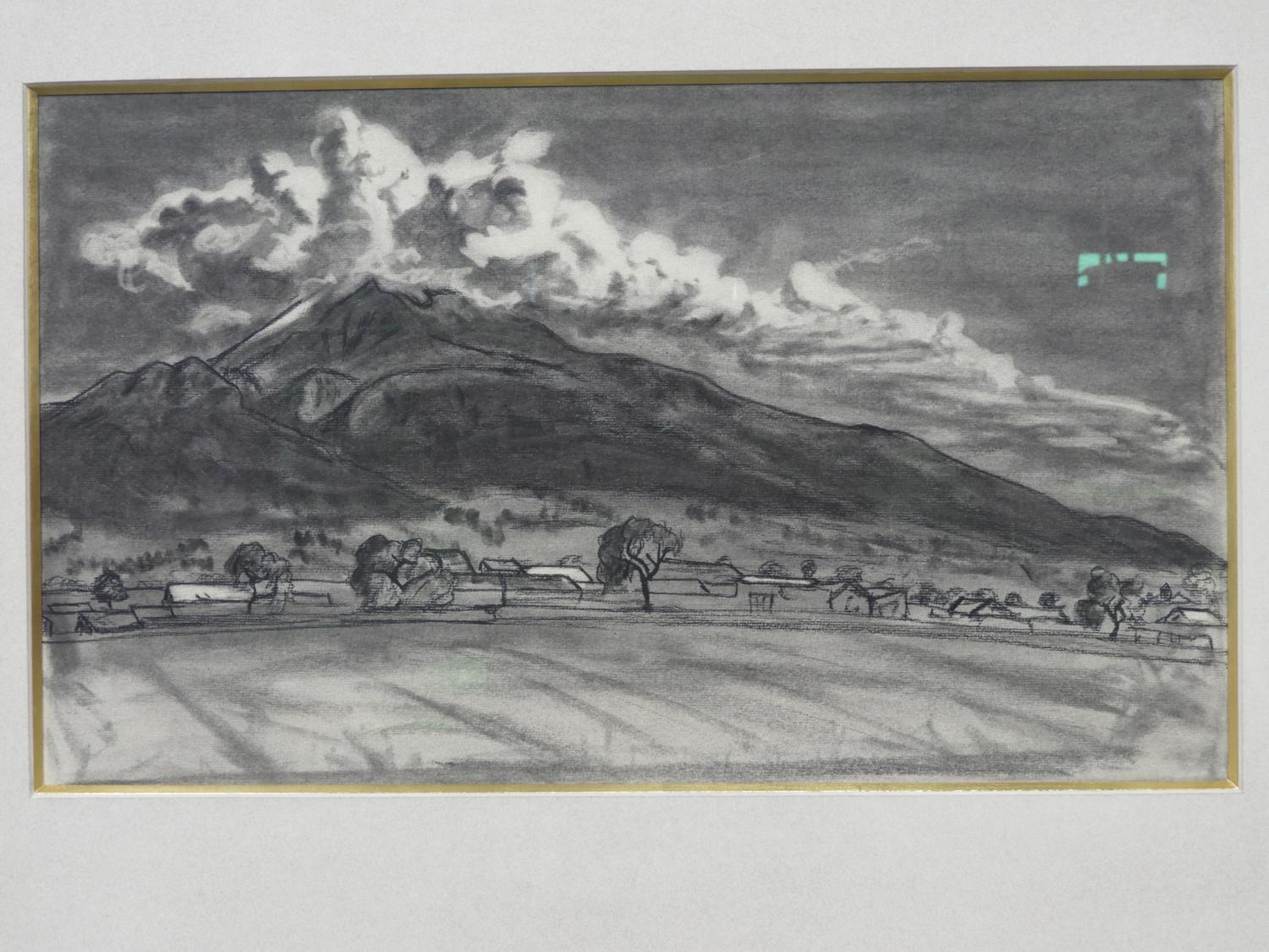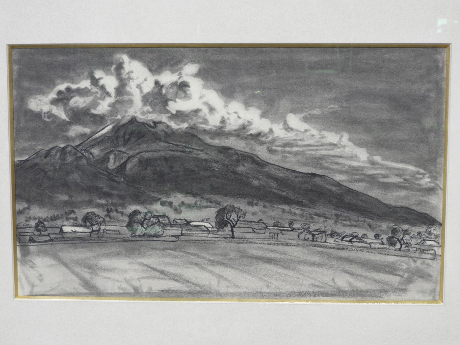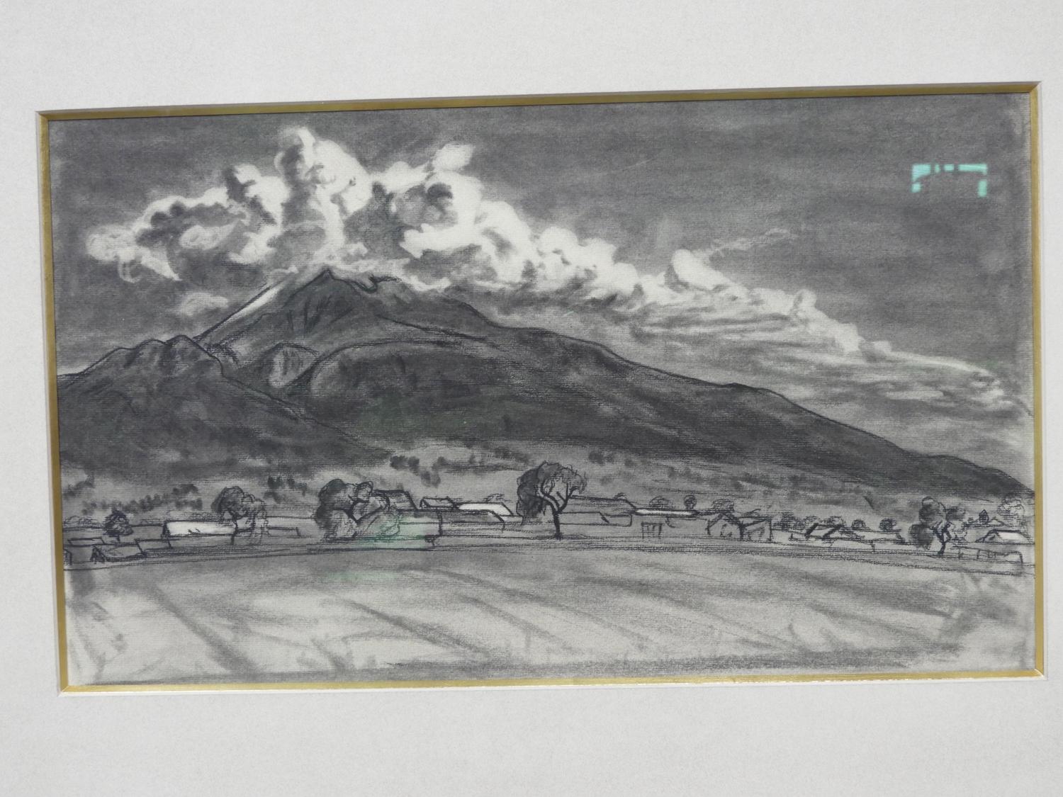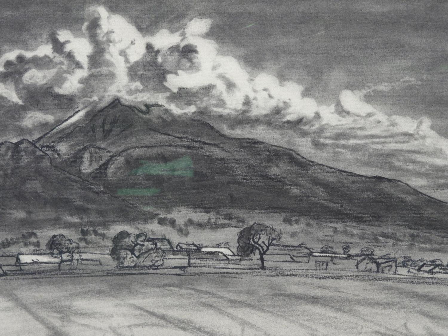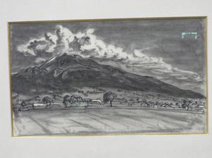 unsigned, charcoal drawing, 10" x 10 1/2", "mountain landscape"
