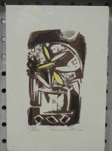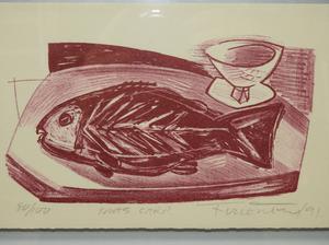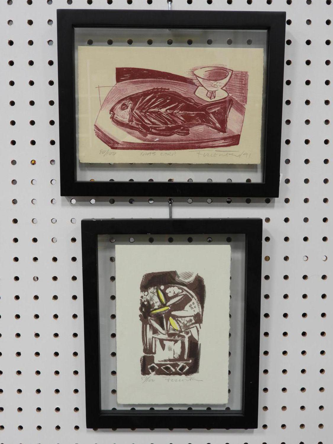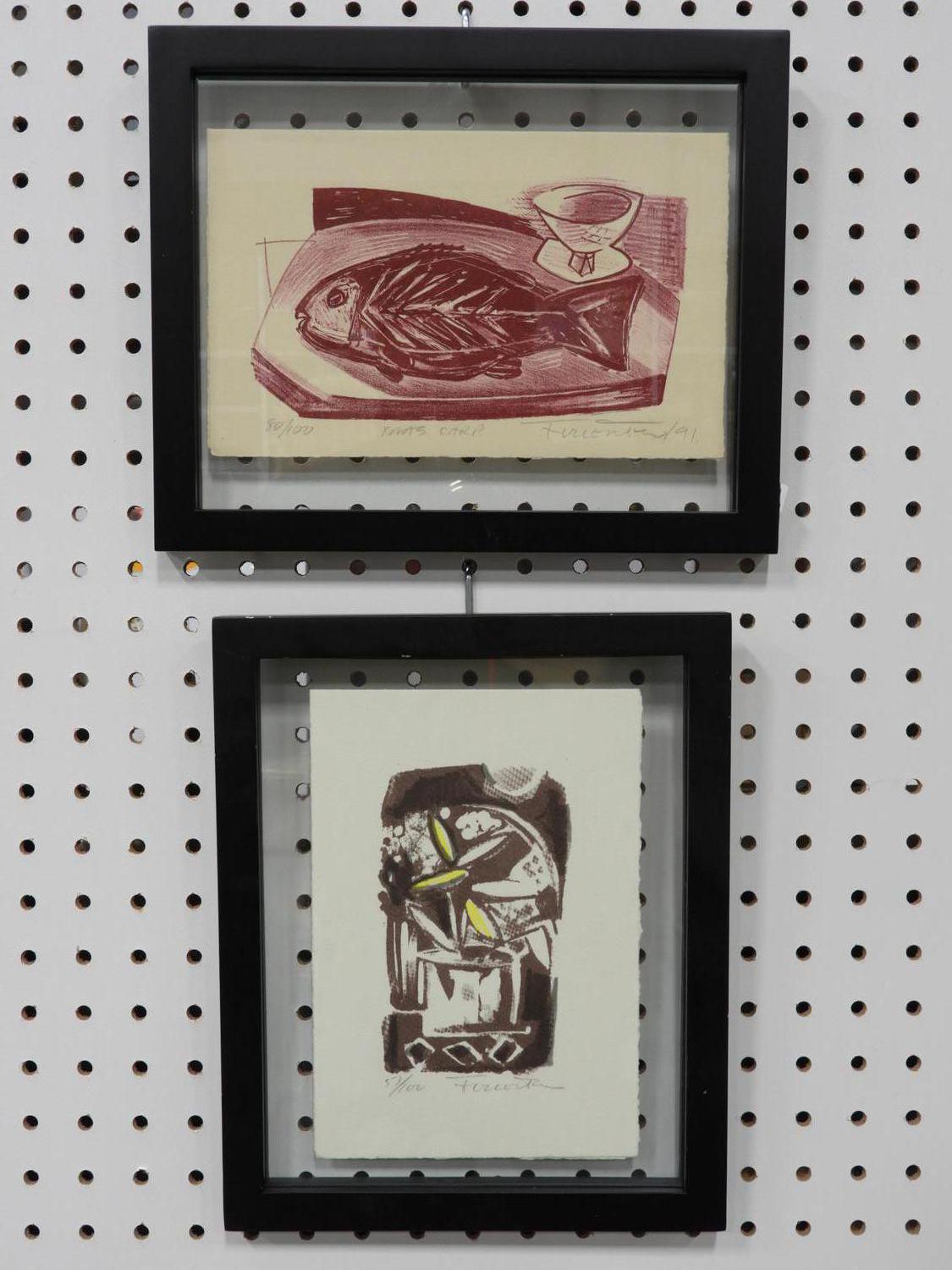 indistinctly signed two woodblock prints, 8 1/2" x 5 1/2", "xmas card", "still life"