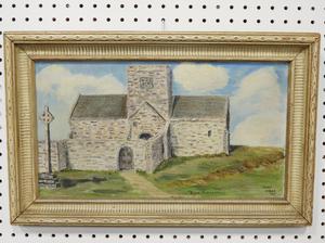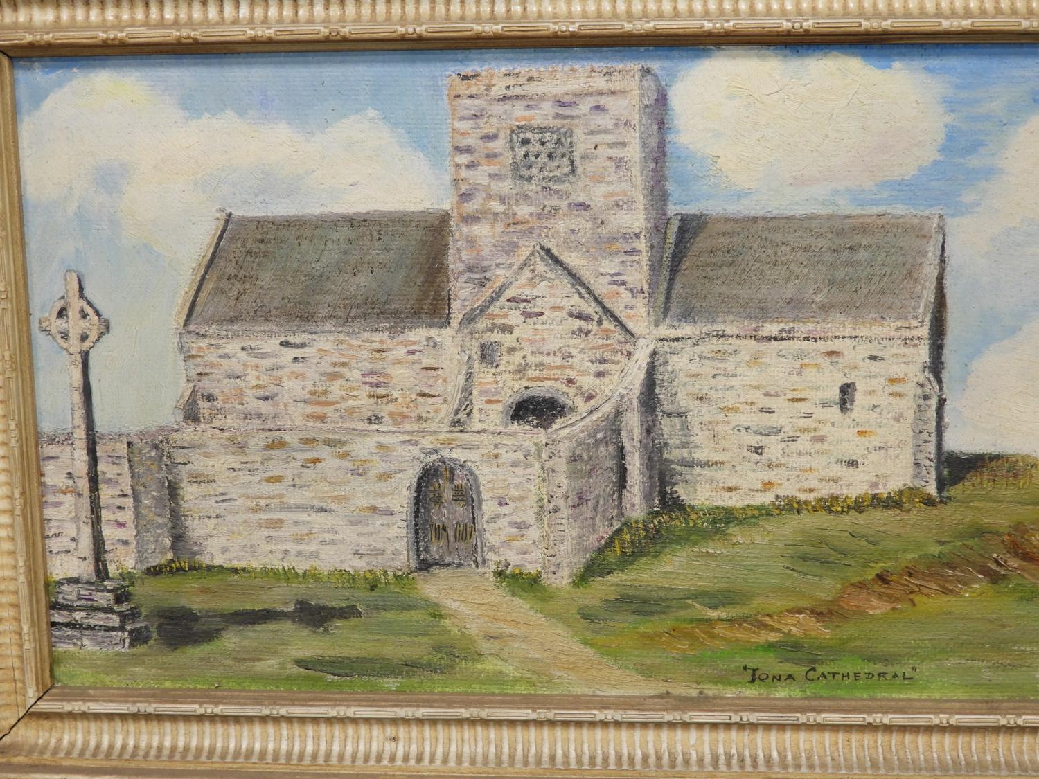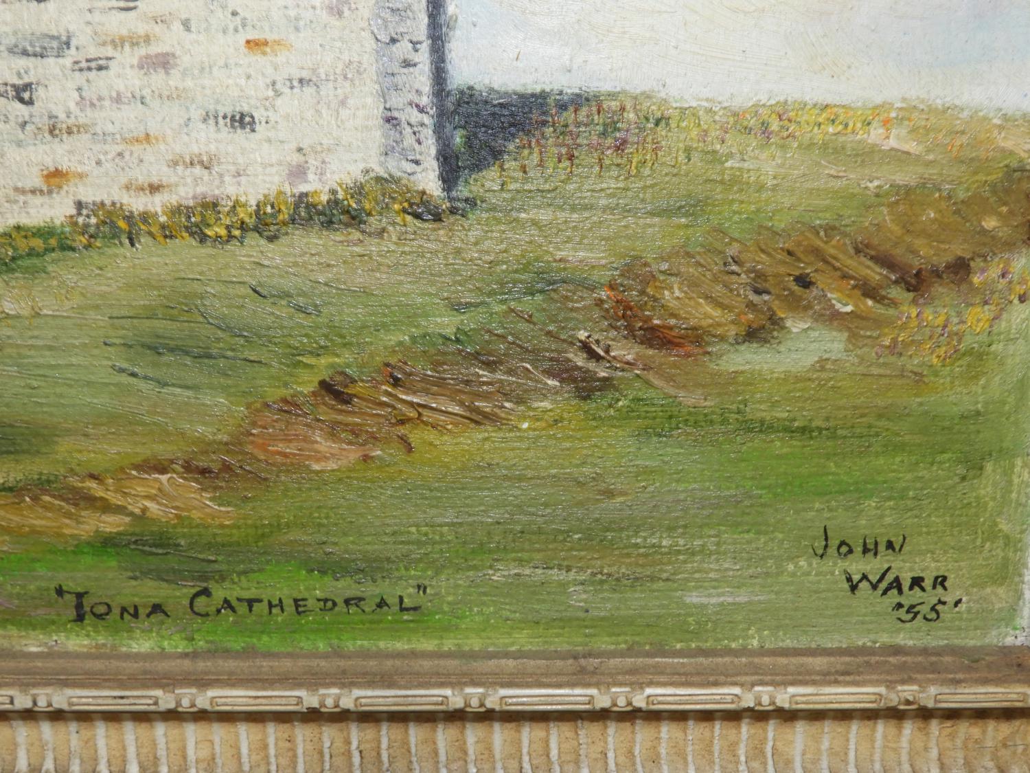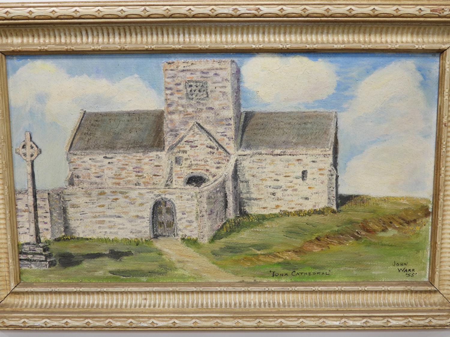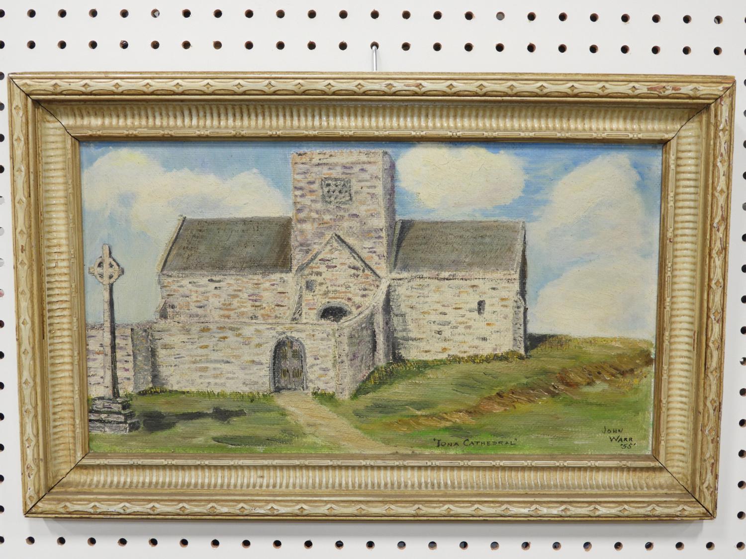 john warr, d. 1955, oil on board, 10" x 17 1/2", "iona cathedral"