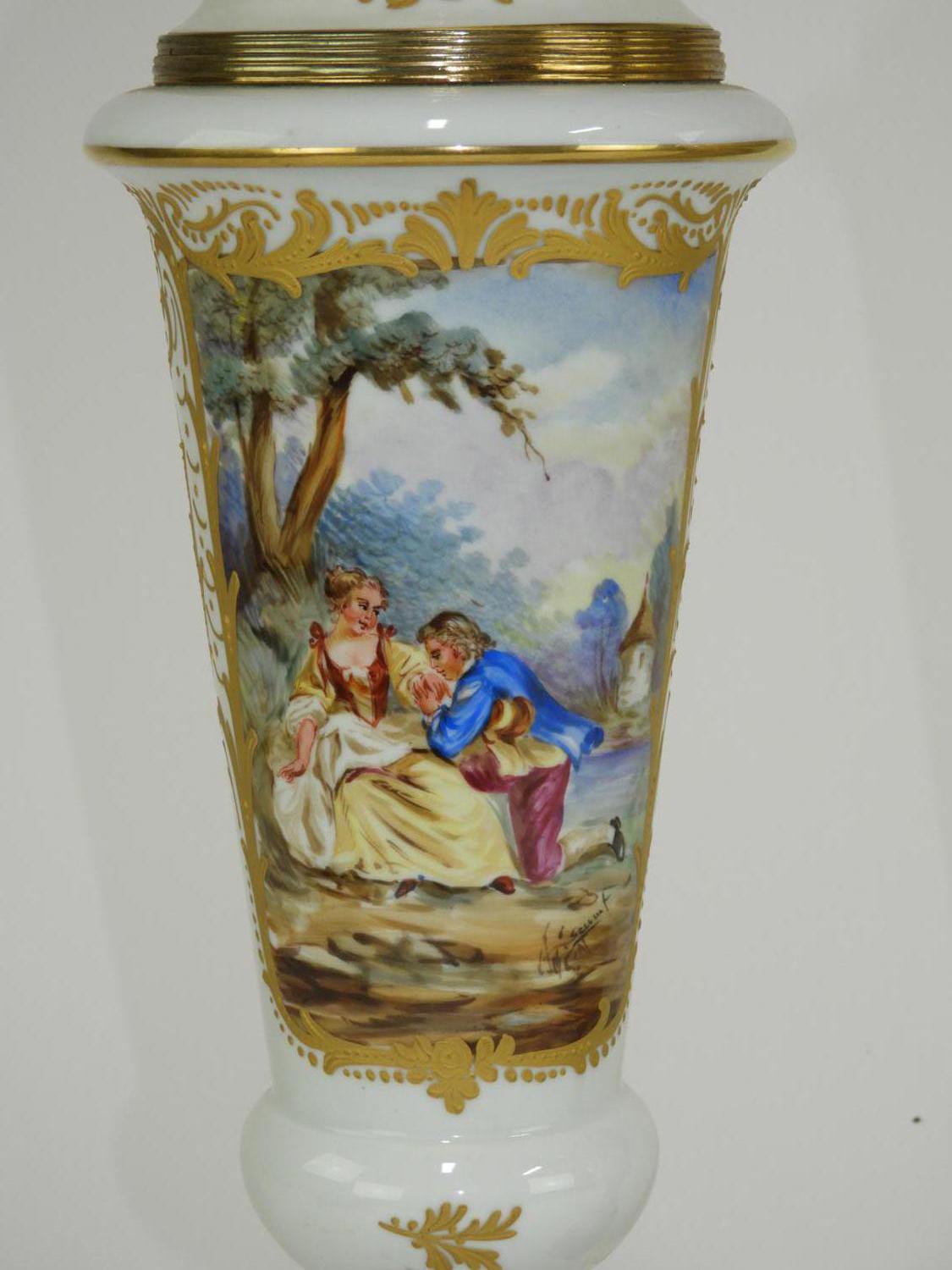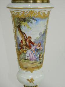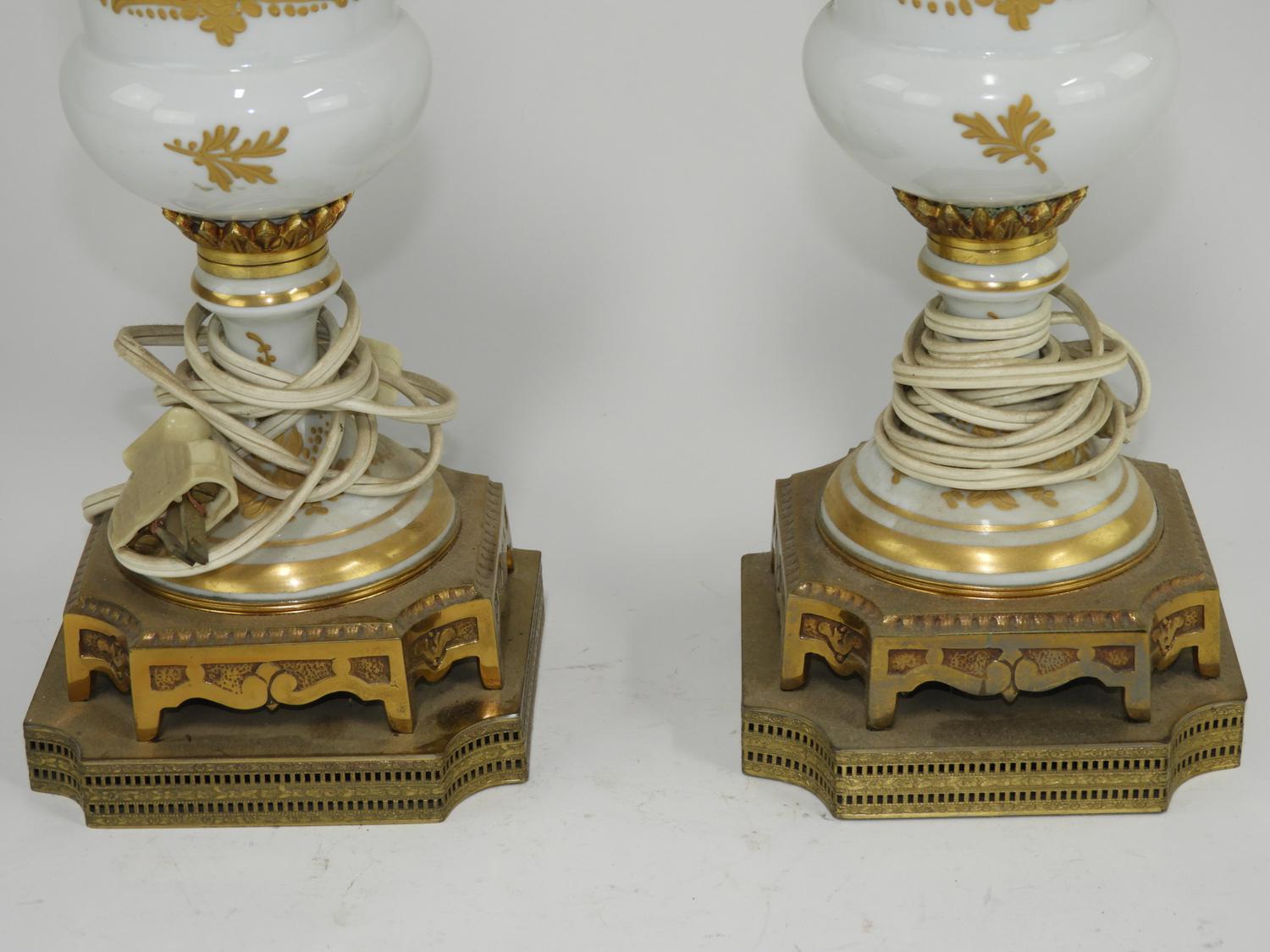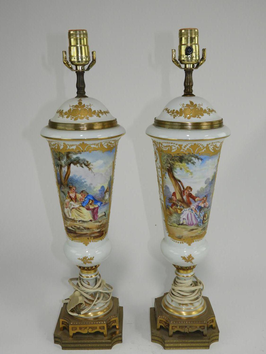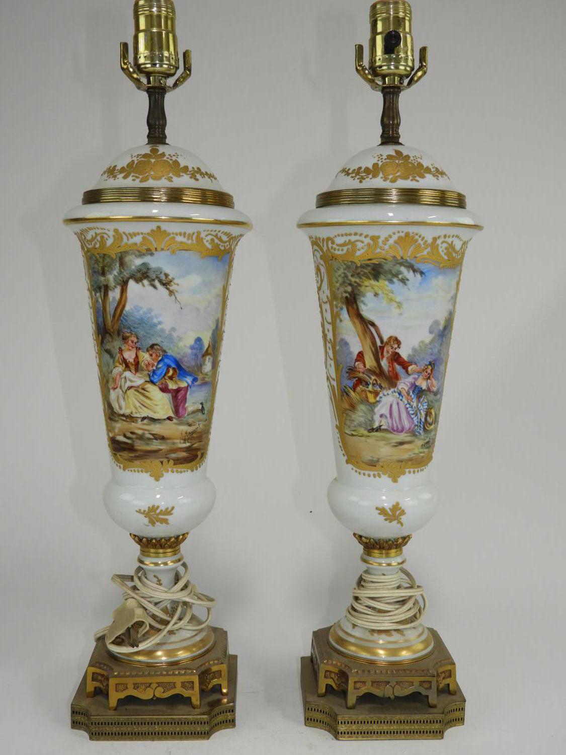 pair of continental porcelain hand painted table lamps with gilt mounts, ht. 22"