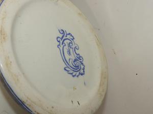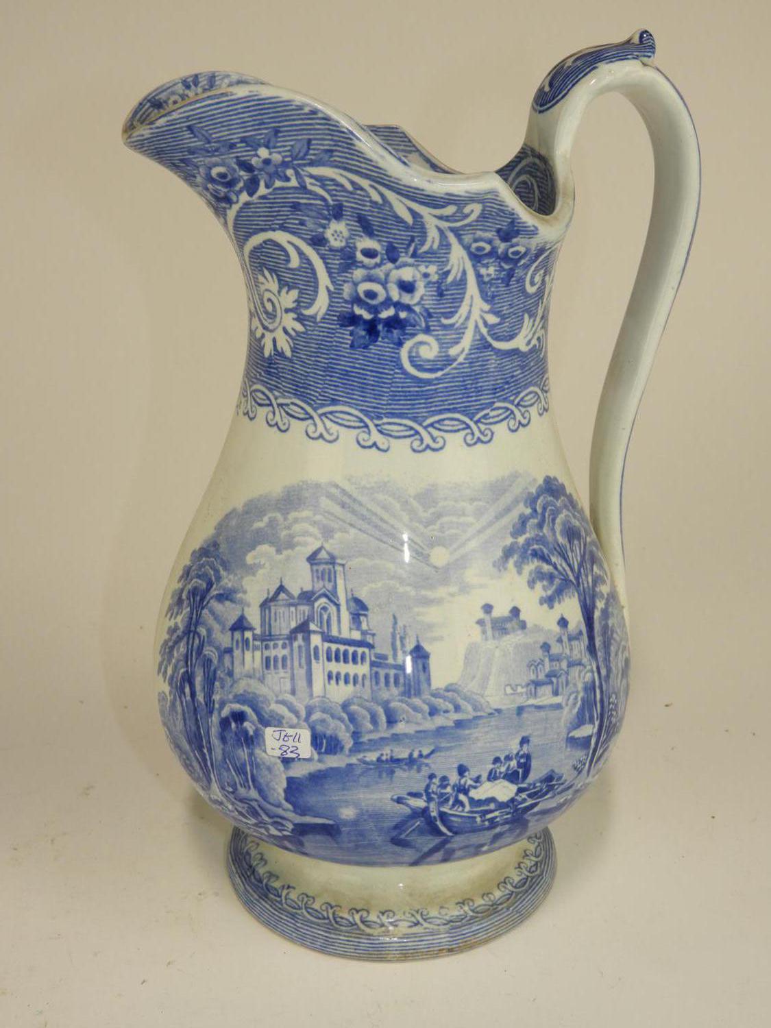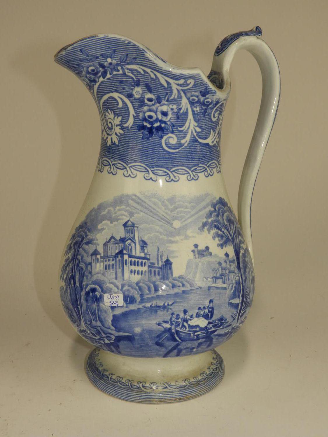 blue and white transfer print pitcher, ht. 12 1/2"