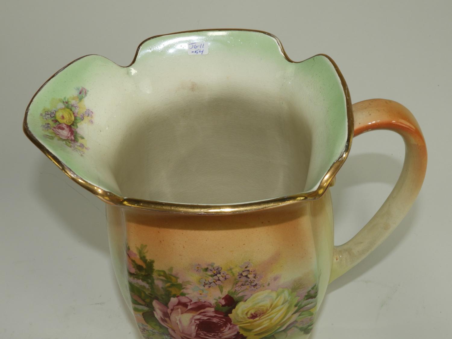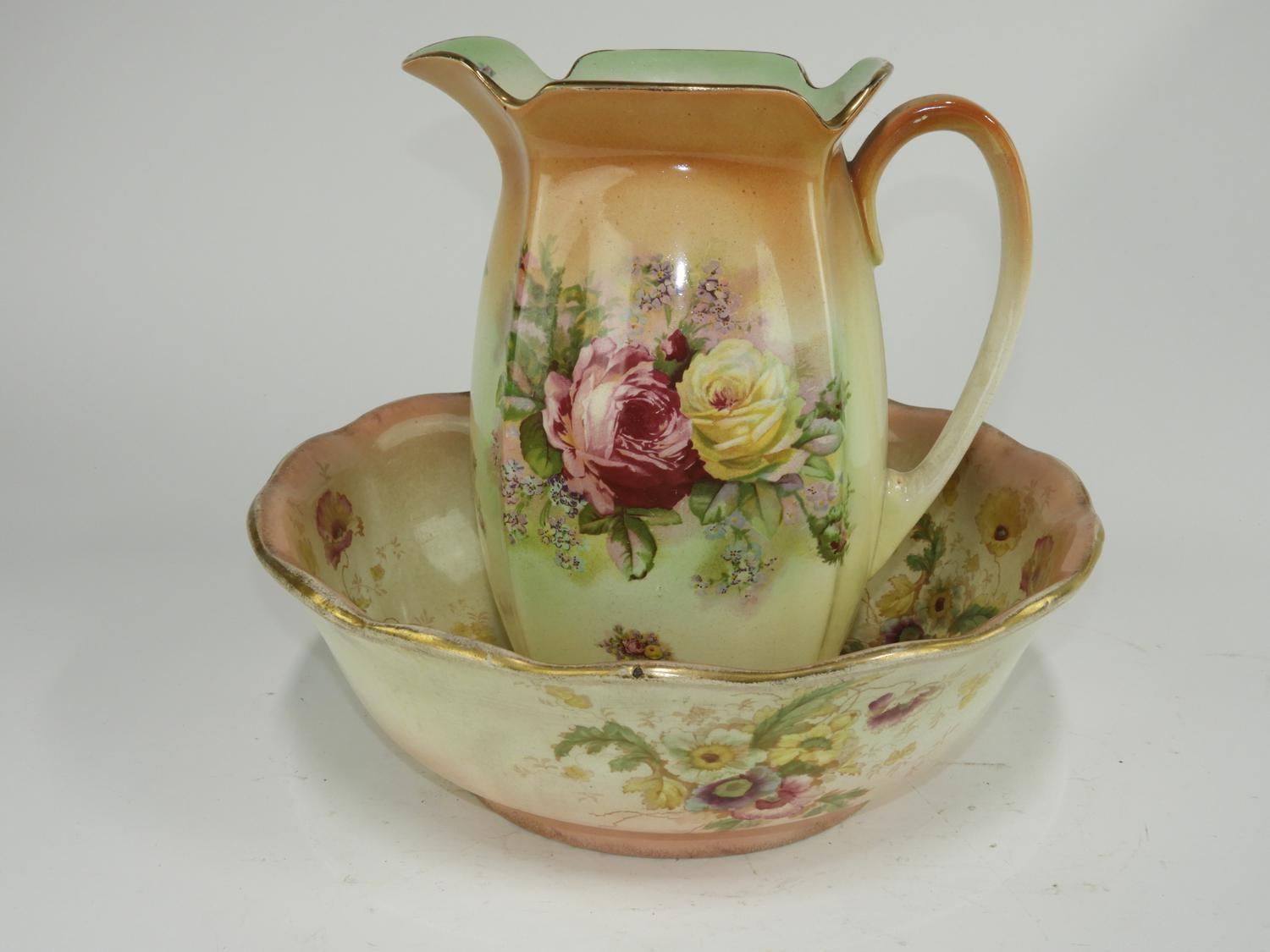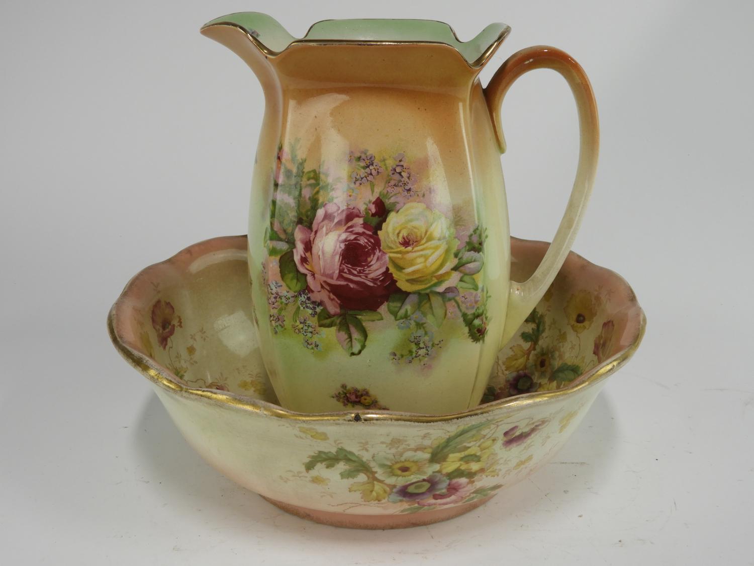 wash basin and pitcher with floral decoration, ht. 12"