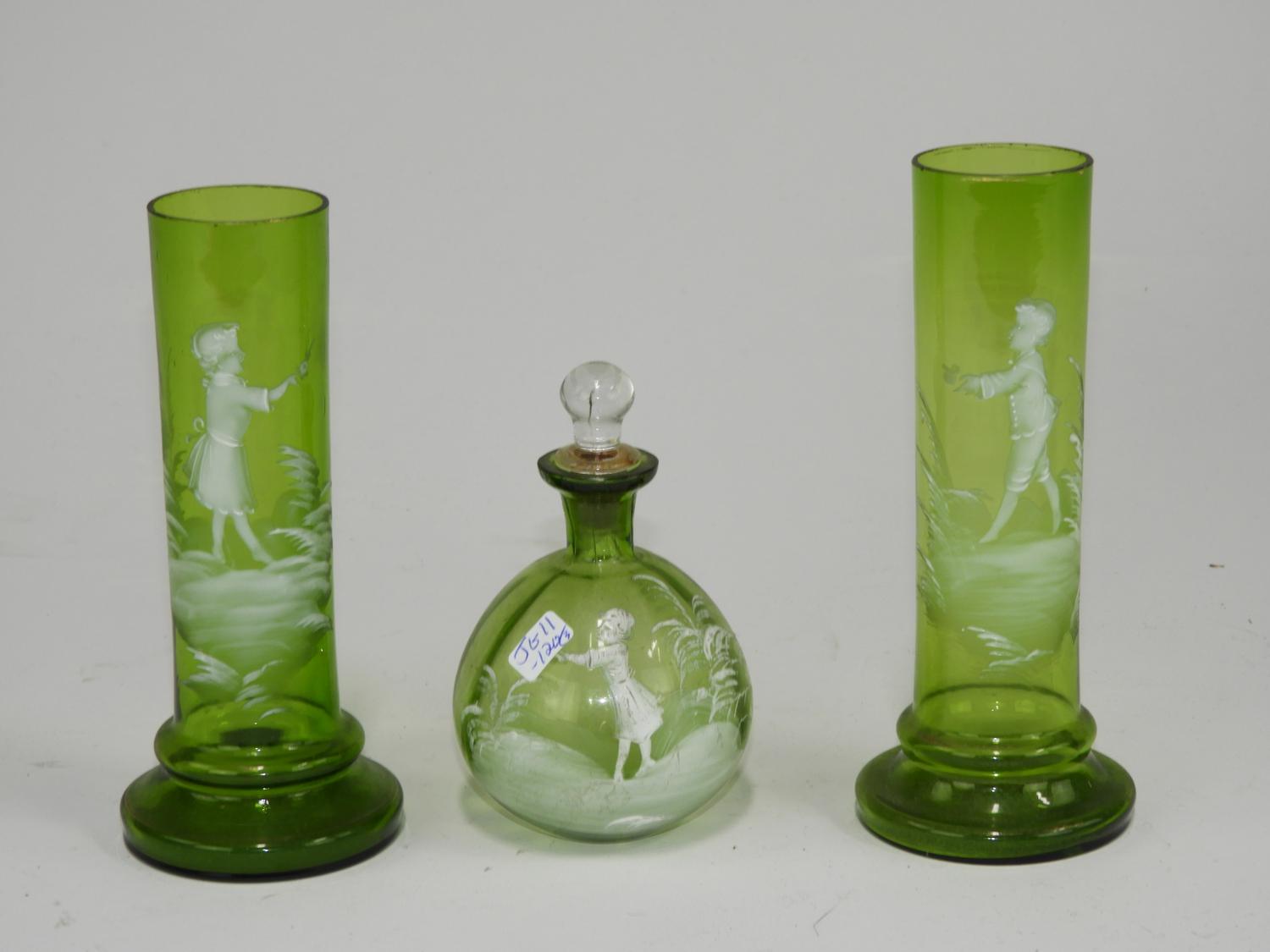 mary gregory green glass bottle and pair of vases, 6 1/2" and smaller