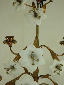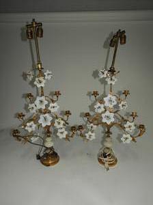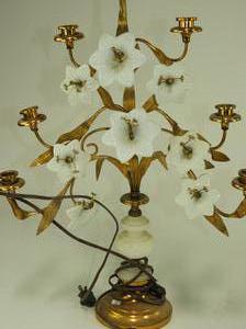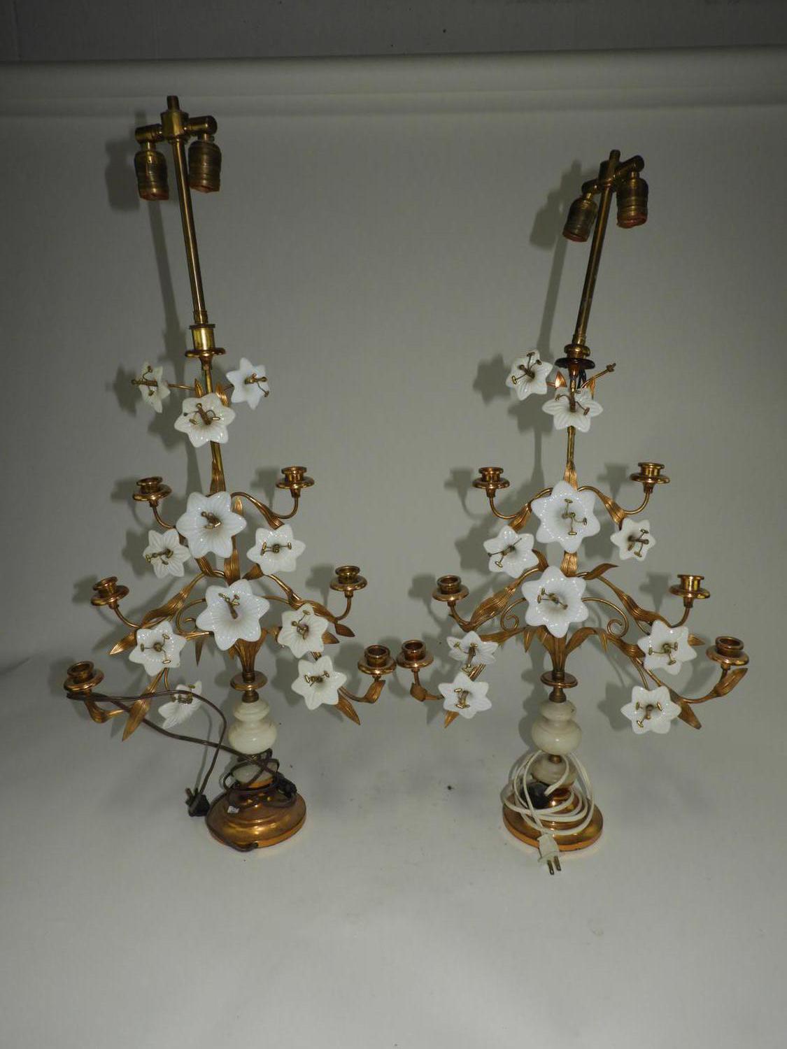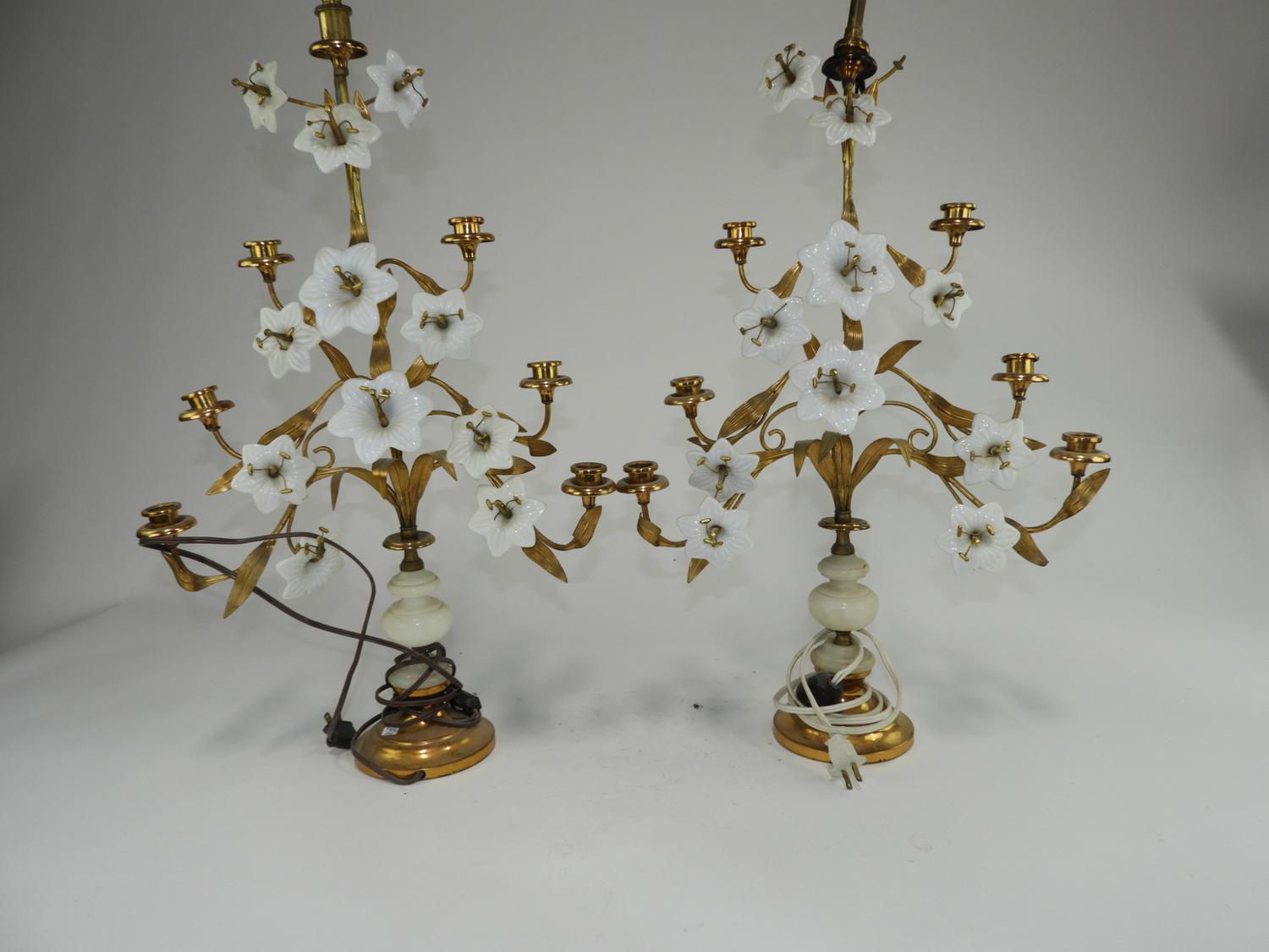 pair of brass and milk glass candelabra, electrified, ht. 35"