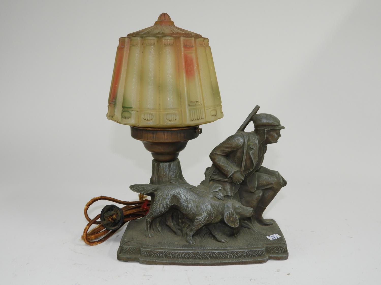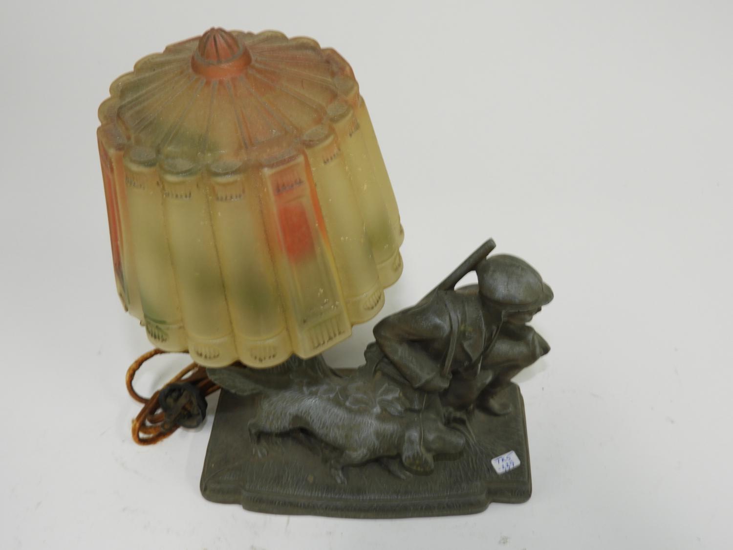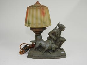 figural hunting motif dresser lamp with glass shade, ht.12"