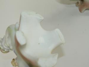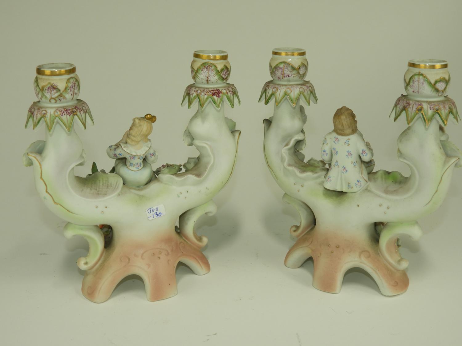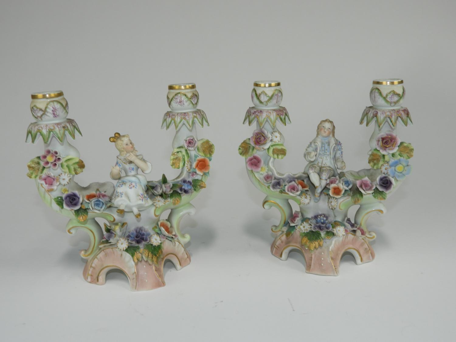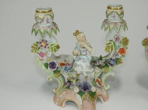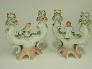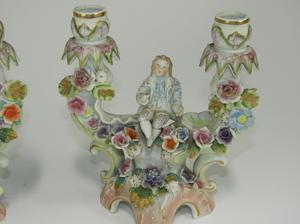 pair of continental style porcelain handpainted figural candlesticks, 8" x 7" x 4"