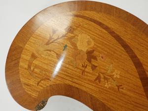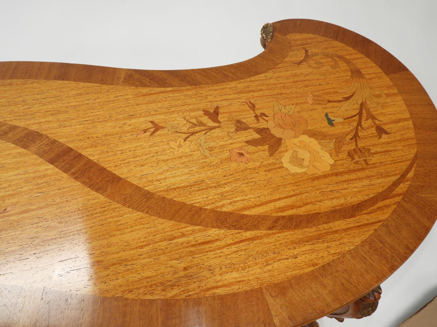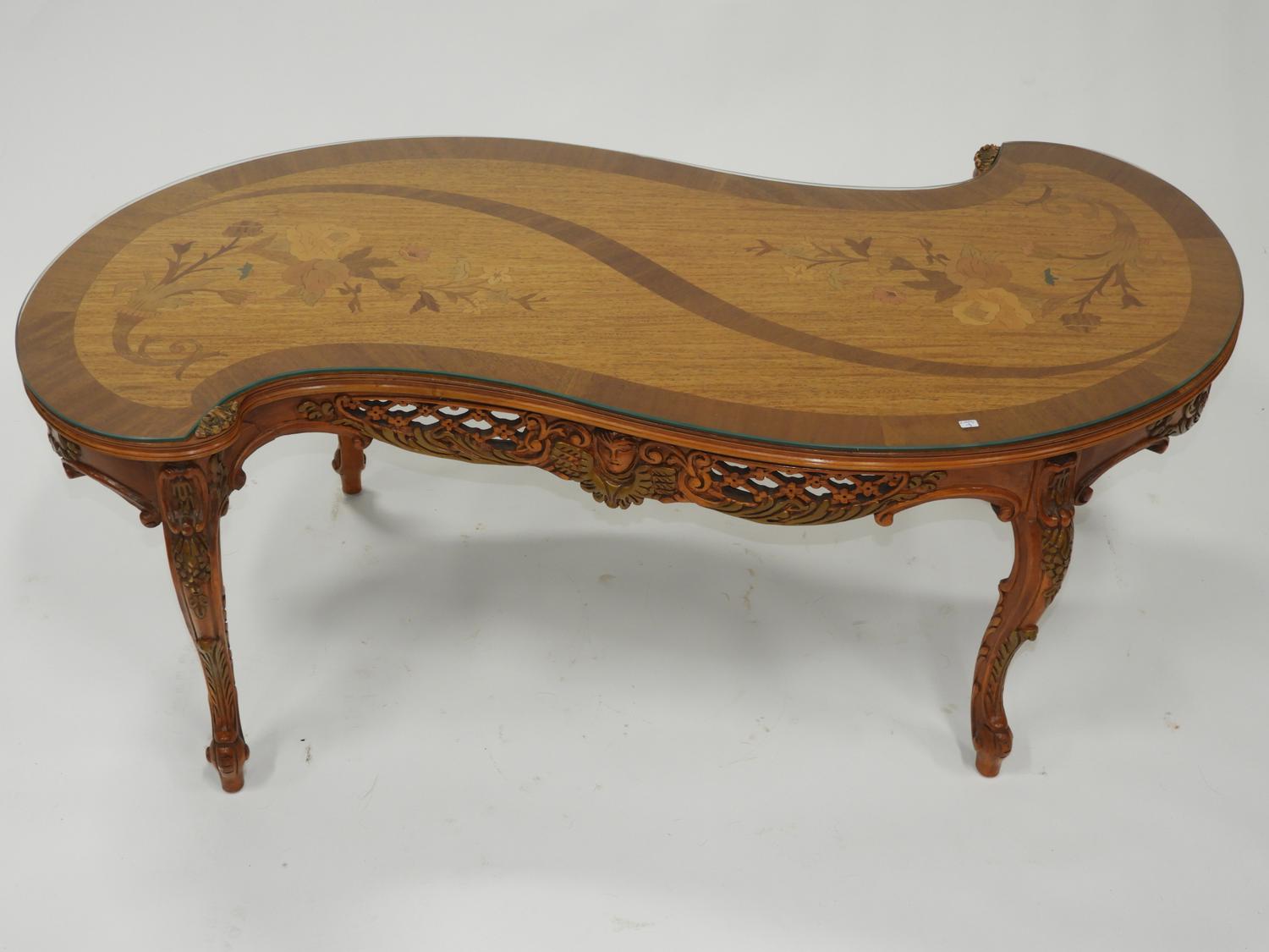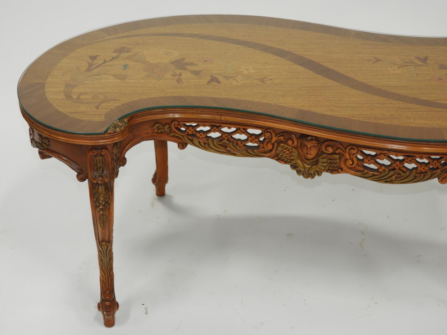 marquetry inlaid kydney shaped coffee table, 18 1/4" x 46" x 23"