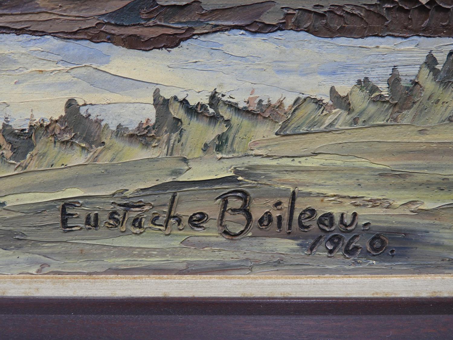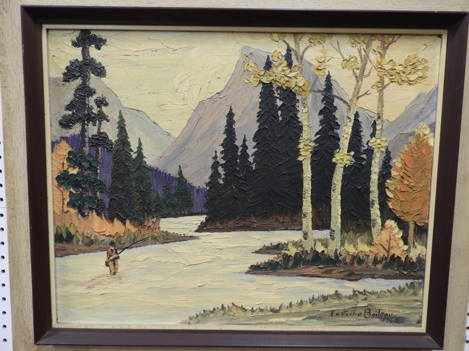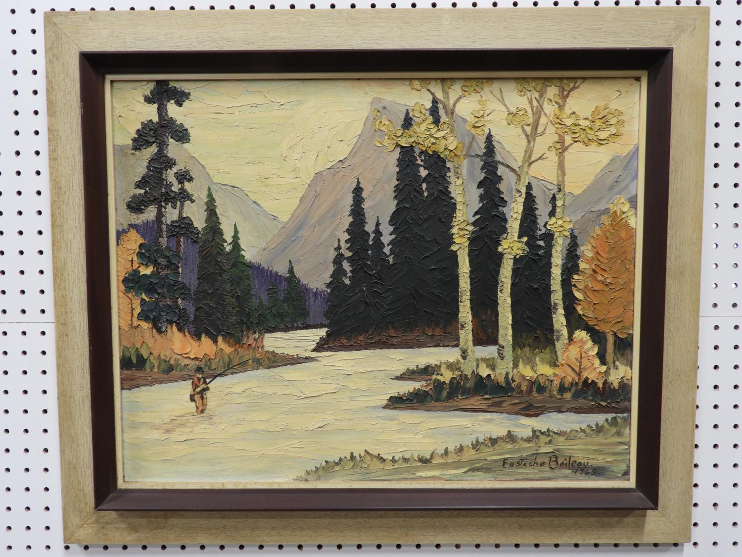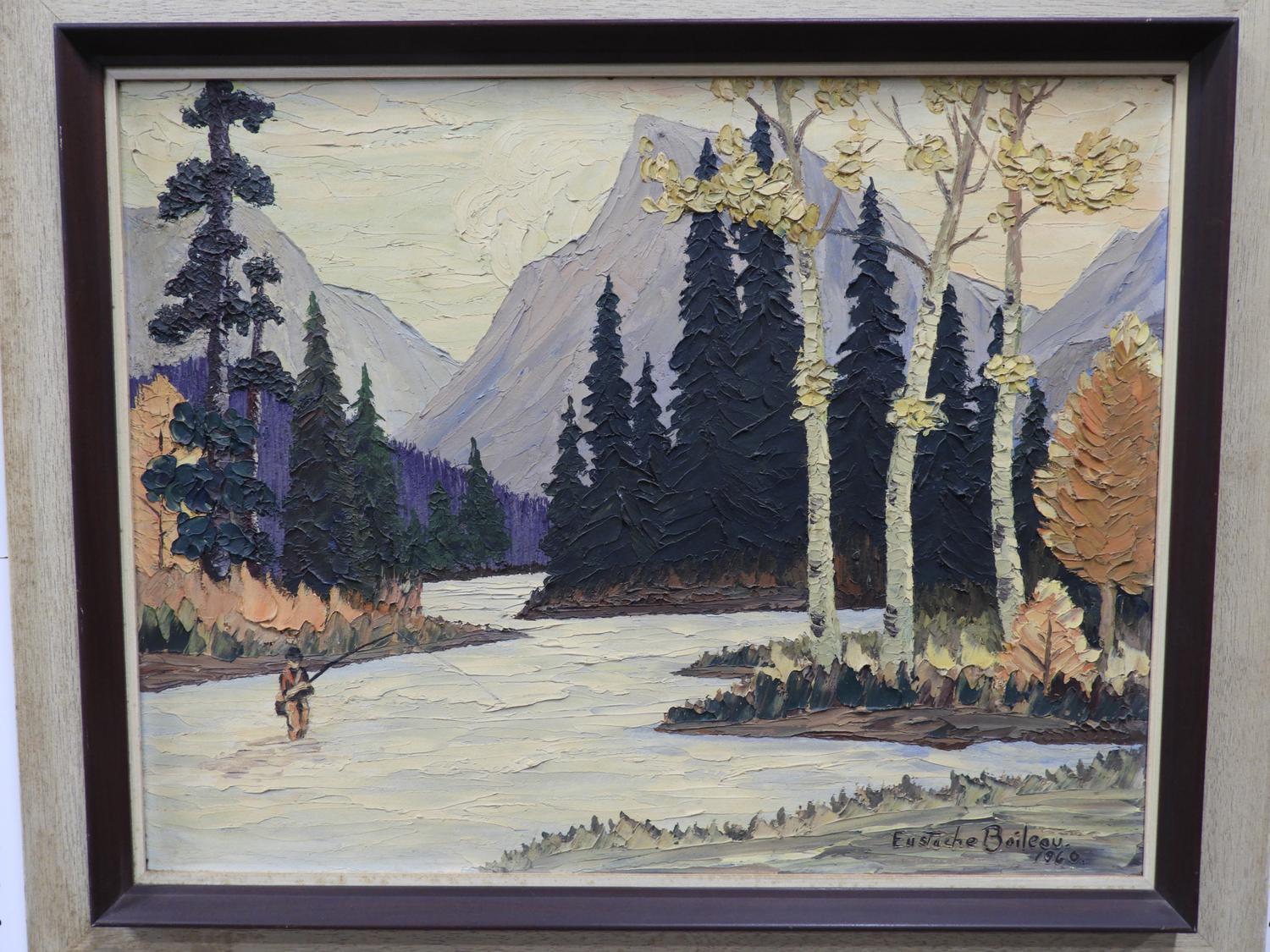 eustache boileau, d. 1960, acrylic on board, 20" x 25", "fly fishing mountain scene"
