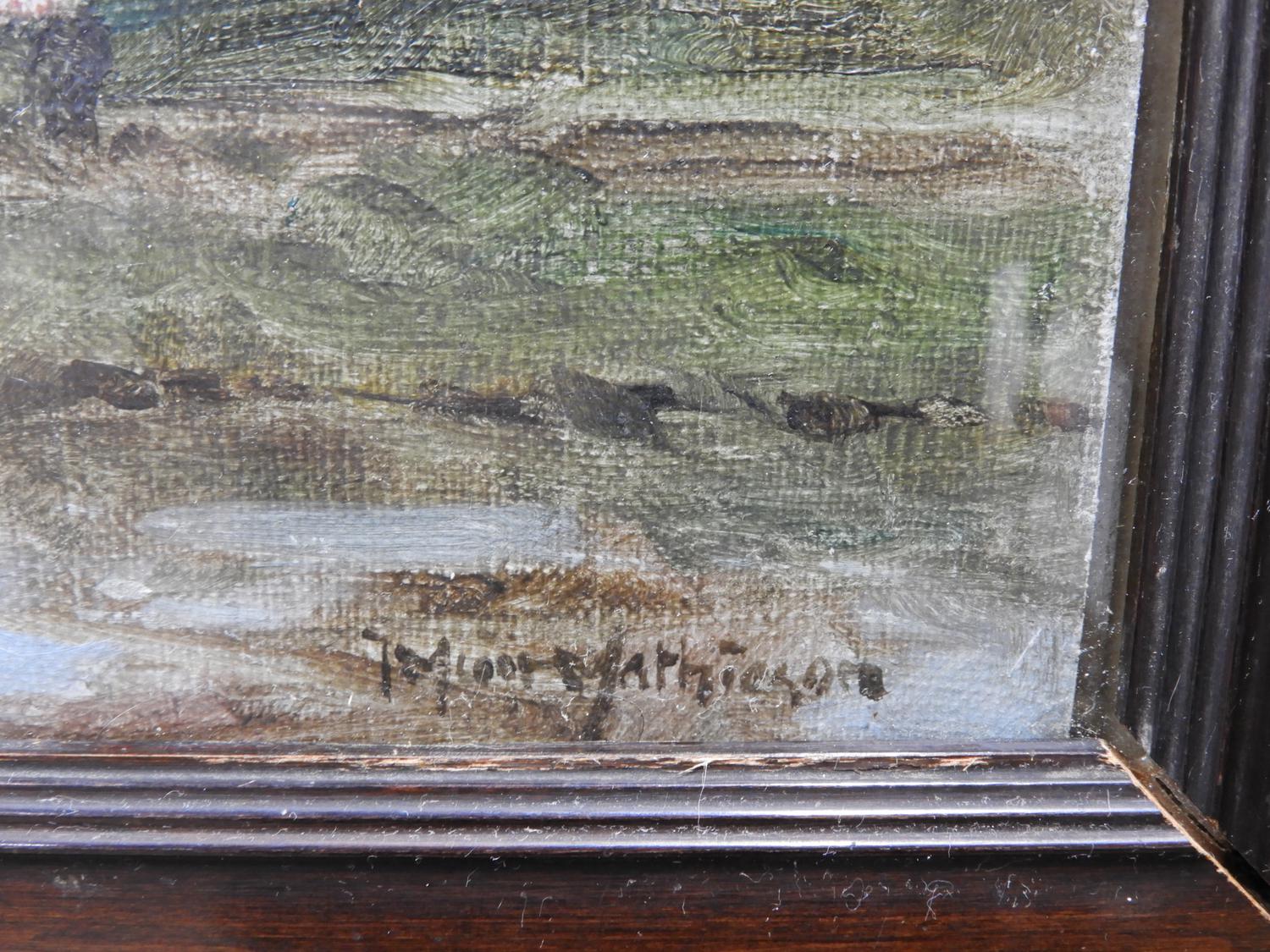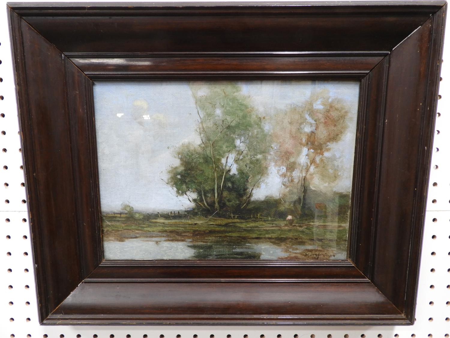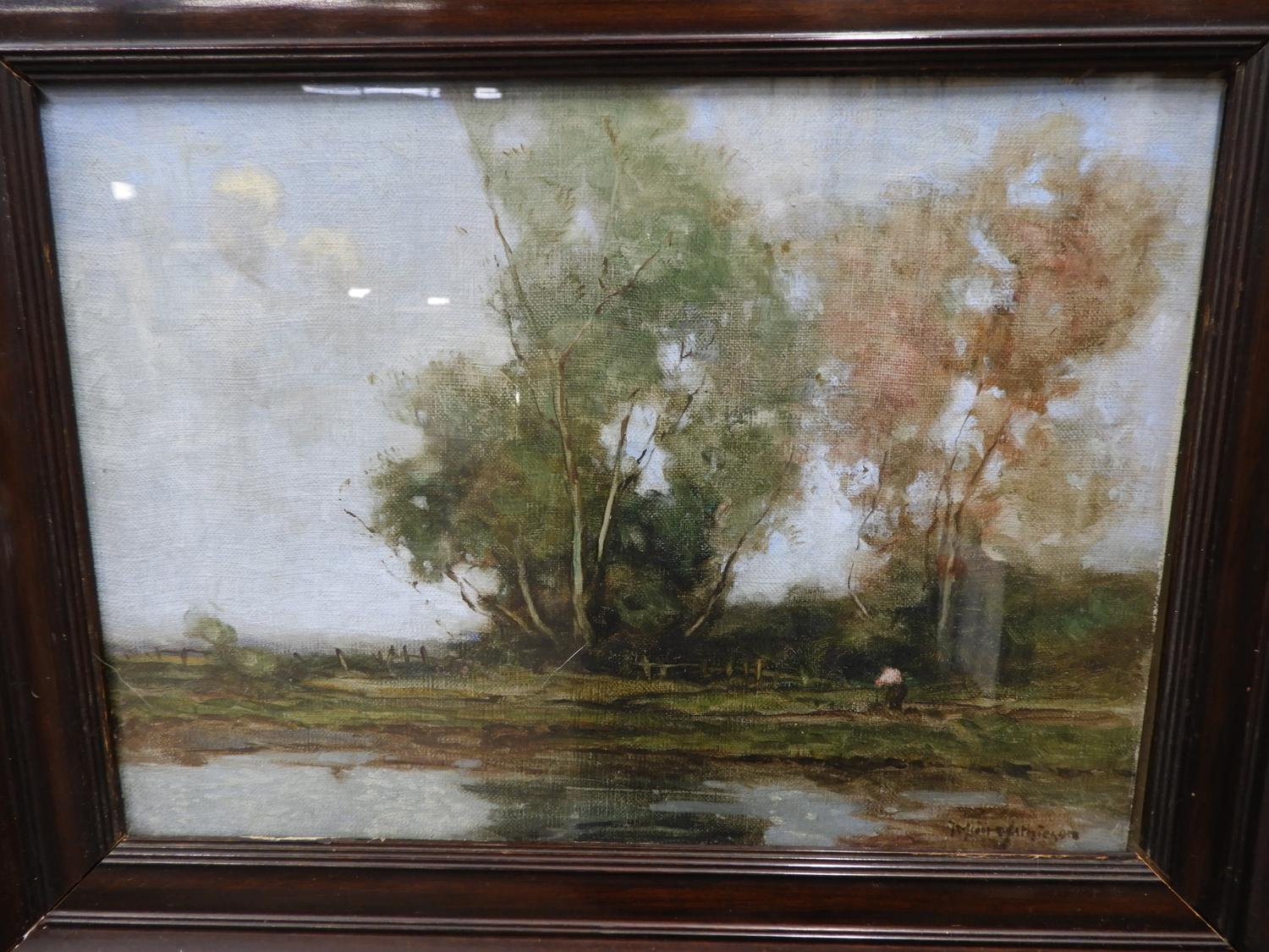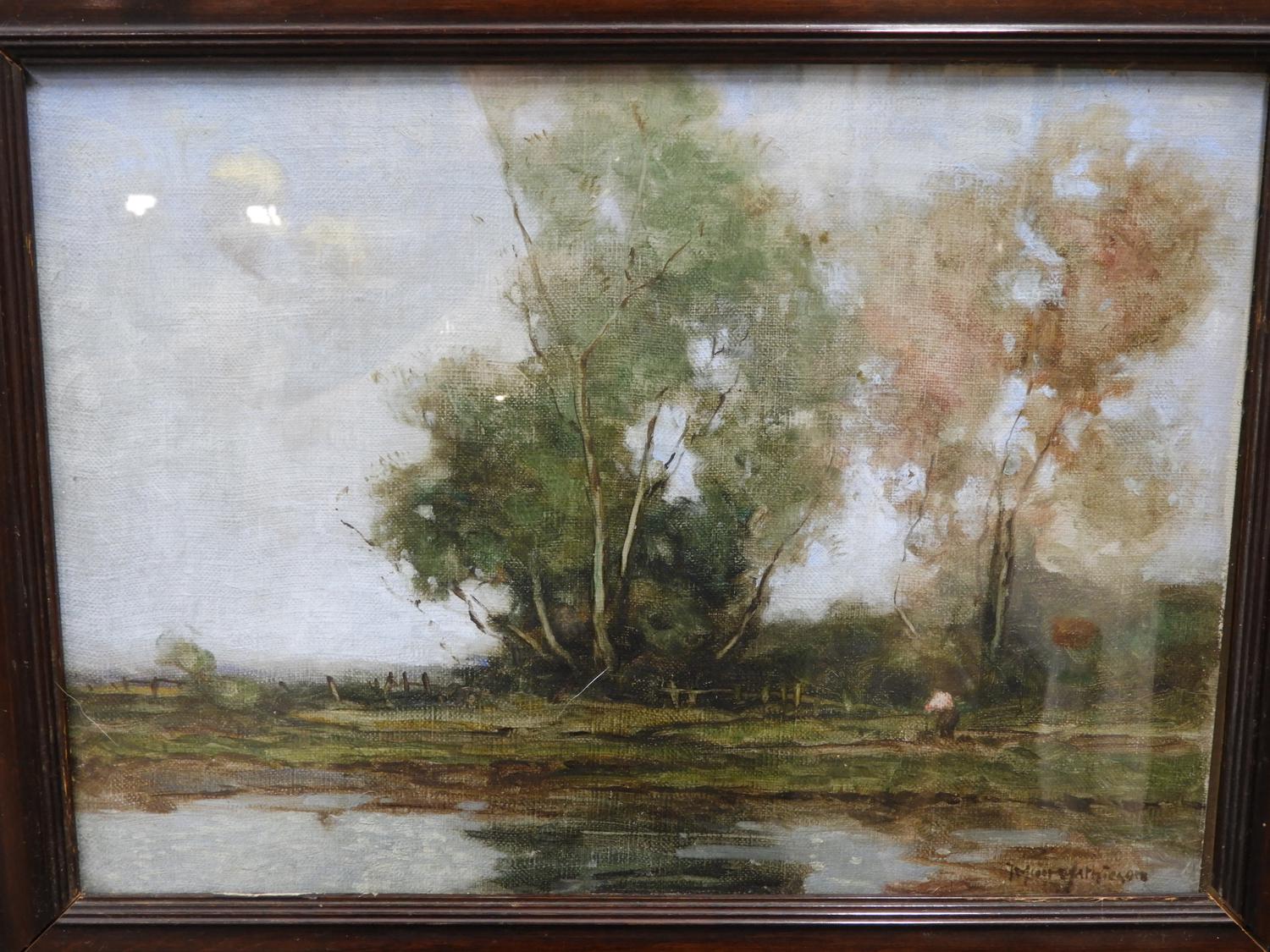 james muir mathieson(1911-1975), oil on canvas, 10" x 14", "landscape with figure and trees"