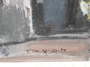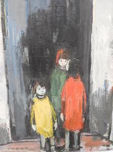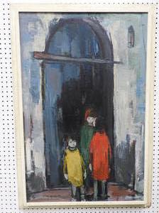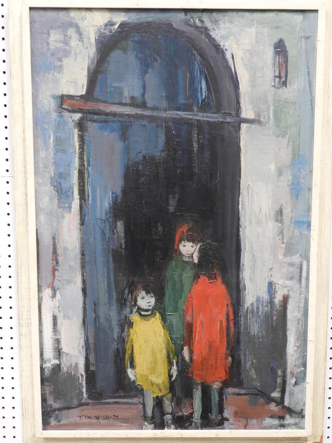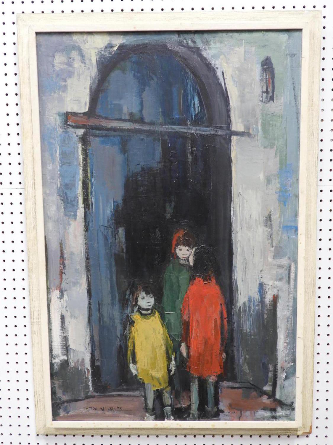 20th century asian school, oil on canvas, 39" x 25", "figures on the doorway"