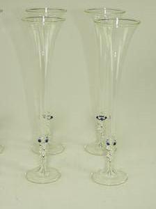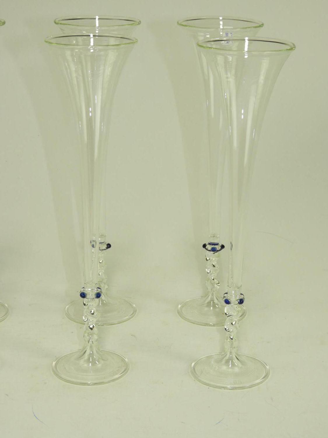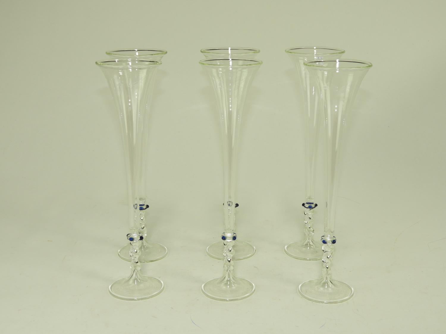 set of six art glass champagne flutes, with twist stems, ht 11 3/4"