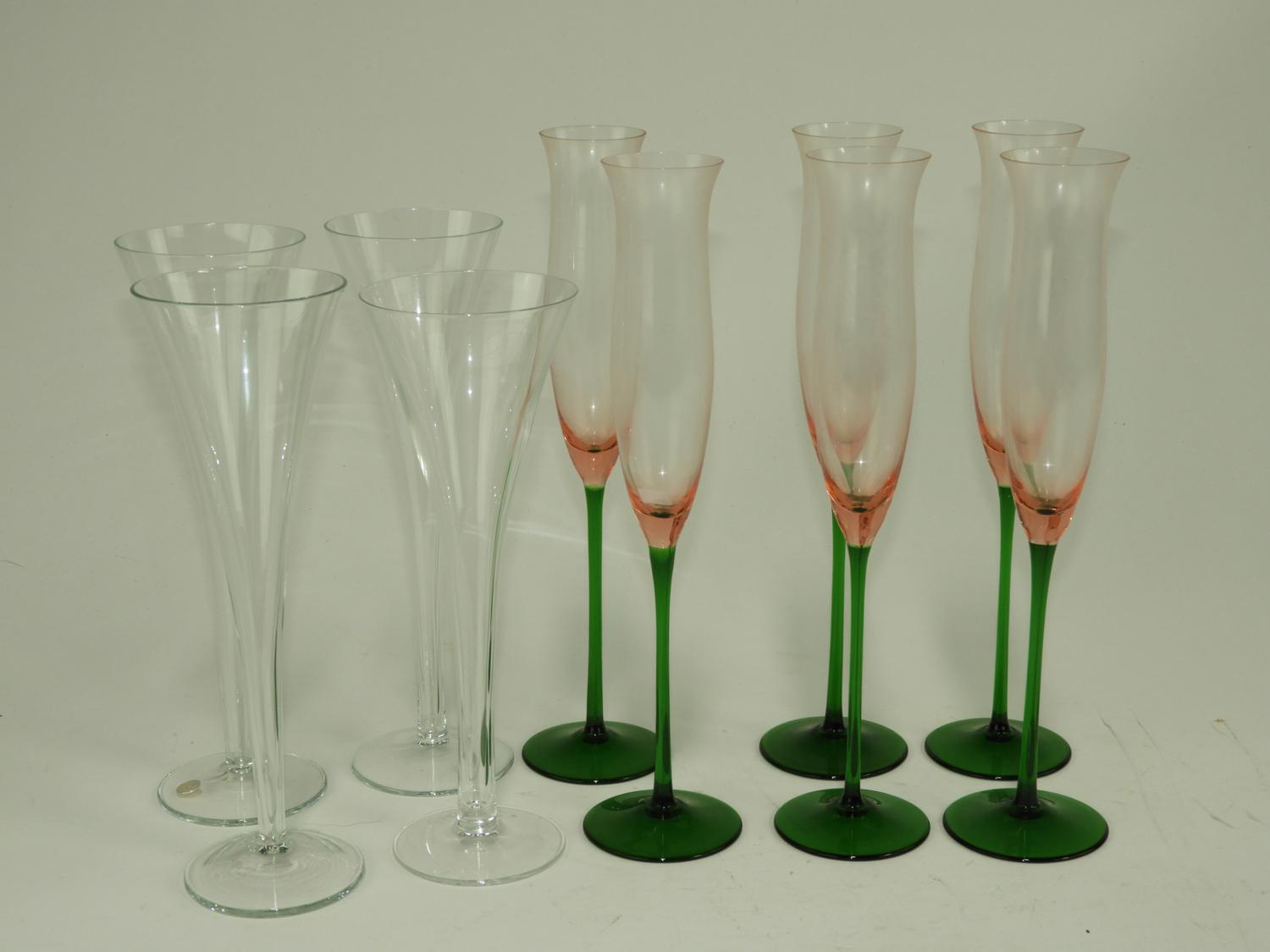 lot of 4 and lot of 6 champagne flutes, with colored flutes