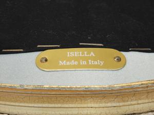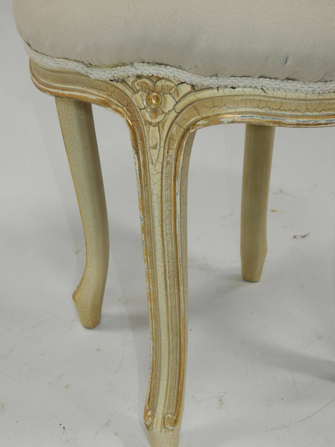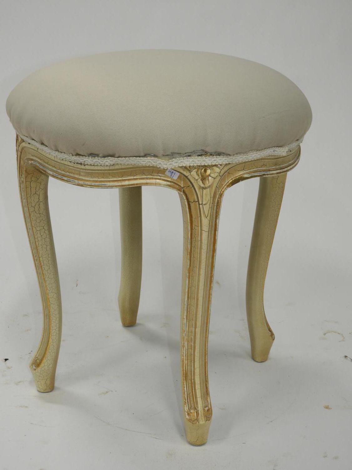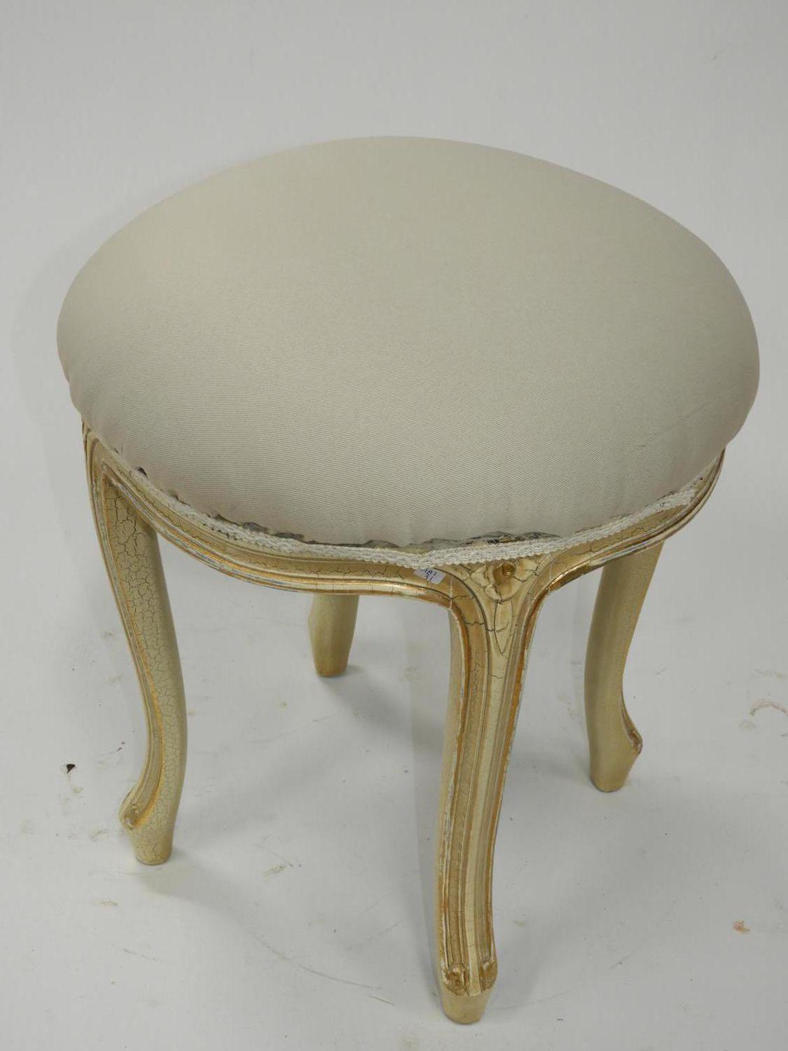louis xv-style painted and upholstered stool labelled isella, made in italy, 26 1/2" x 17"