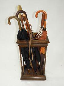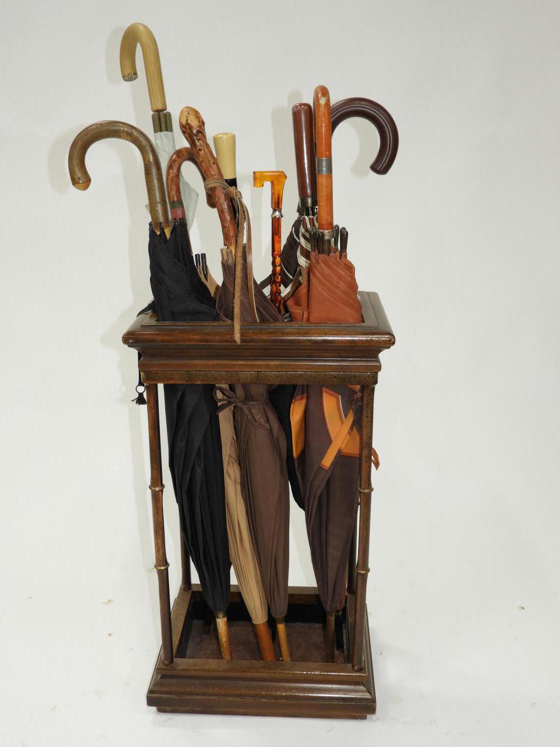 mid 20th century umbrella stand with umbrellas, 27" x 15"x 11"