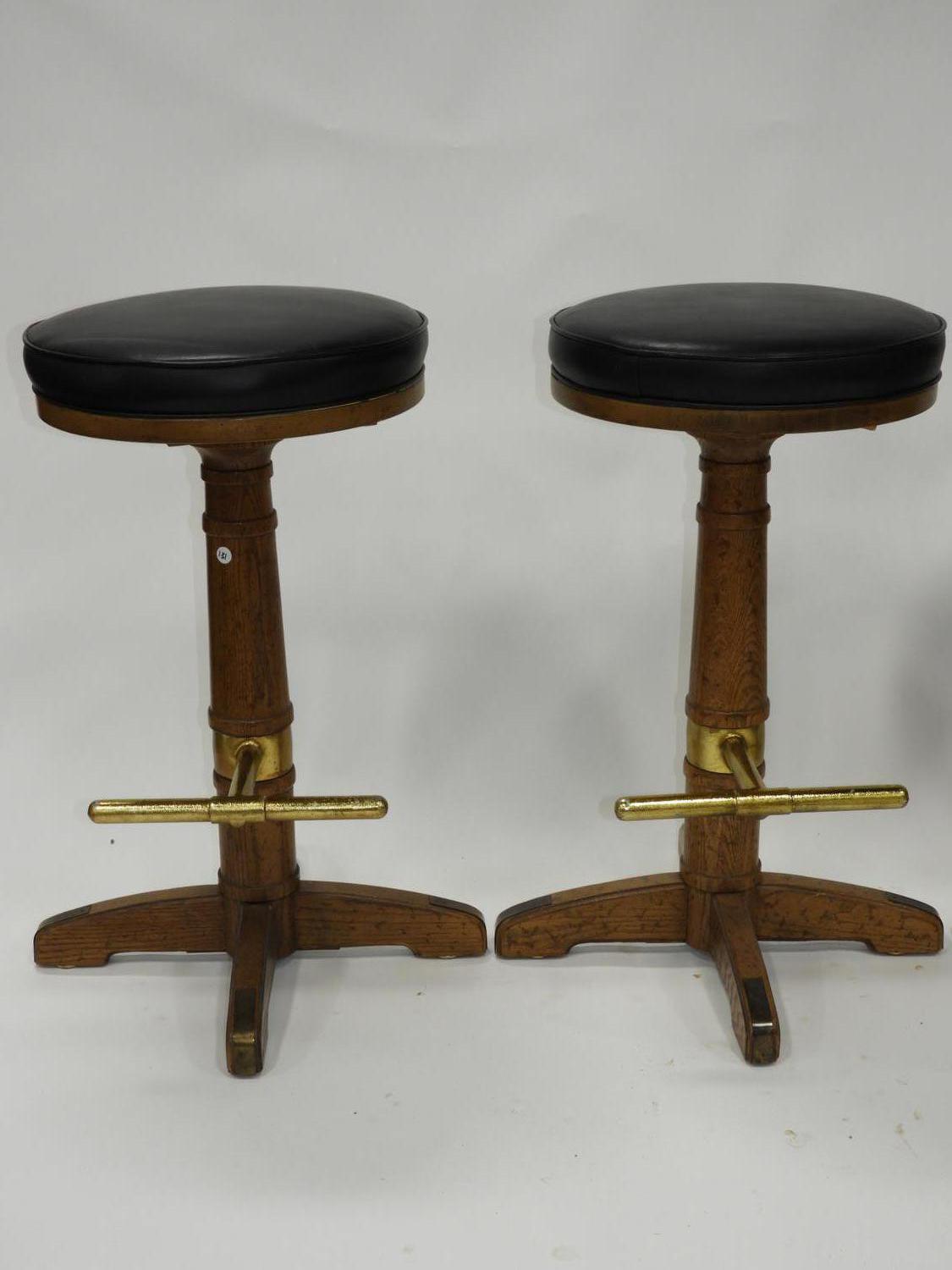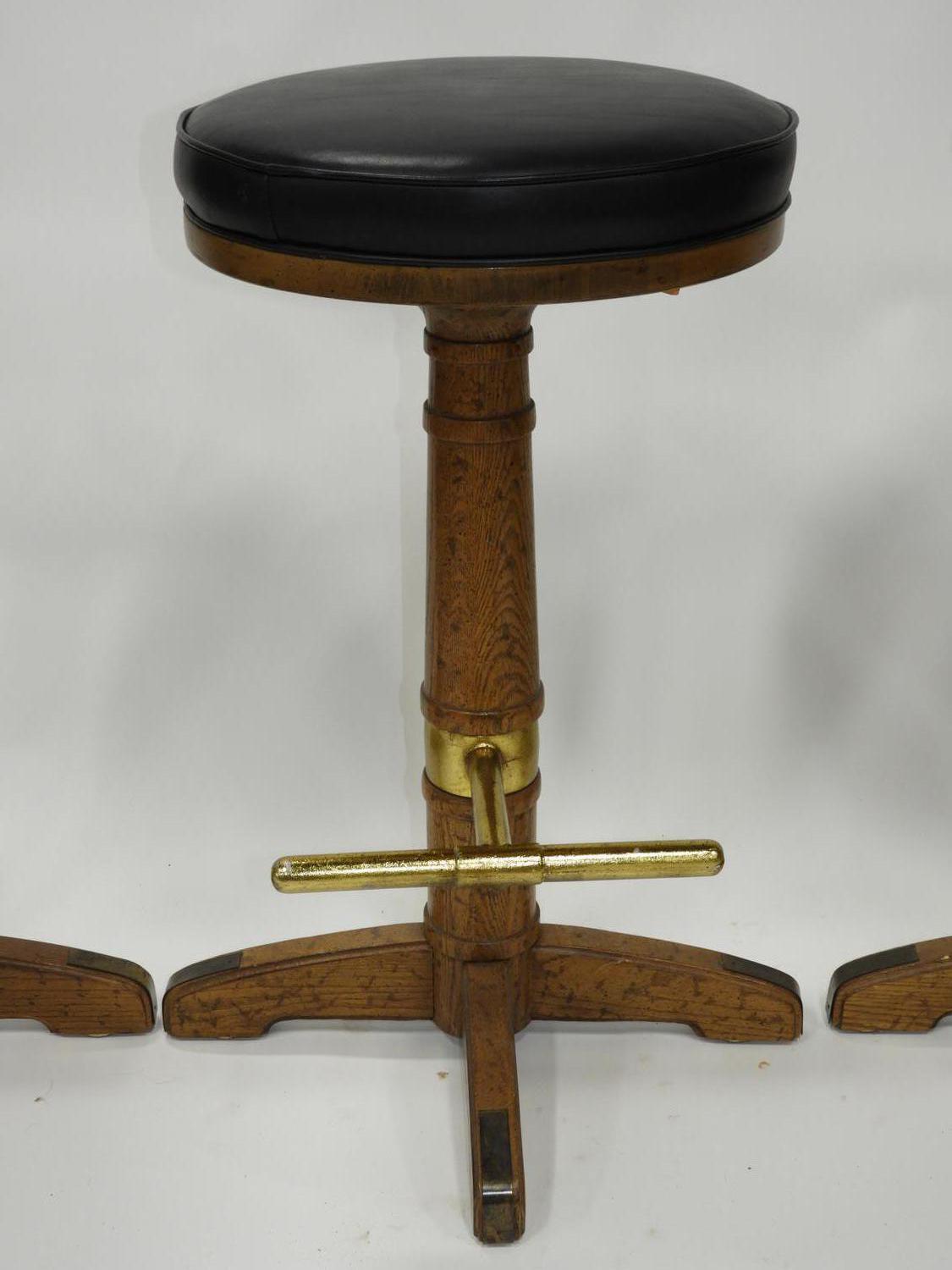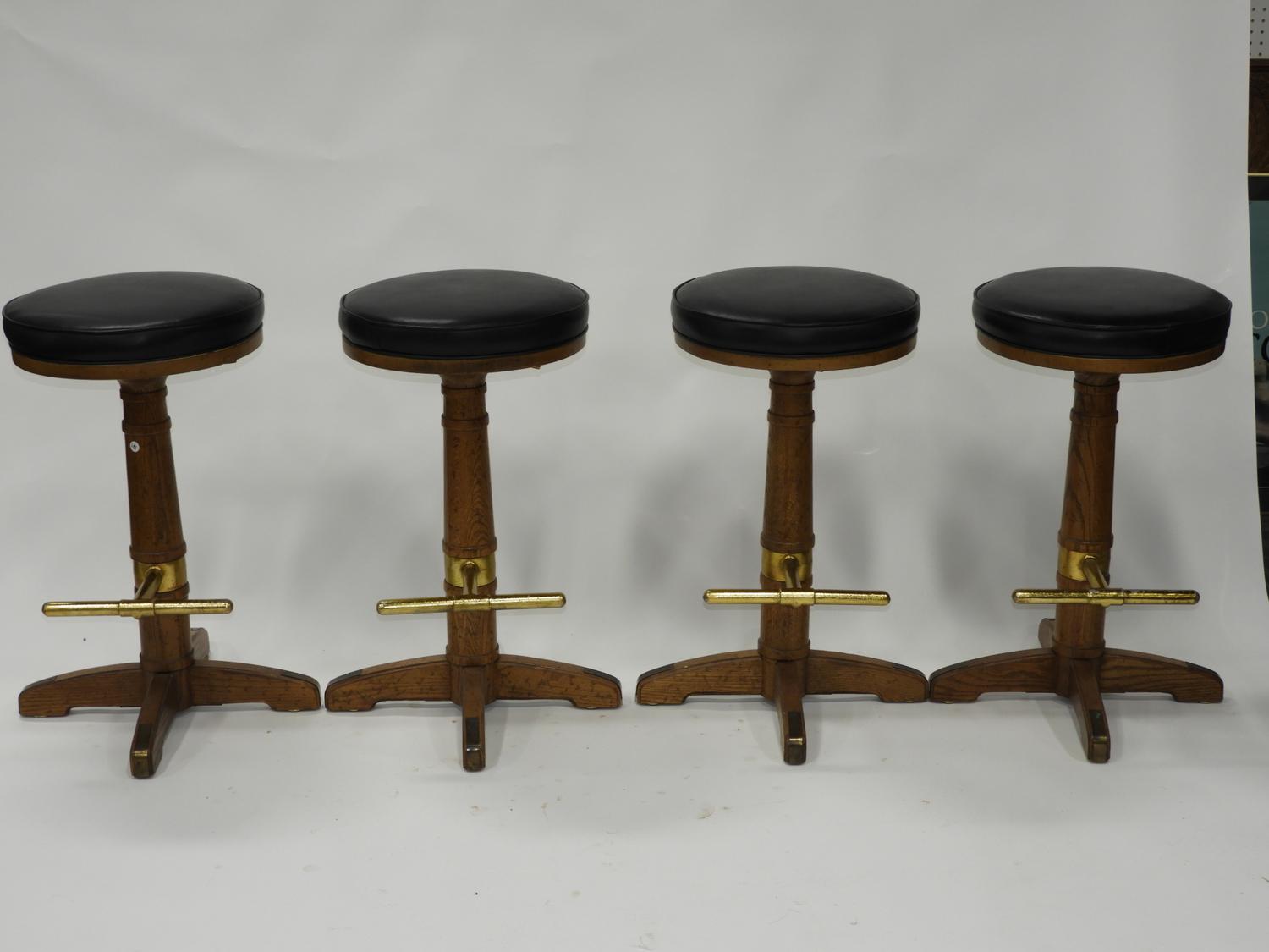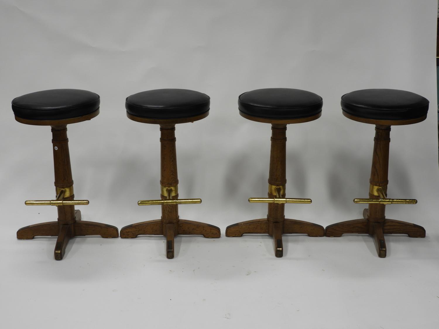 set of four oak bar stools with swivel upholstered seats and brass finish foot rests, ht. 31"