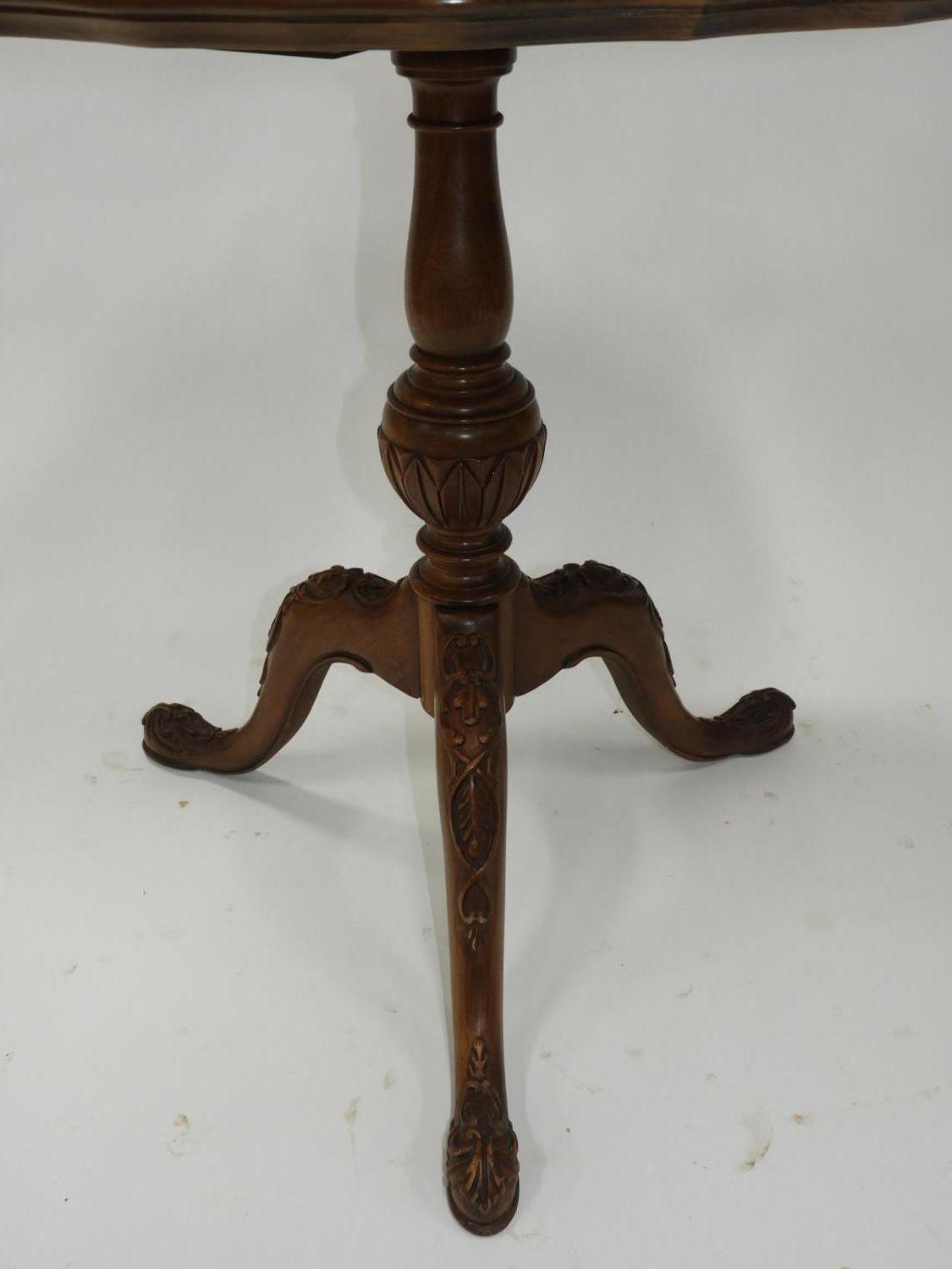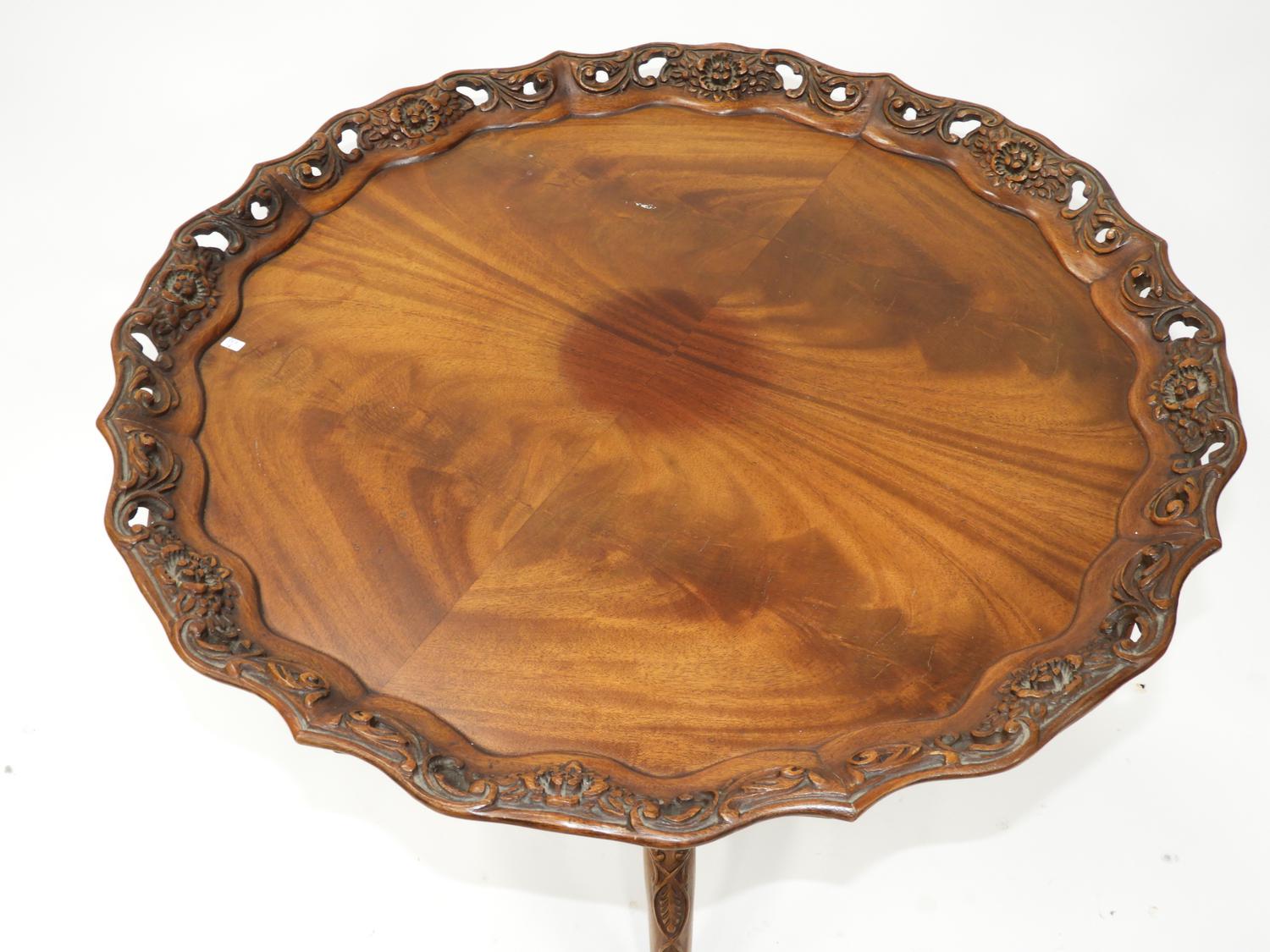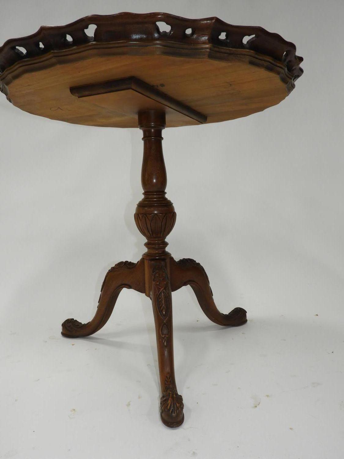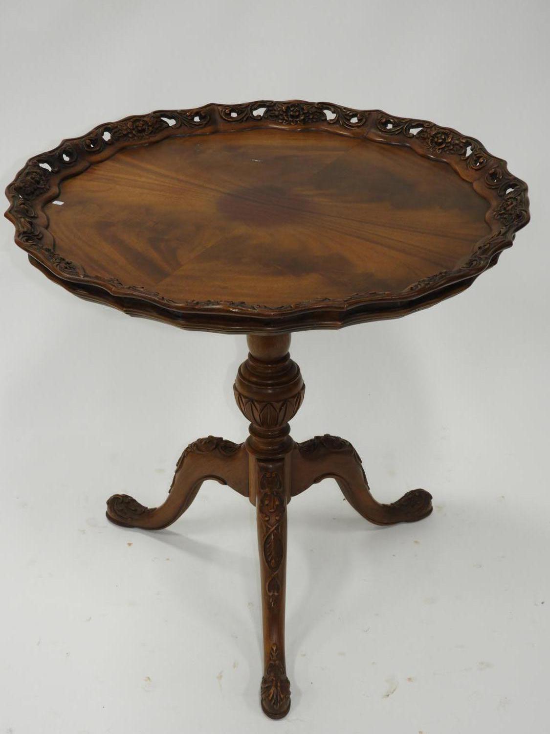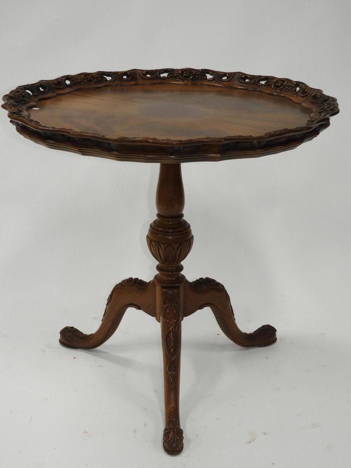 mahogany finish pedestal table with pierced foliate rim, circa 1900, 28" x 30"