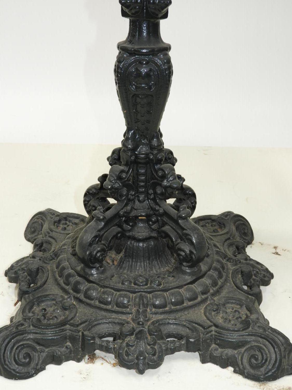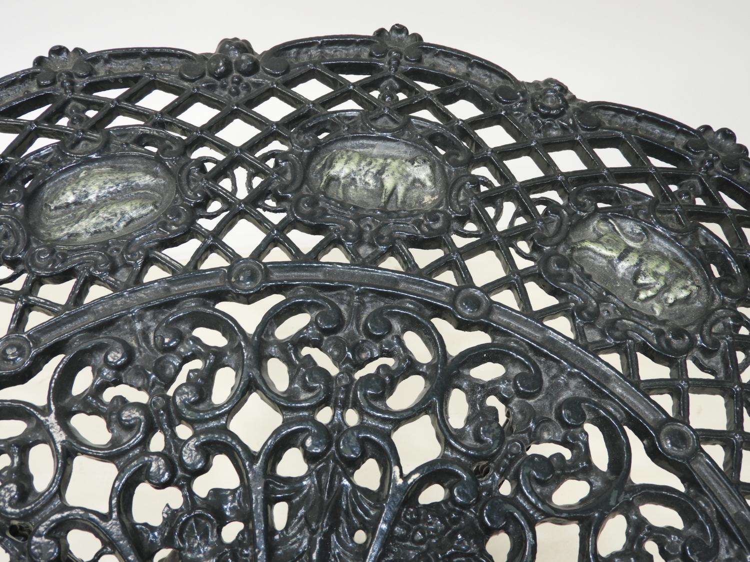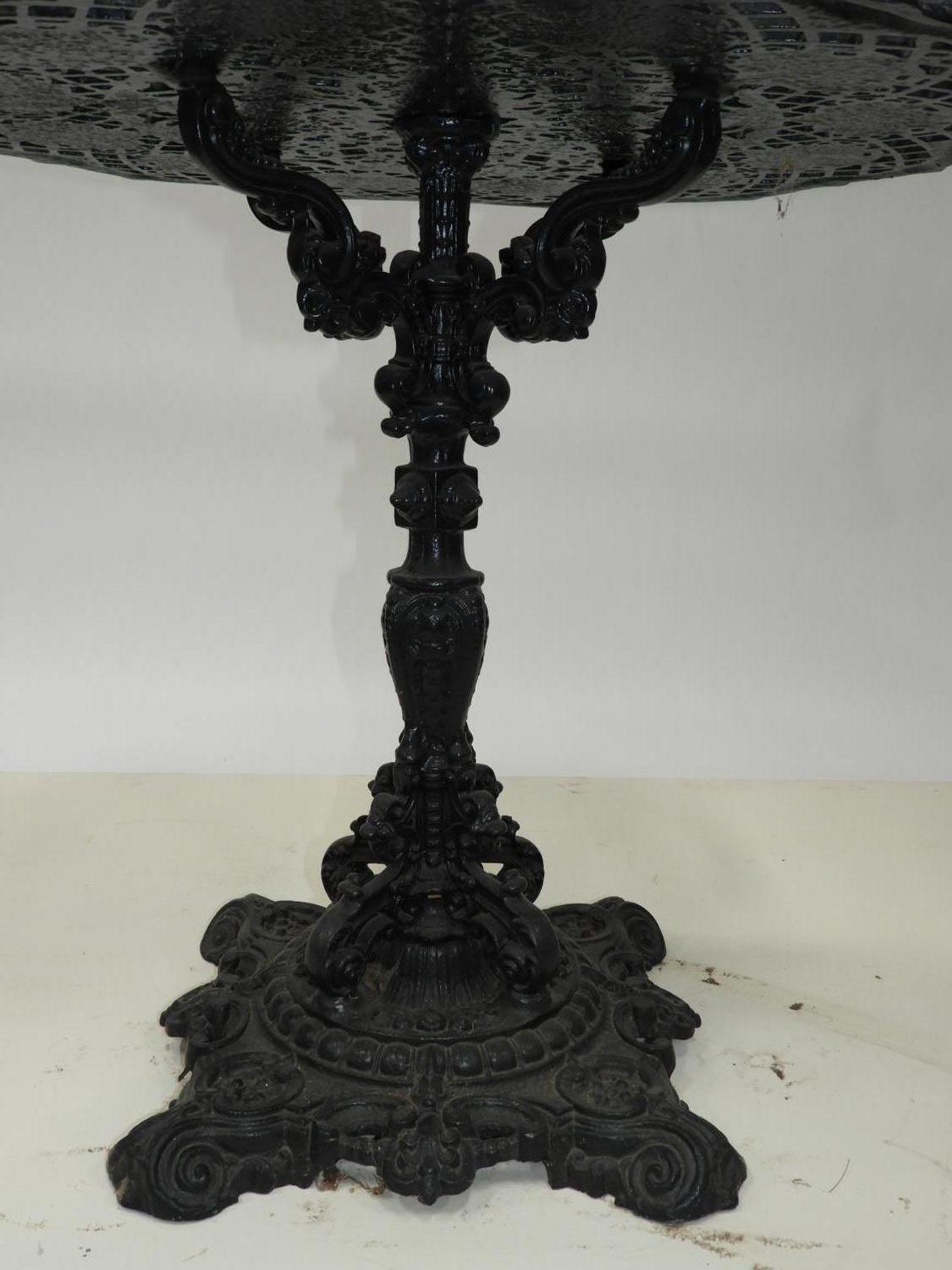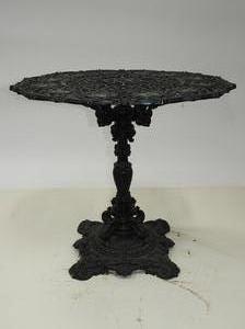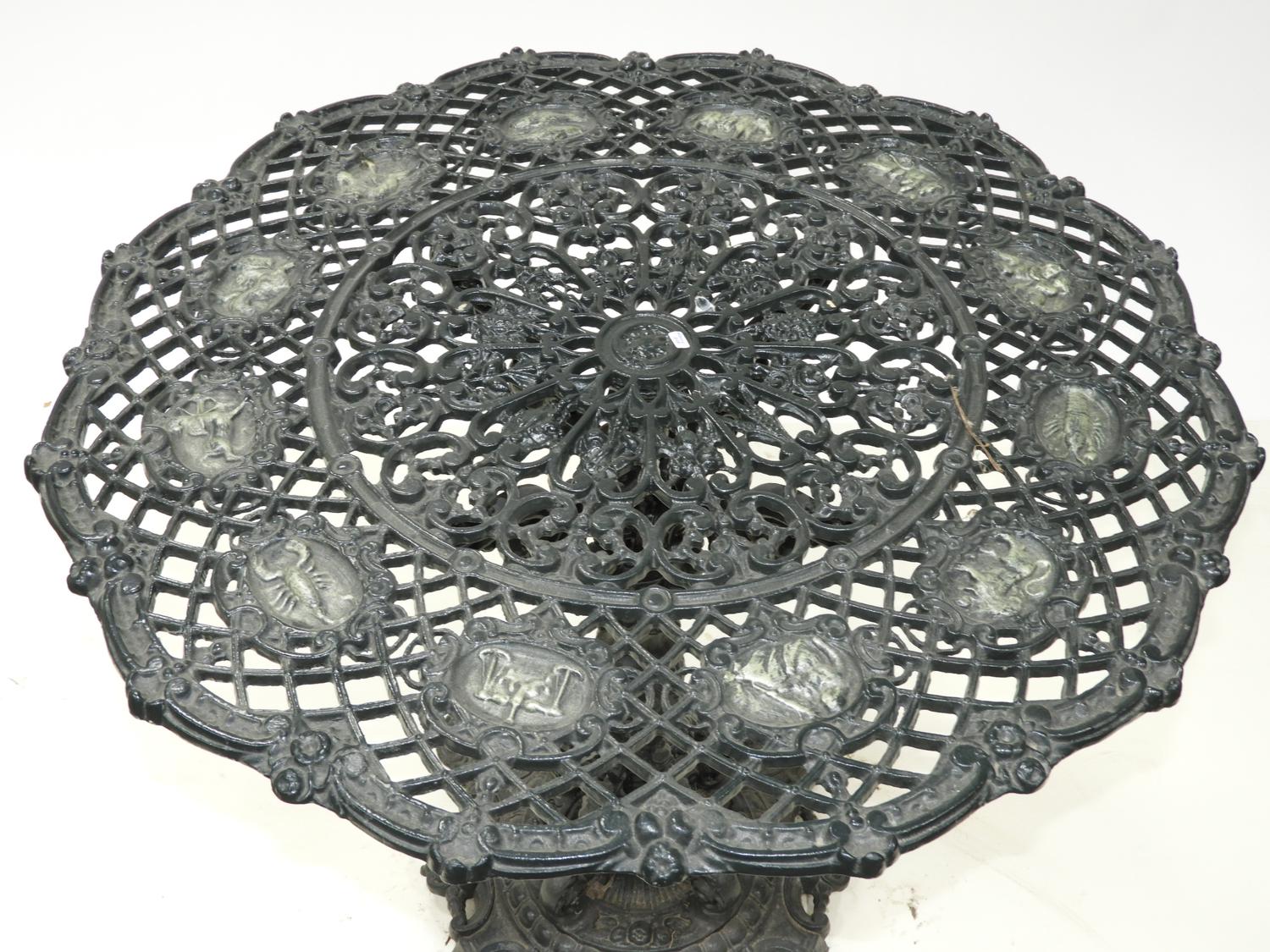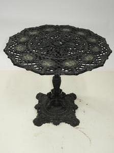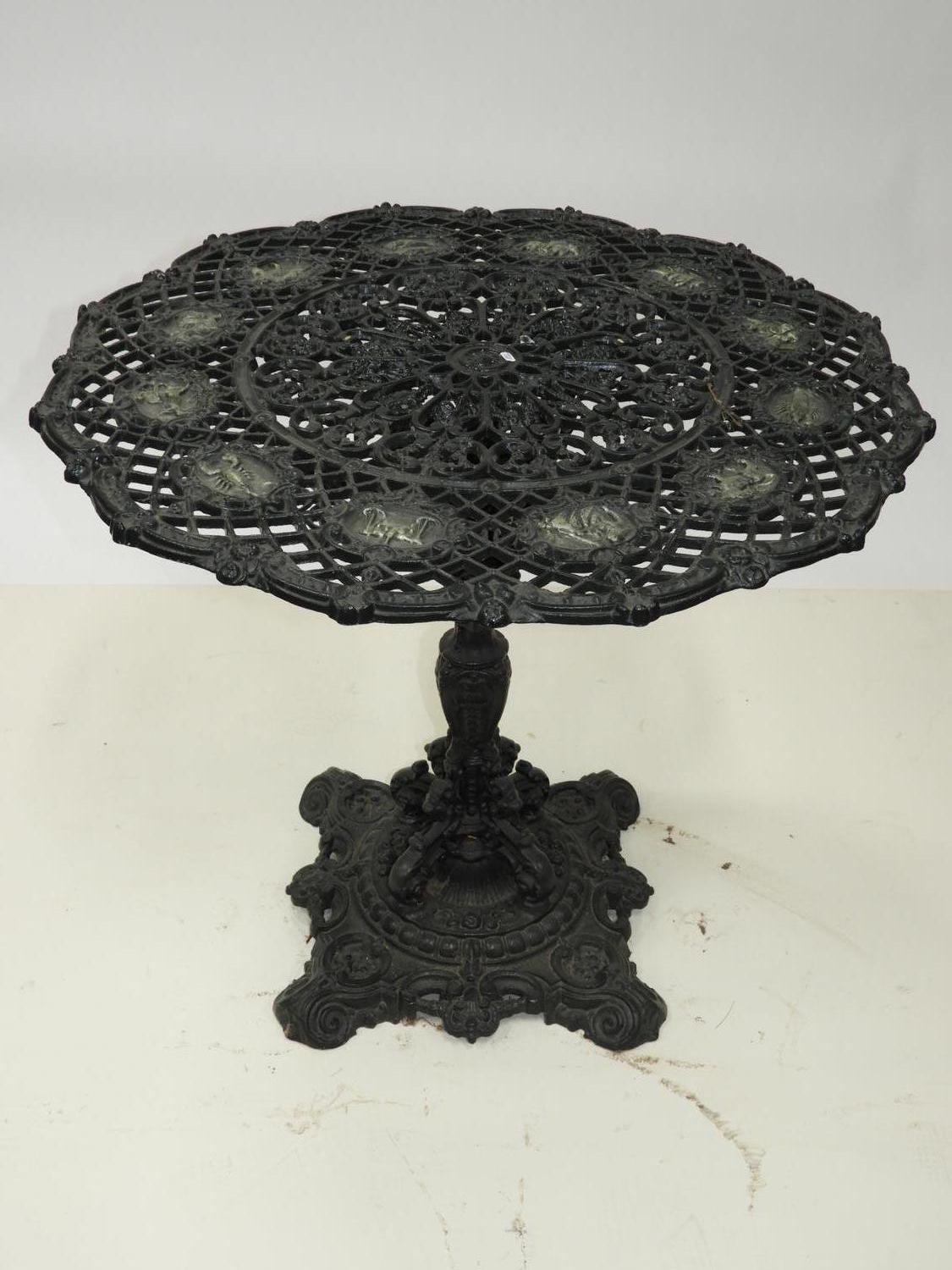 cast iron pedestal table decorated with astrological symbols, 27 1/2" x 31"