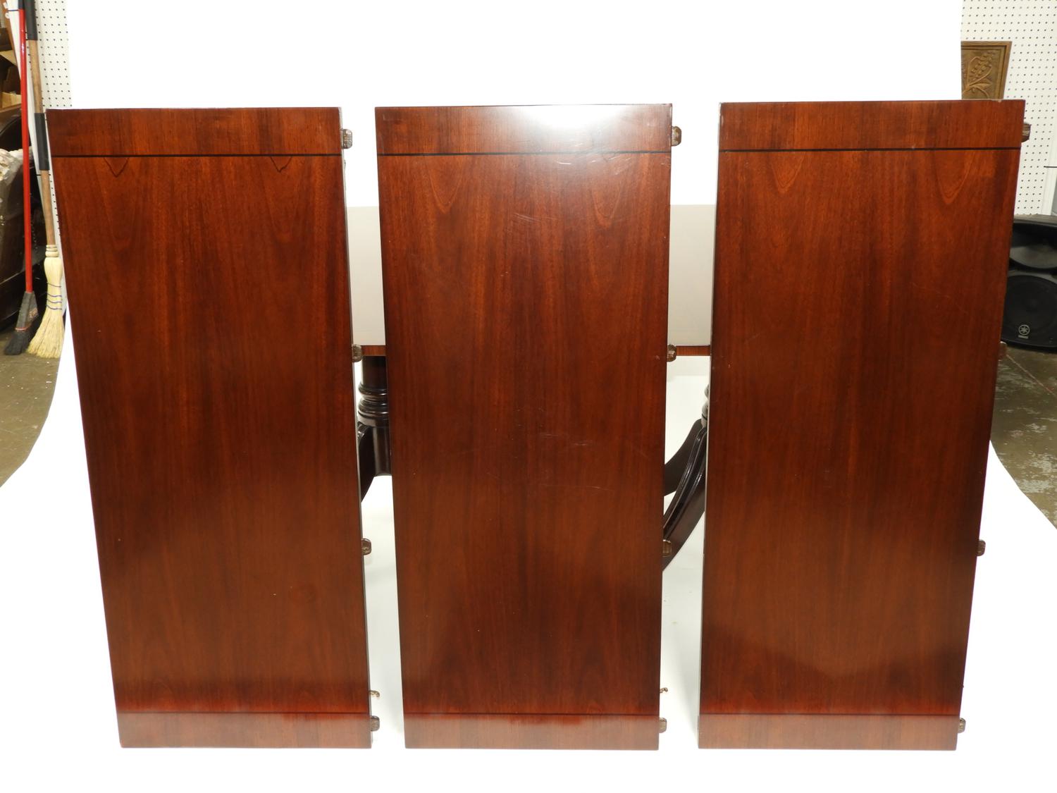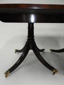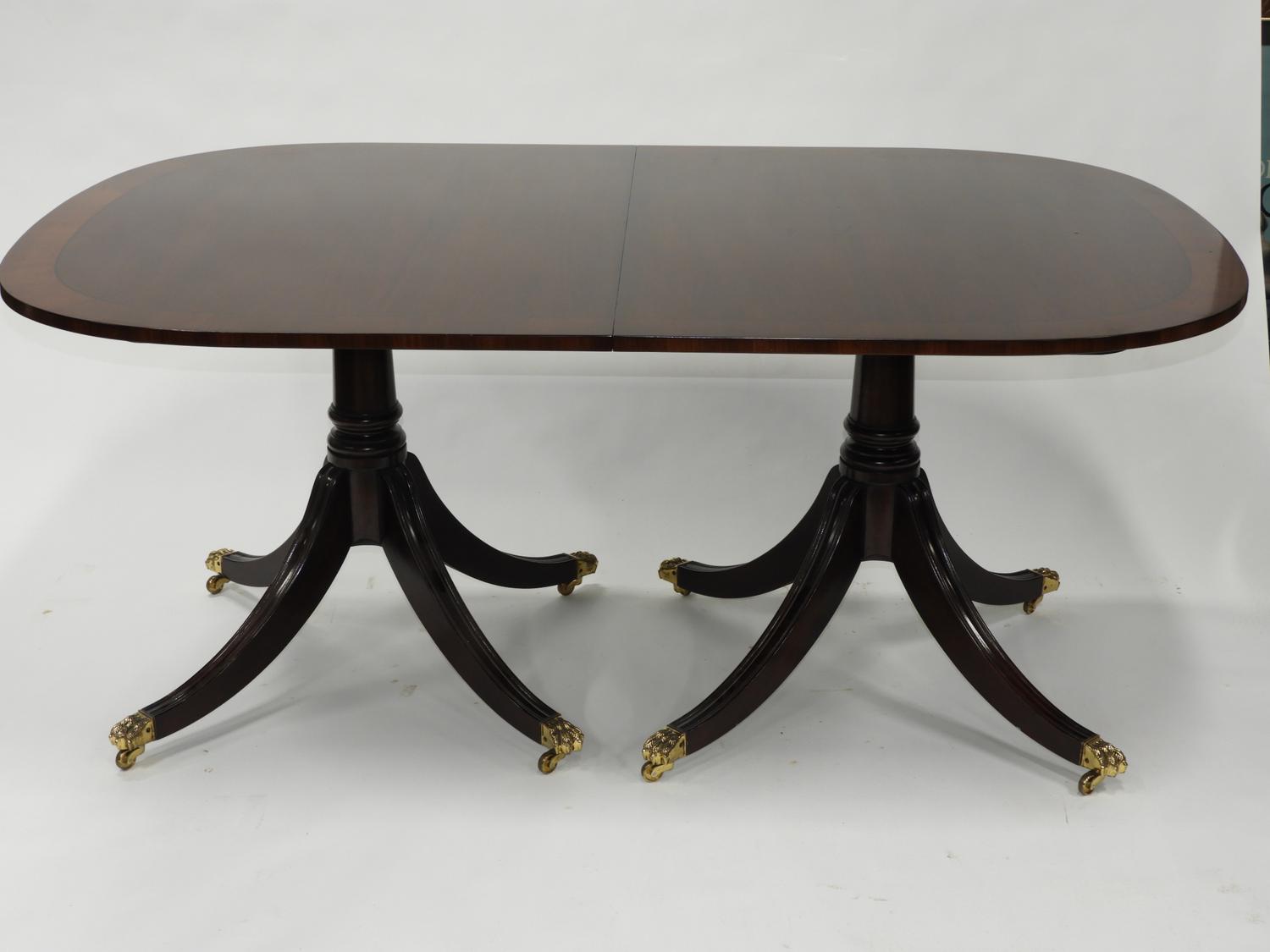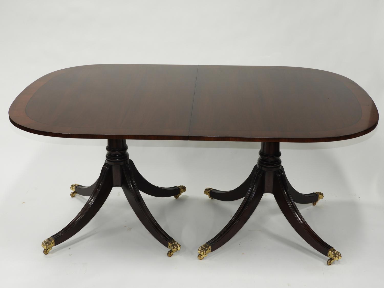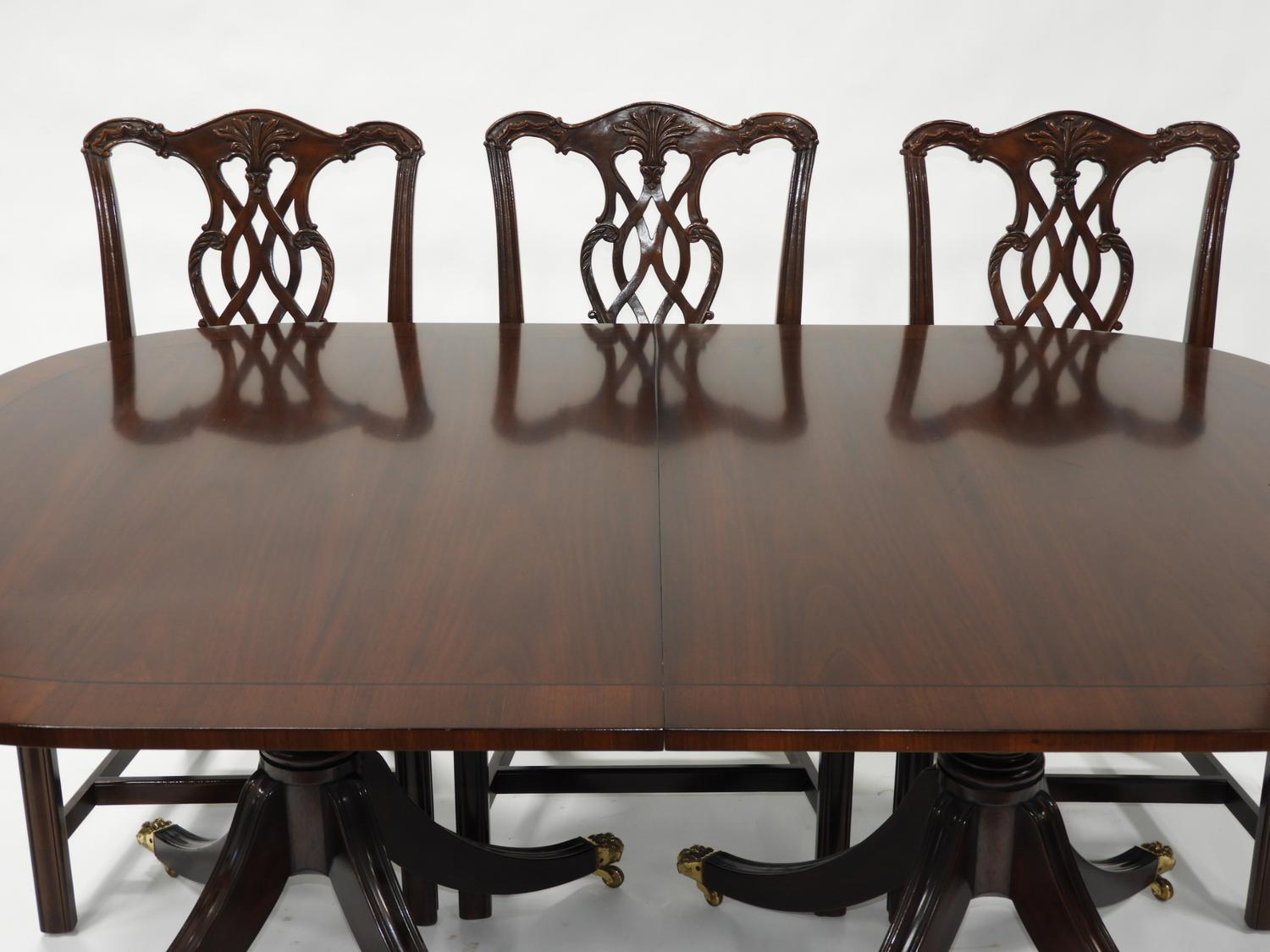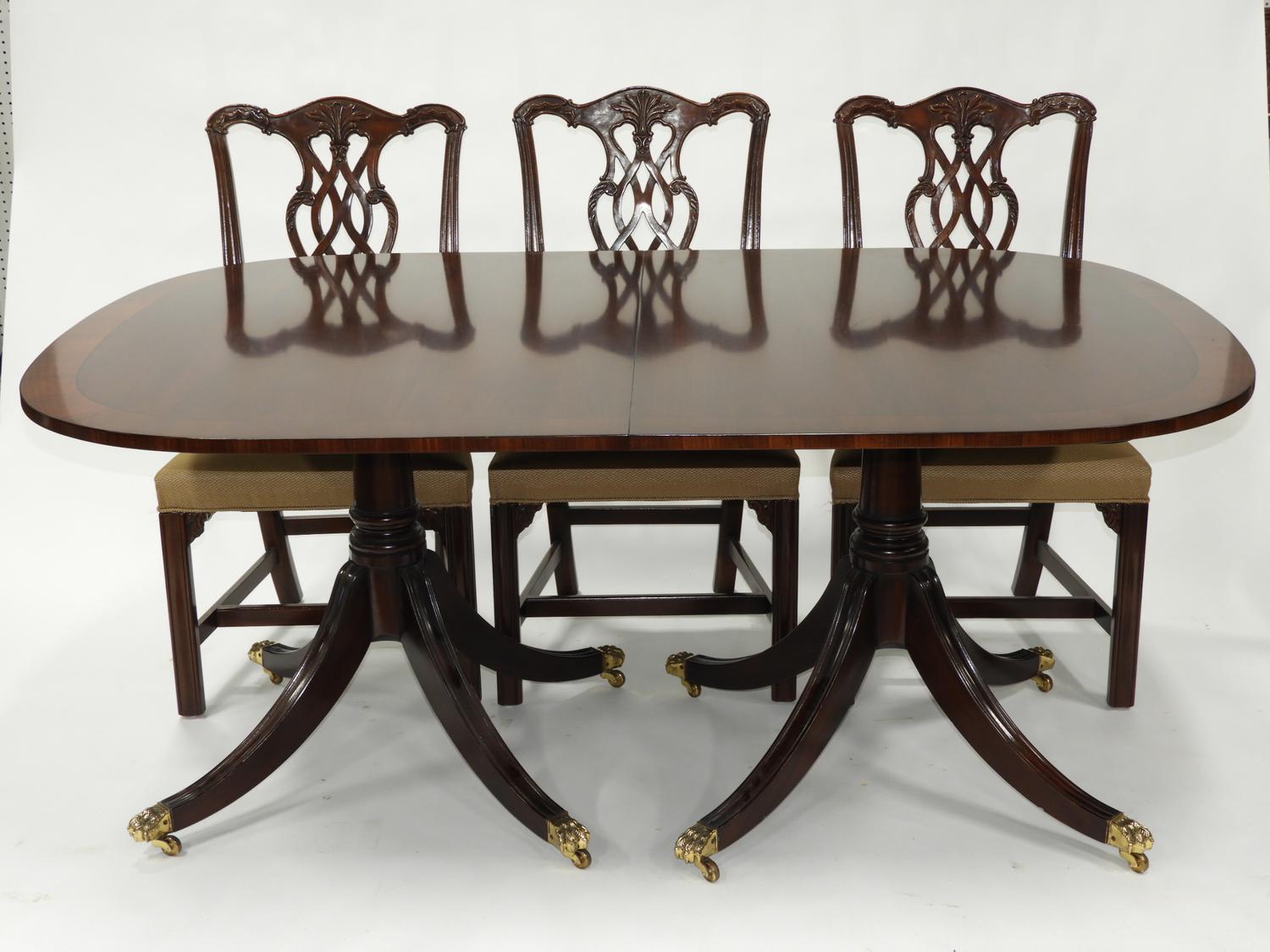 george iii style mahogany double pedestal dining table with three extension leaves by guildhall together with a set of eight mahogany chairs, table 29" x 120" x 44"