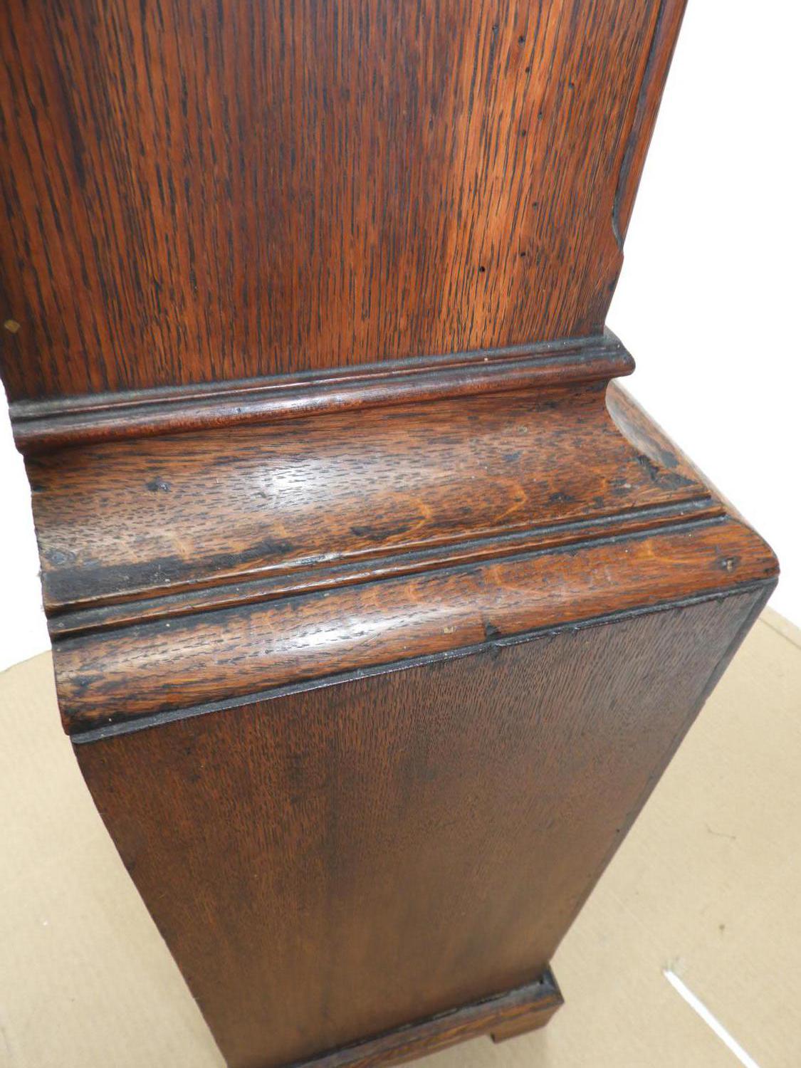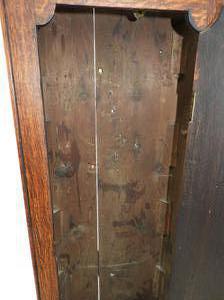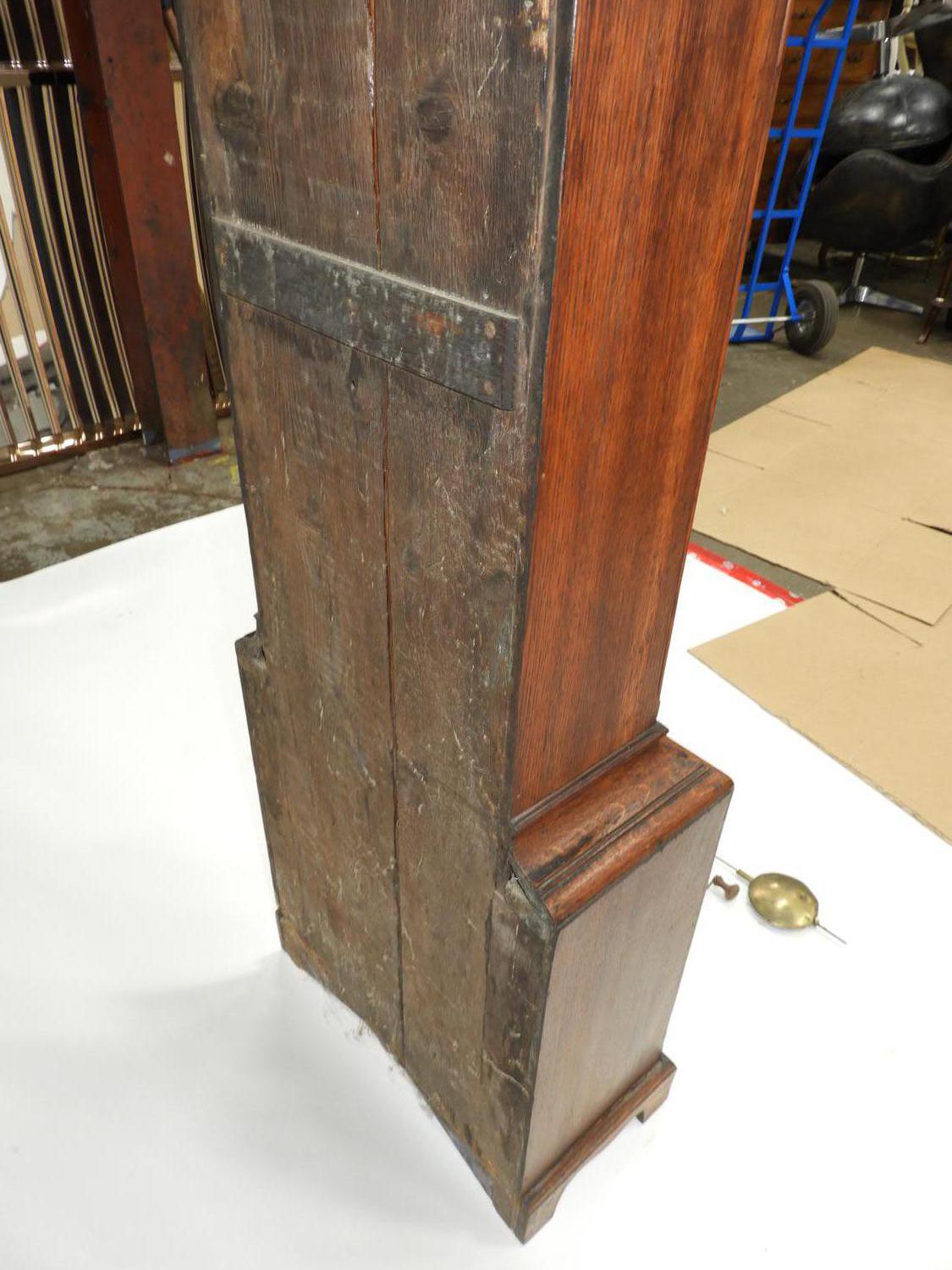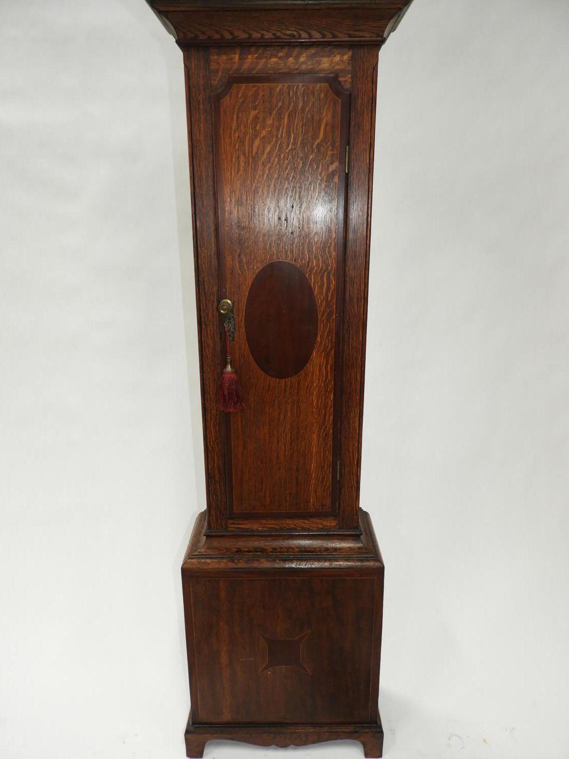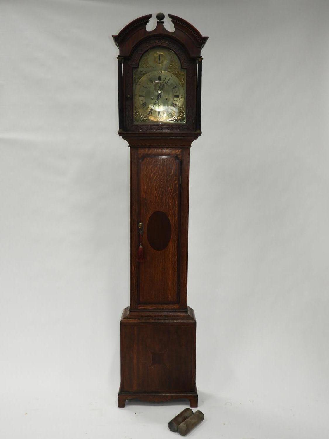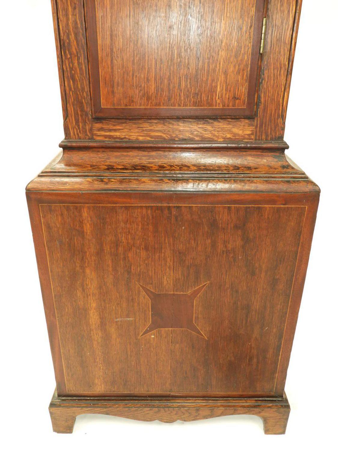 inlaid oak long case clock, english 19th century with brass dial, ht. 91 1/2"