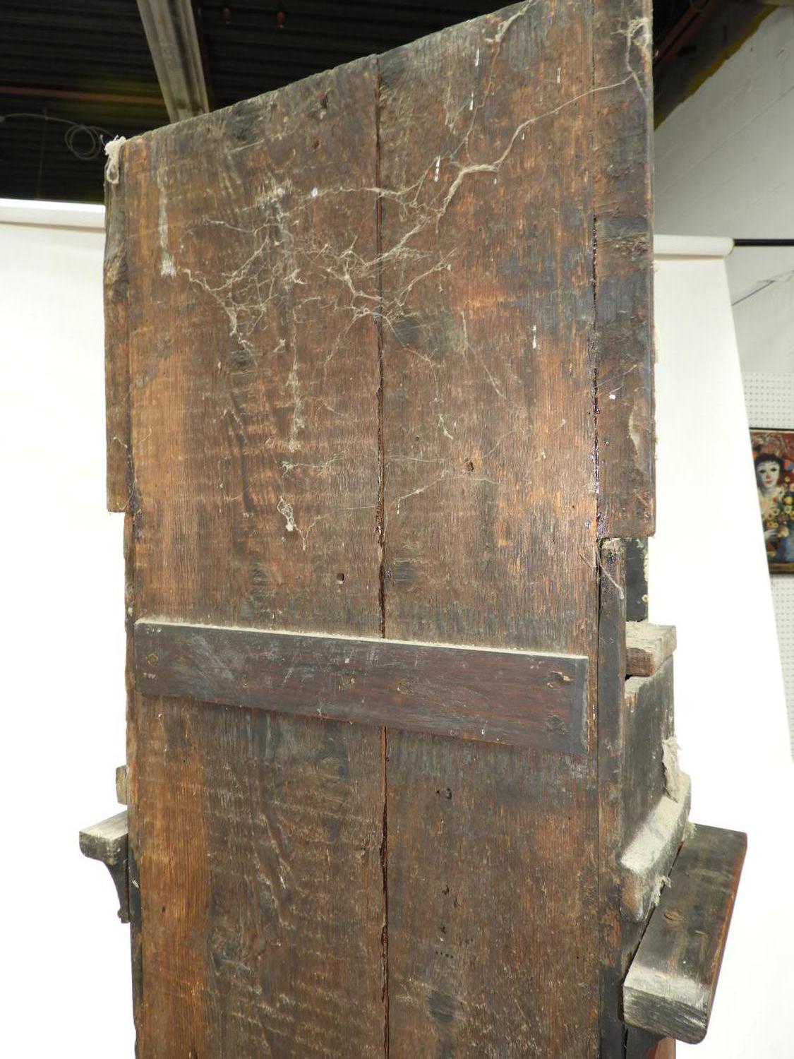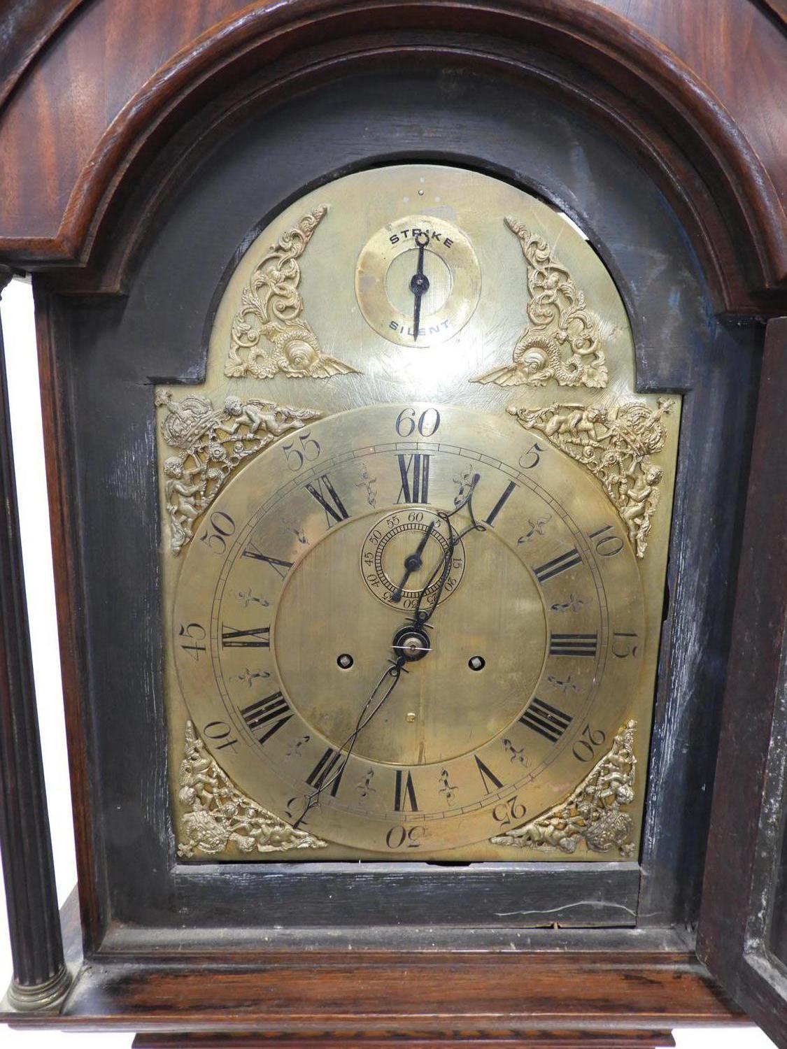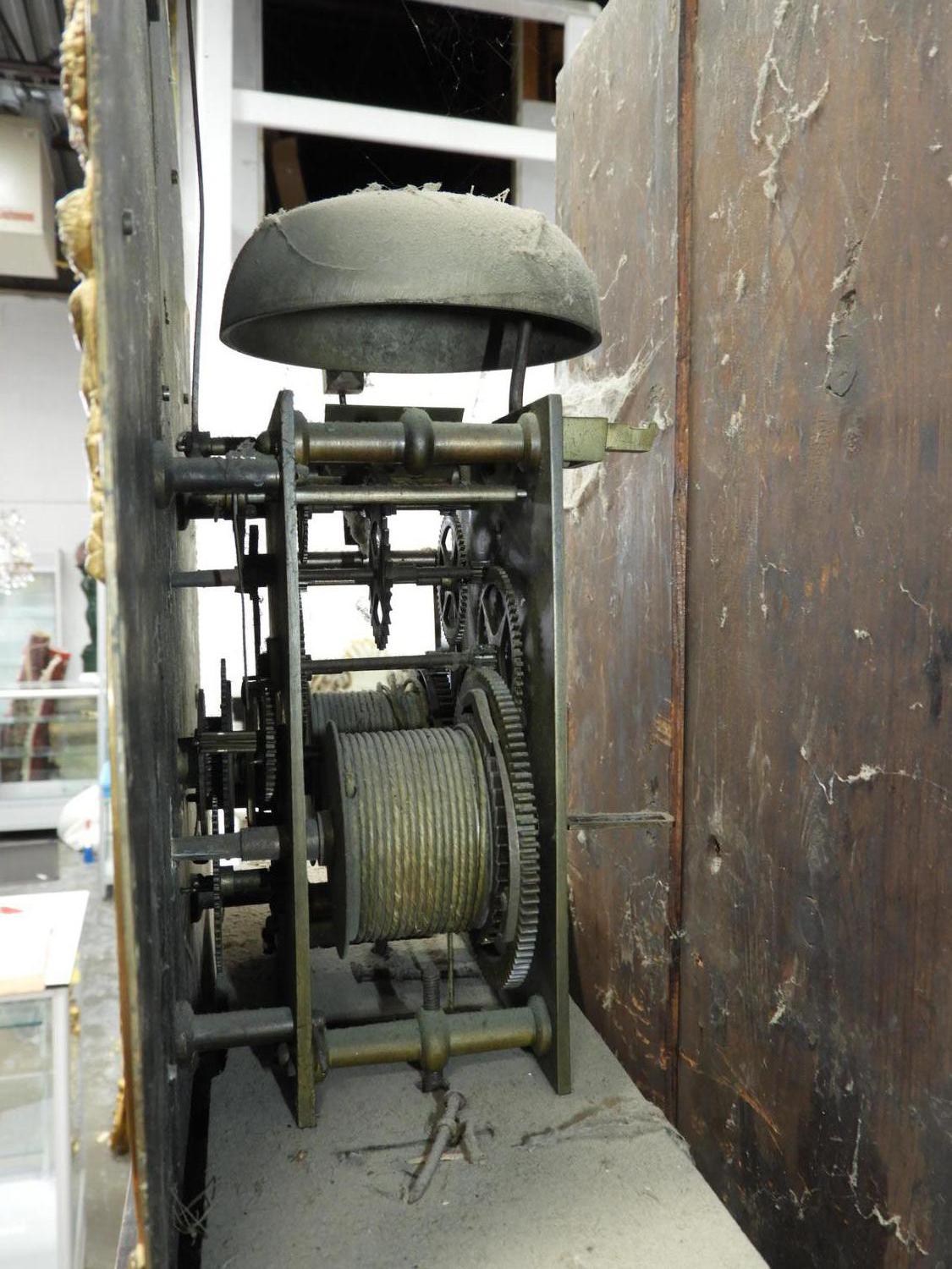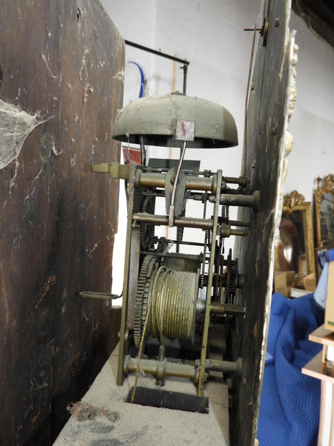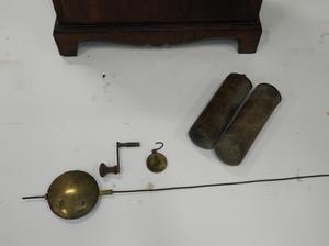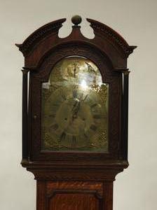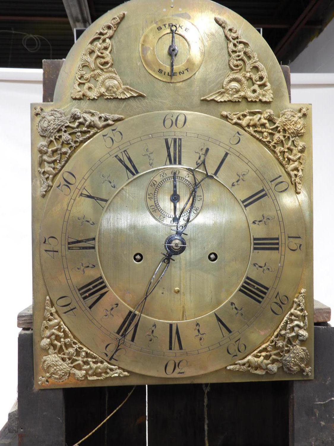 inlaid oak long case clock, english 19th century with brass dial, ht. 91 1/2"
