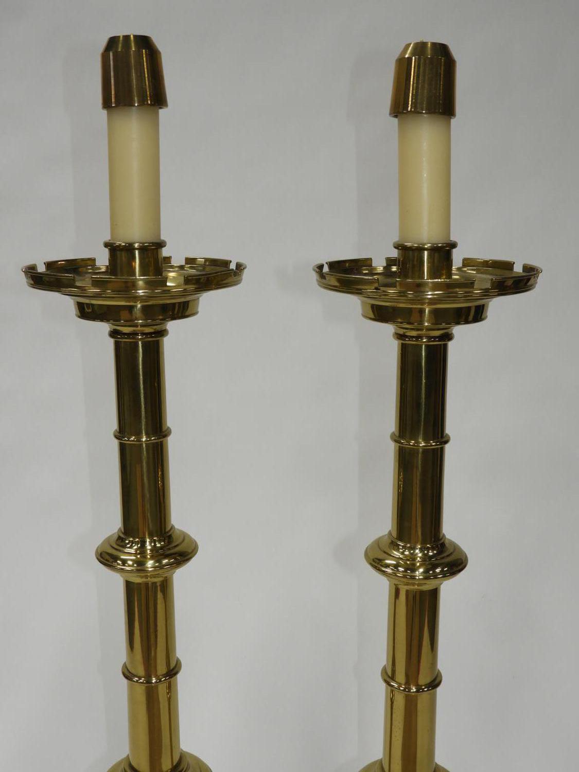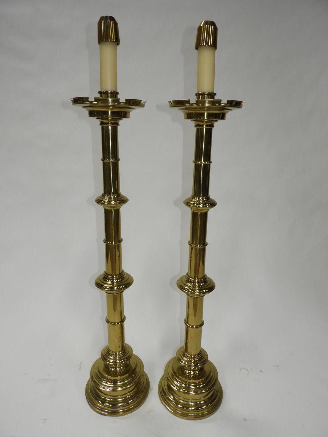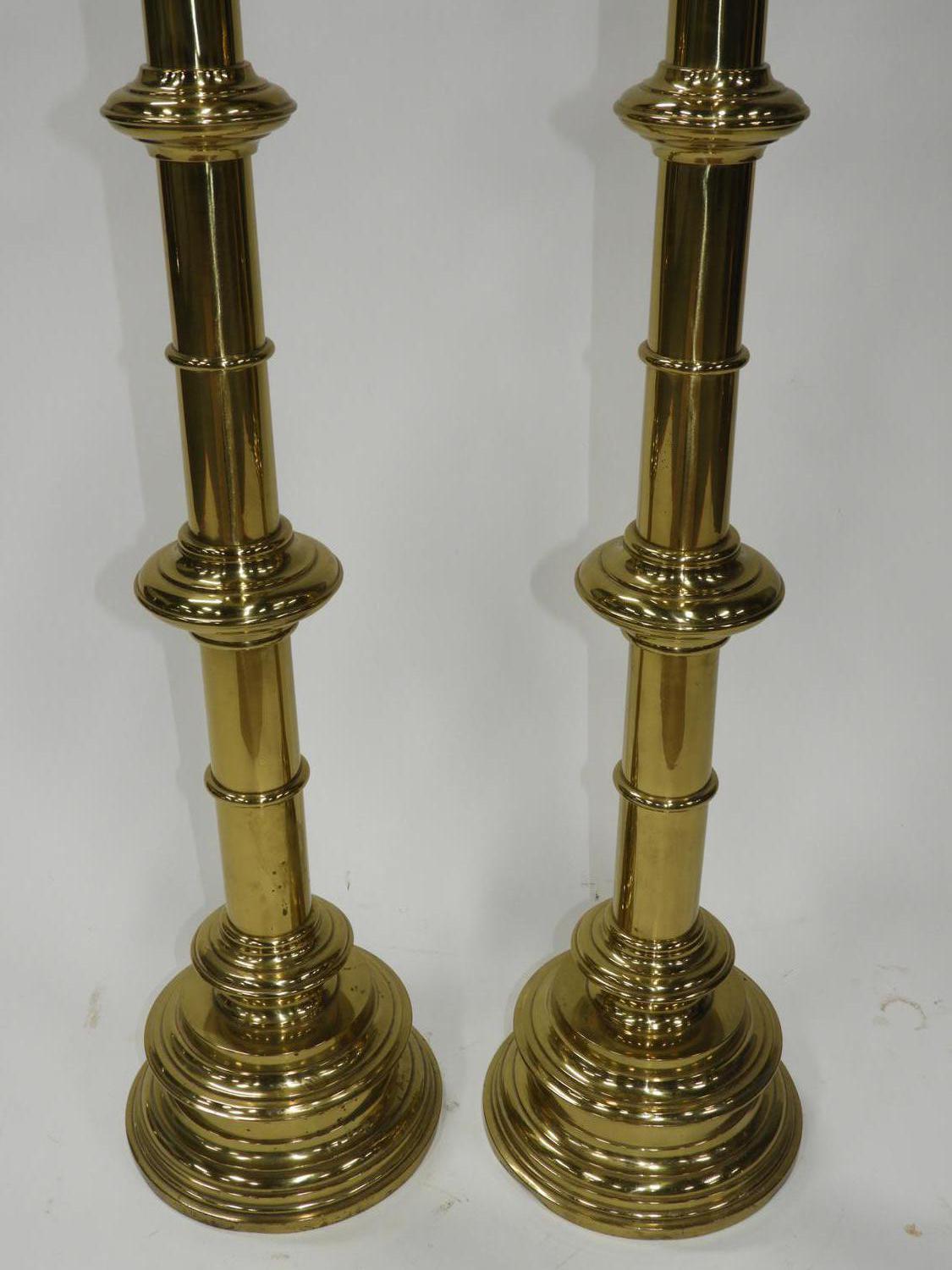 pair of 20th century weighted brass turned candle stands, ht. 50"