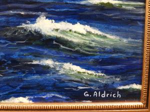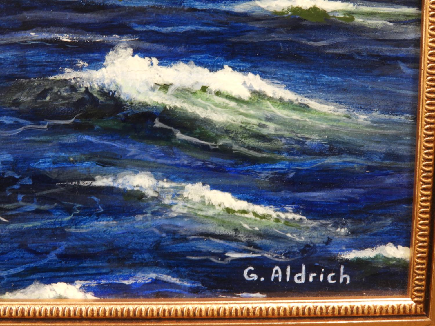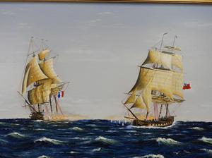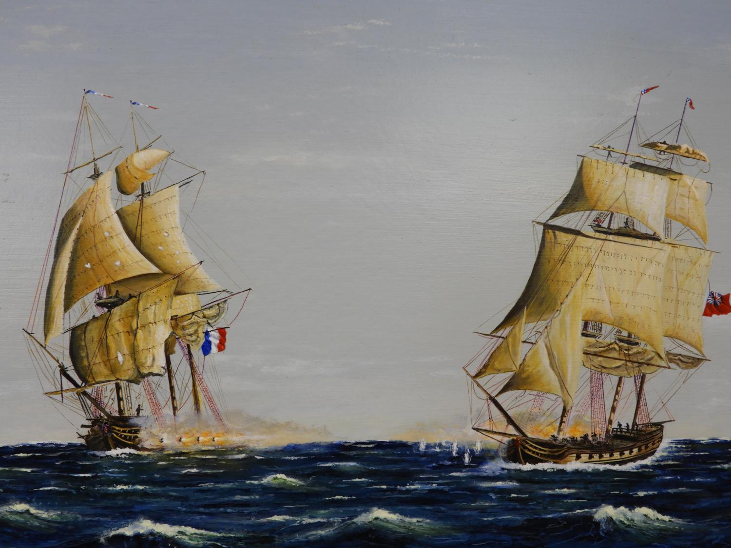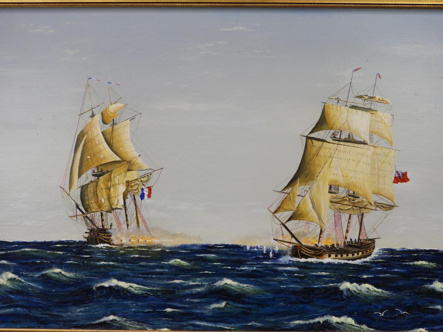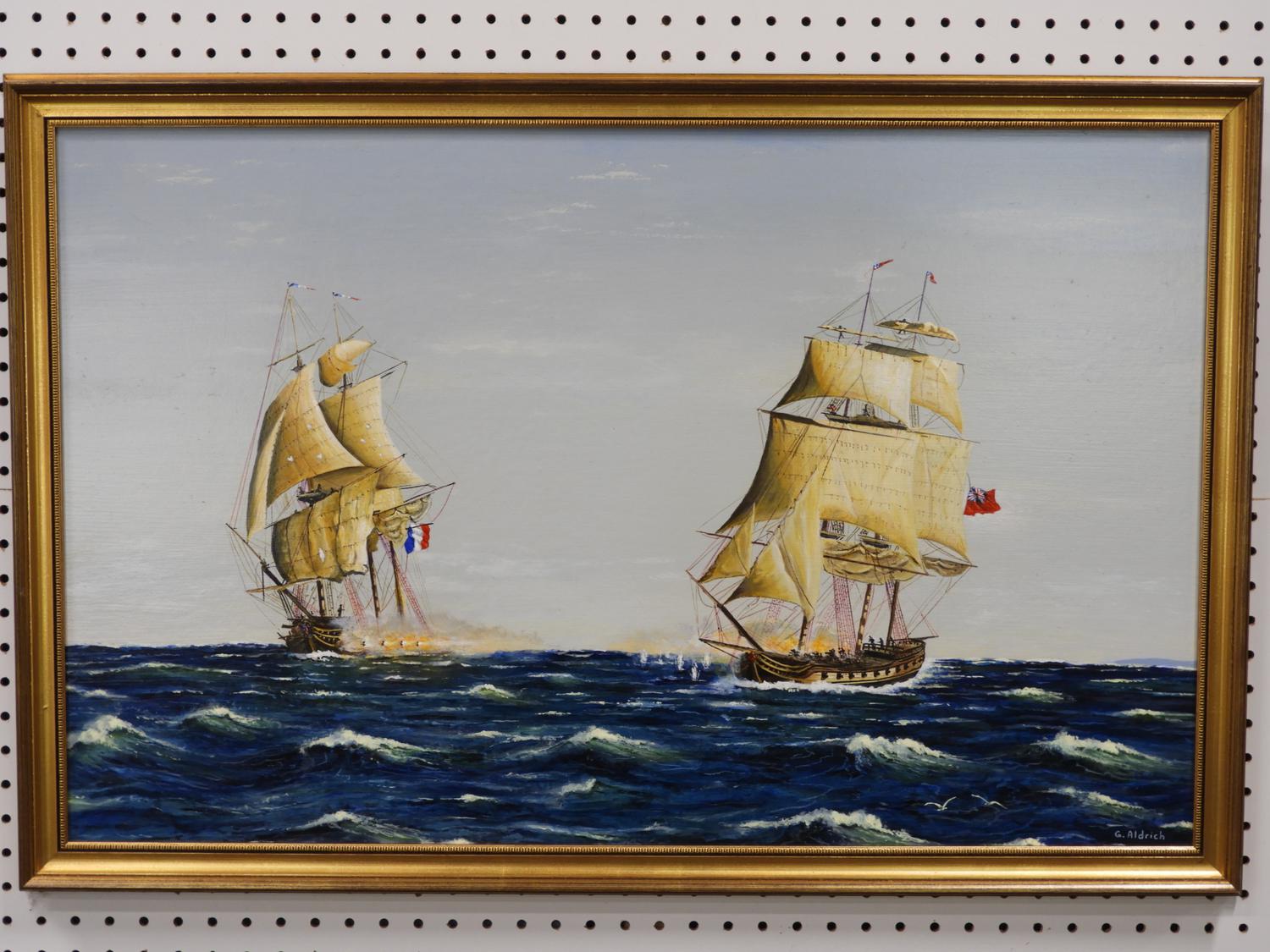 g. aldrich, oil on board, 21" x 32", "english and french navy exchange fire"