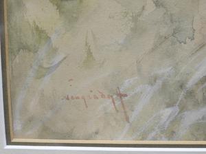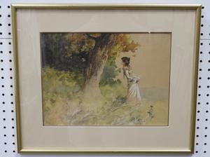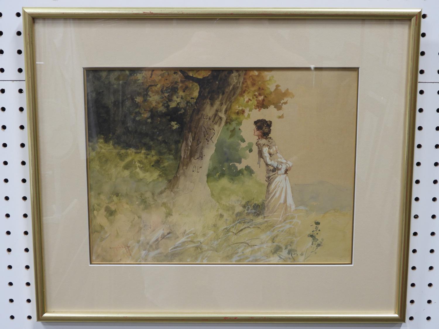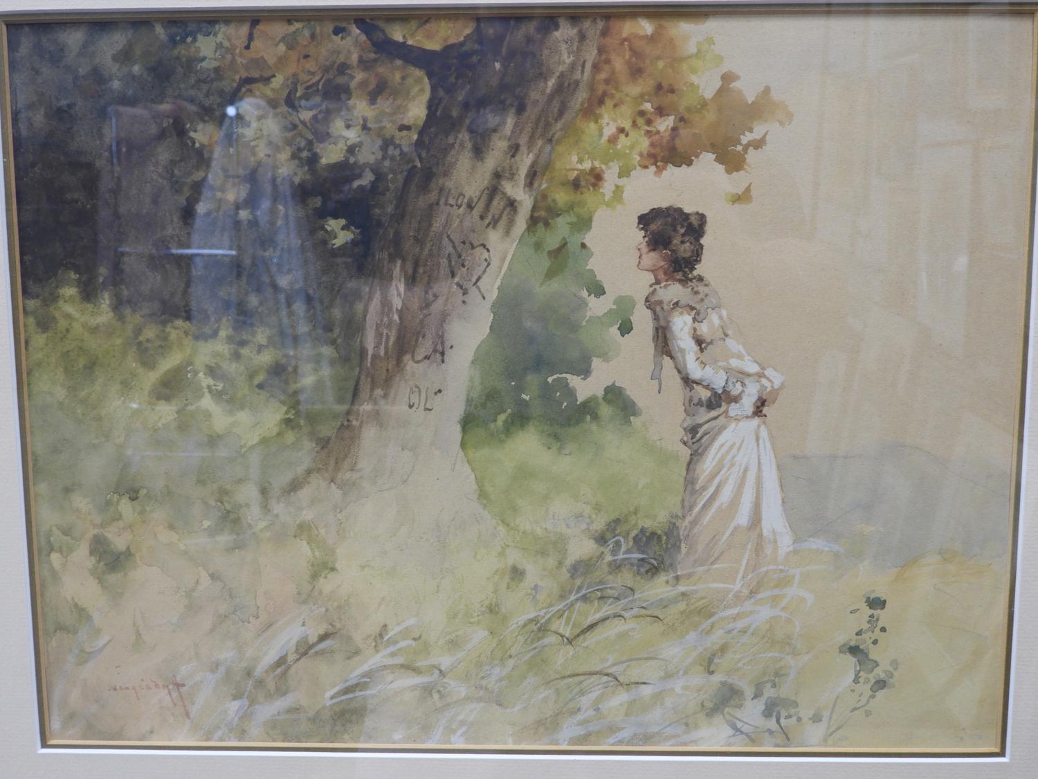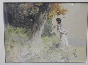 laszlo neogrady (1896-1962), watercolor, 11" x 14 1/2", "lady reading love notes on tree"