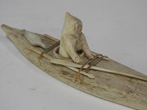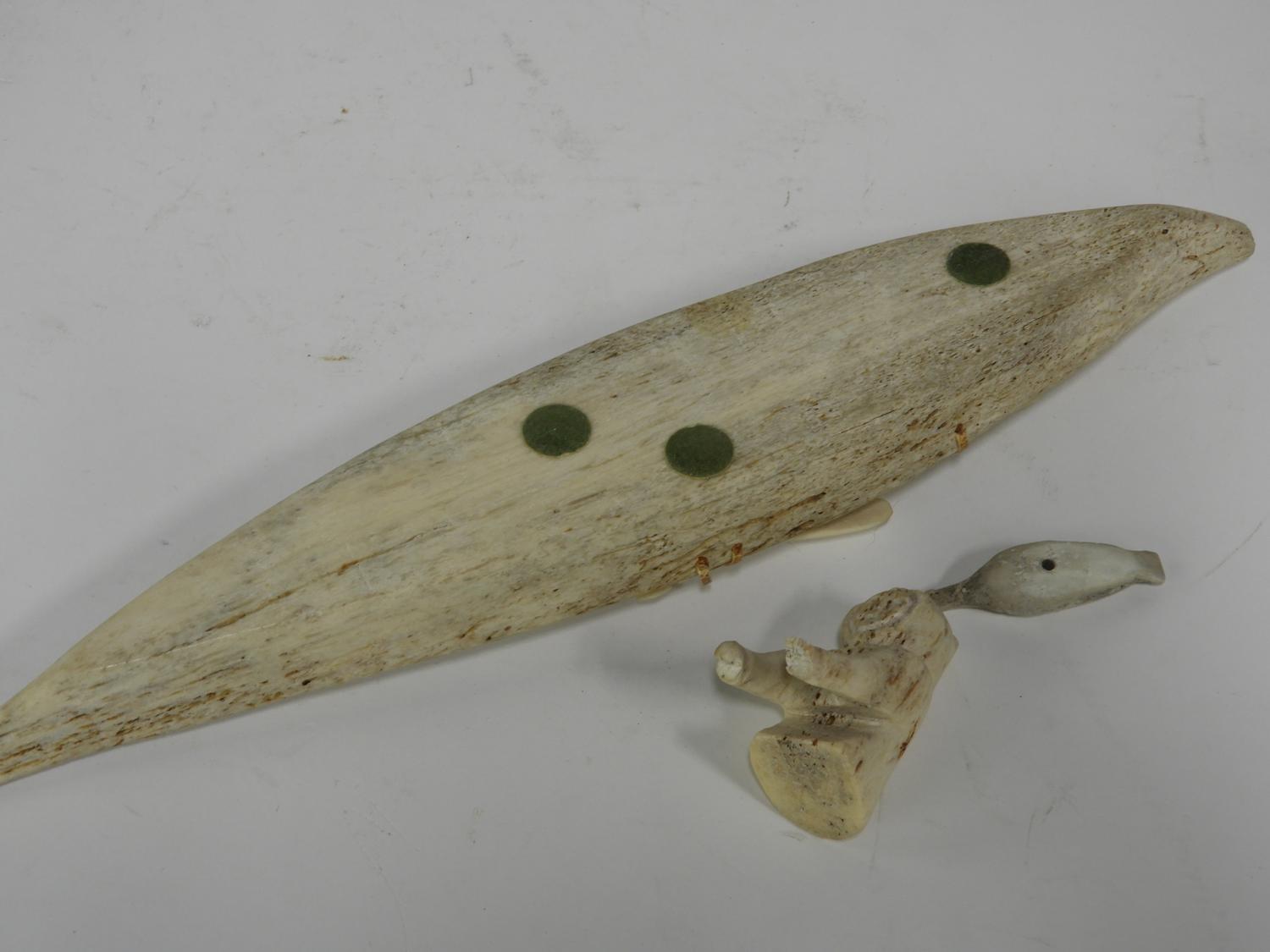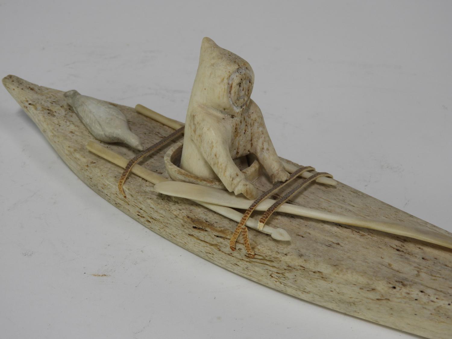 inuit carved whale bone model of a hunter in a kayak, 3 1/2" x 14"