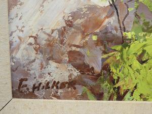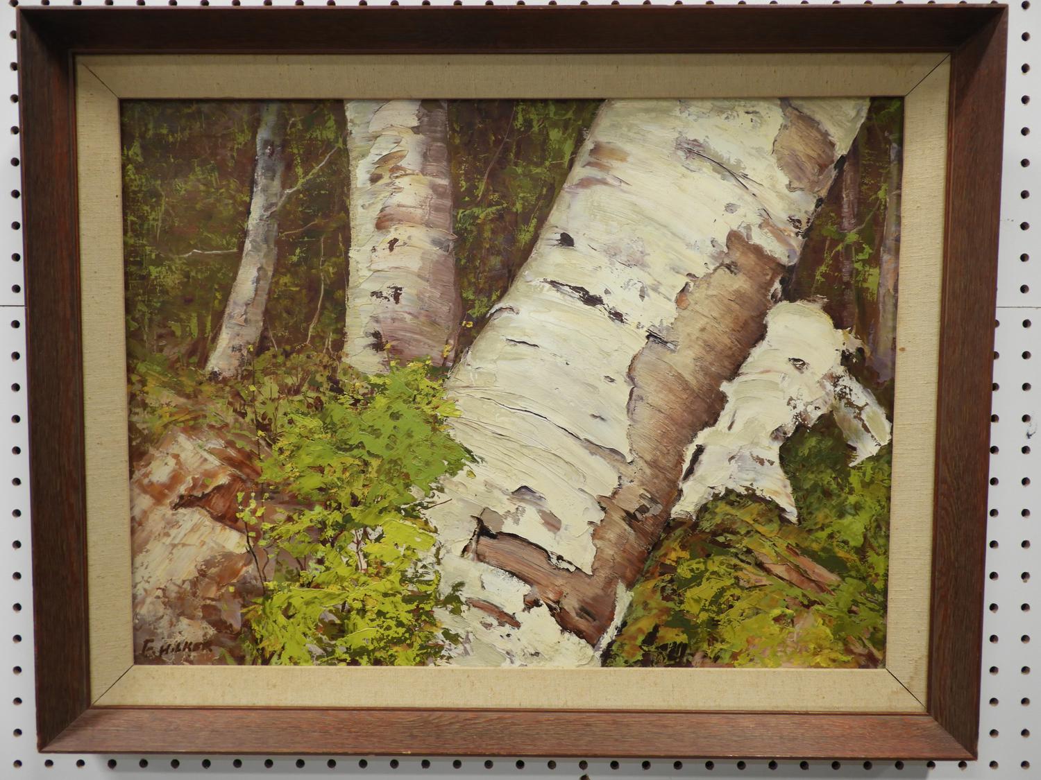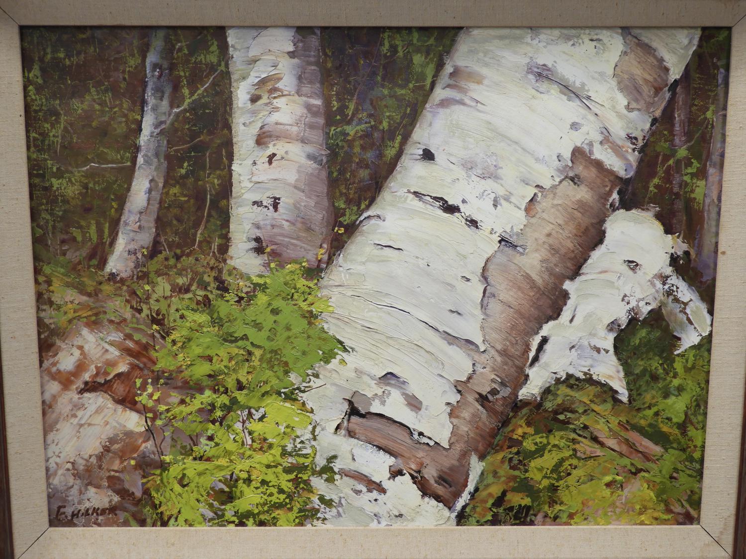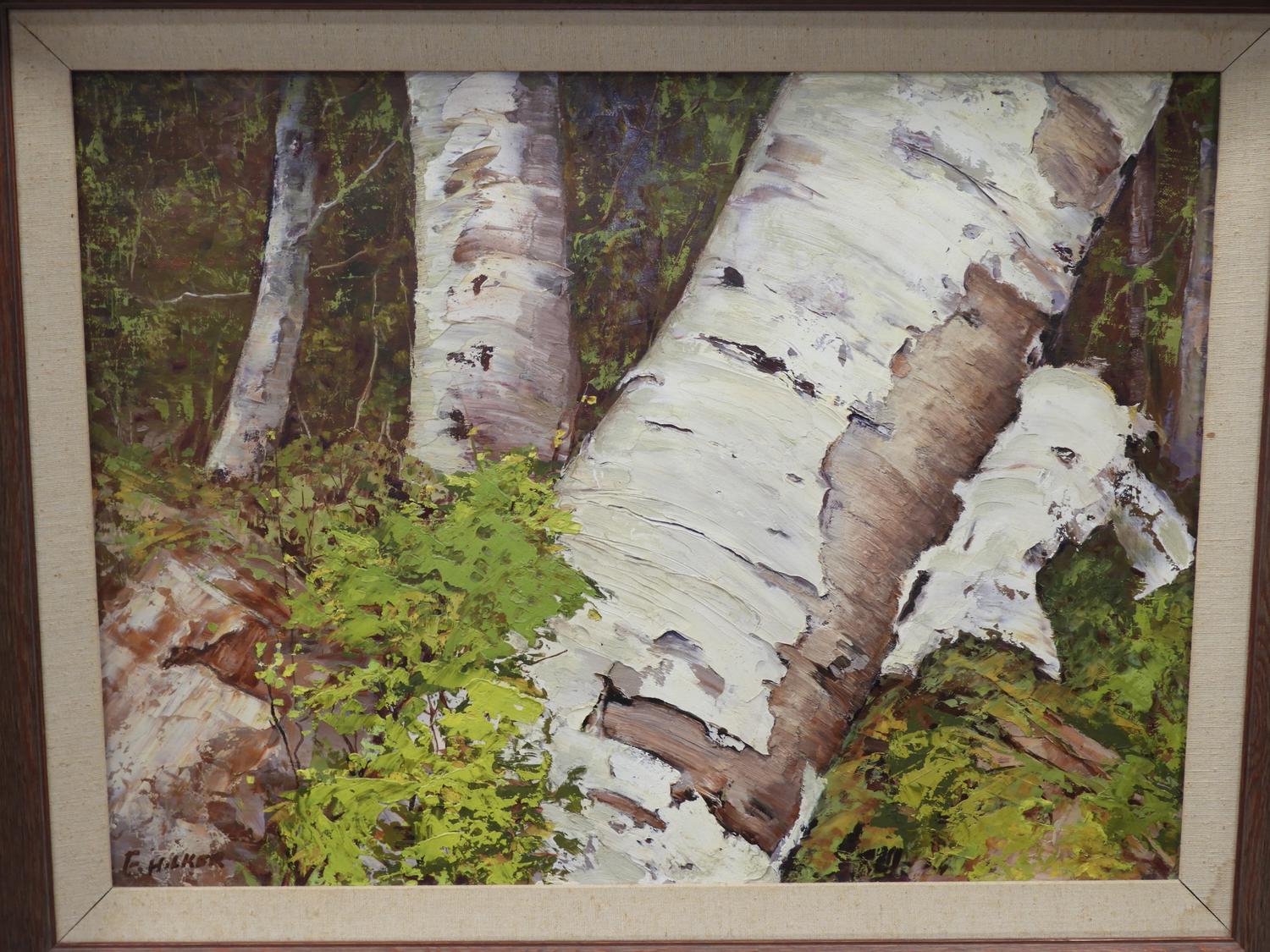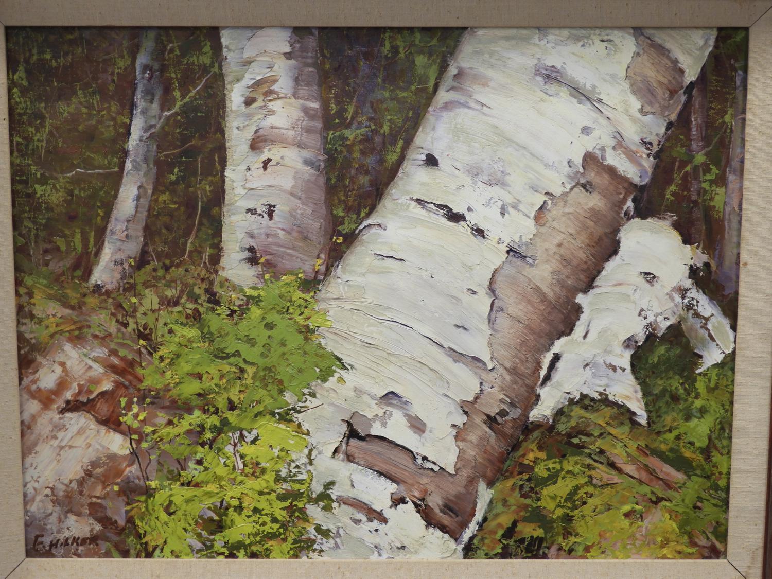 f. milker, oil on board, 18" x 23", "birch tree"
