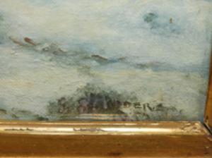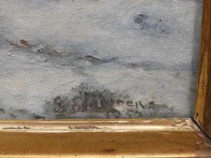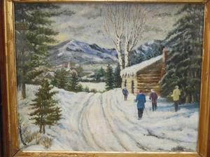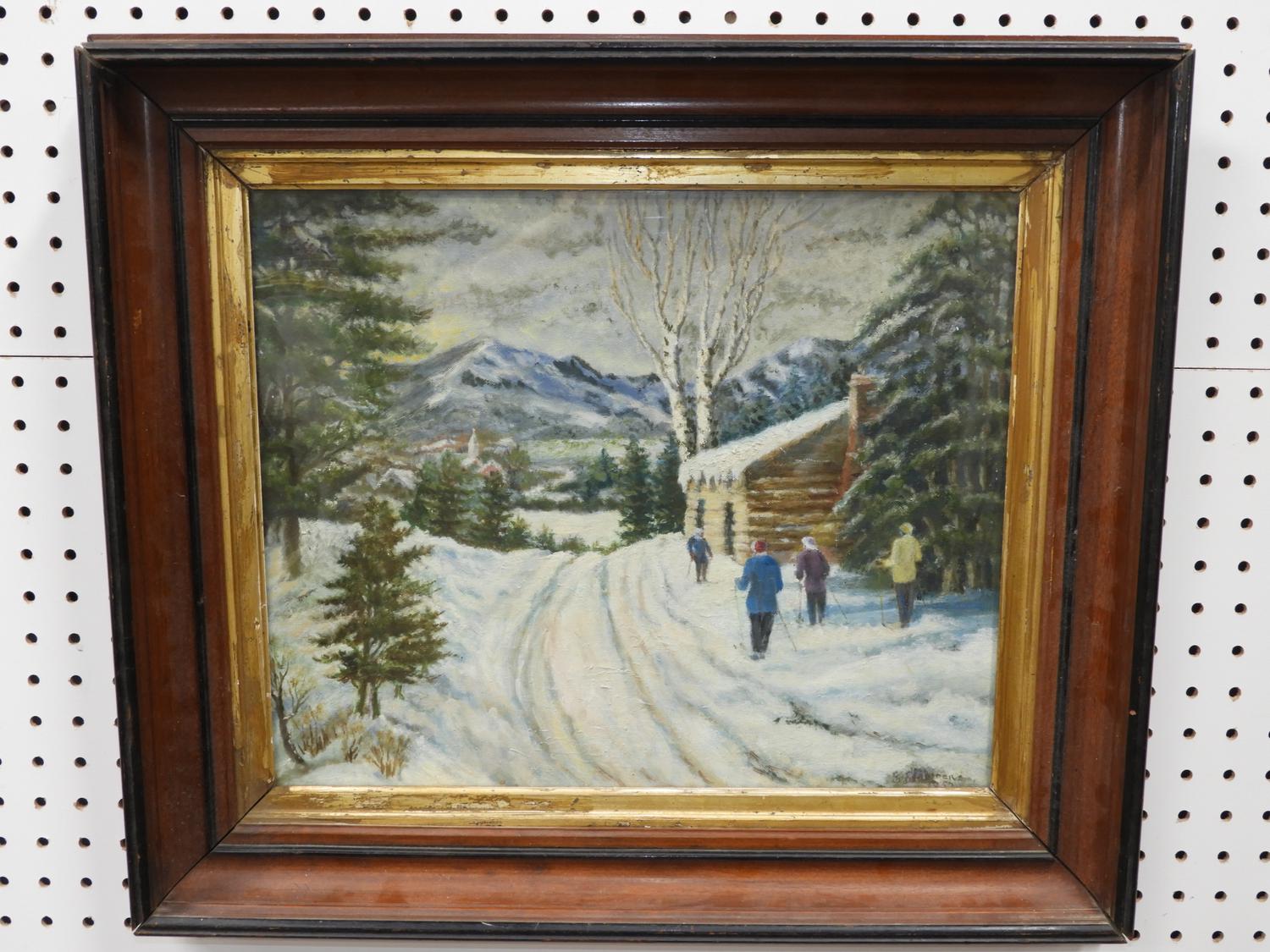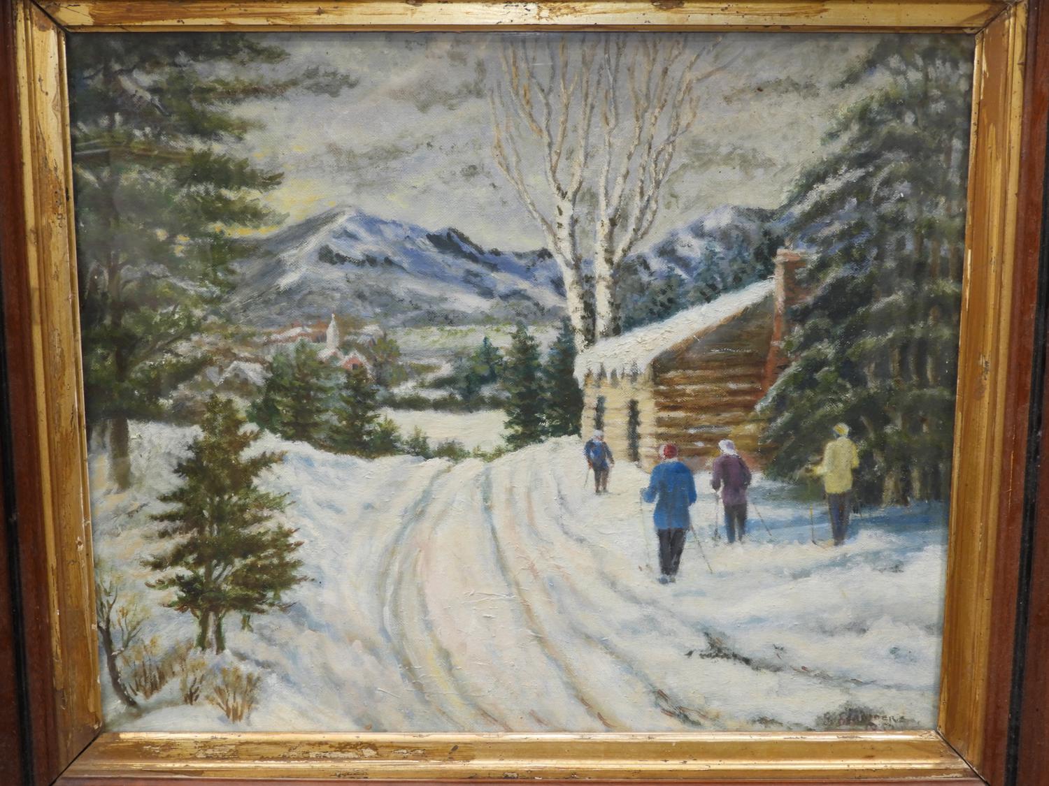 canadian school, d. 1952, oil on board, "winter landscape with skiiers: