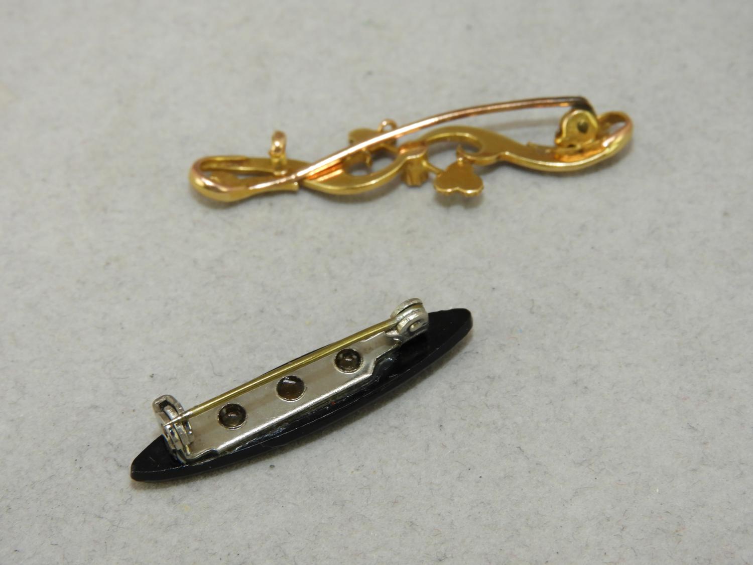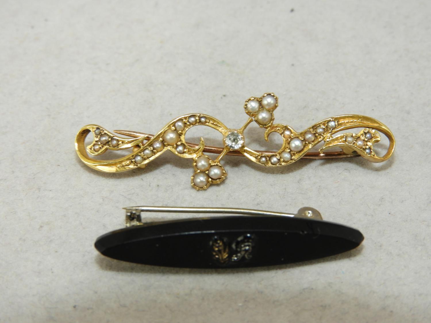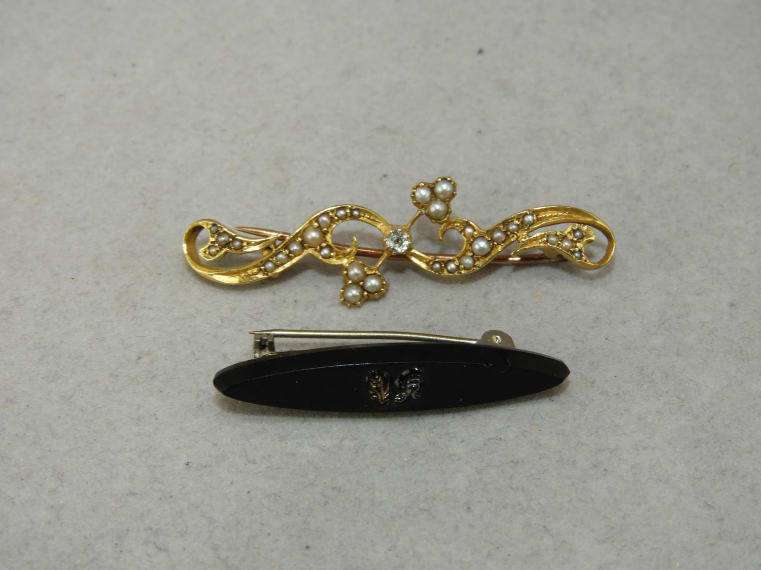 victorian pink gold seed pearl diamond pin, with onyx pin