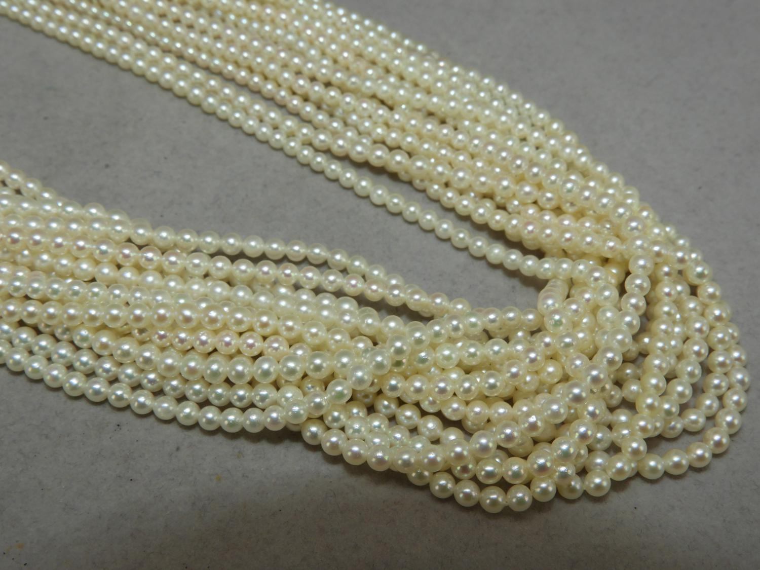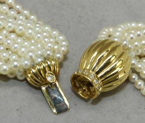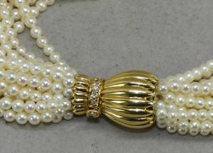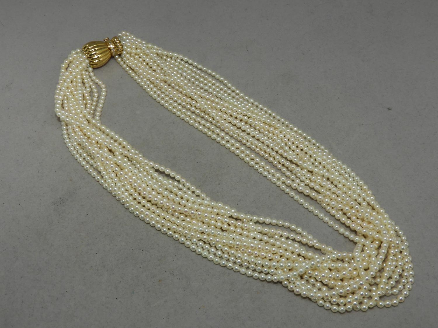 multistrand seed pearl necklace, 18k yellow gold diamond clasp, 18 1/2" in length