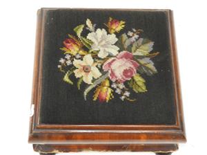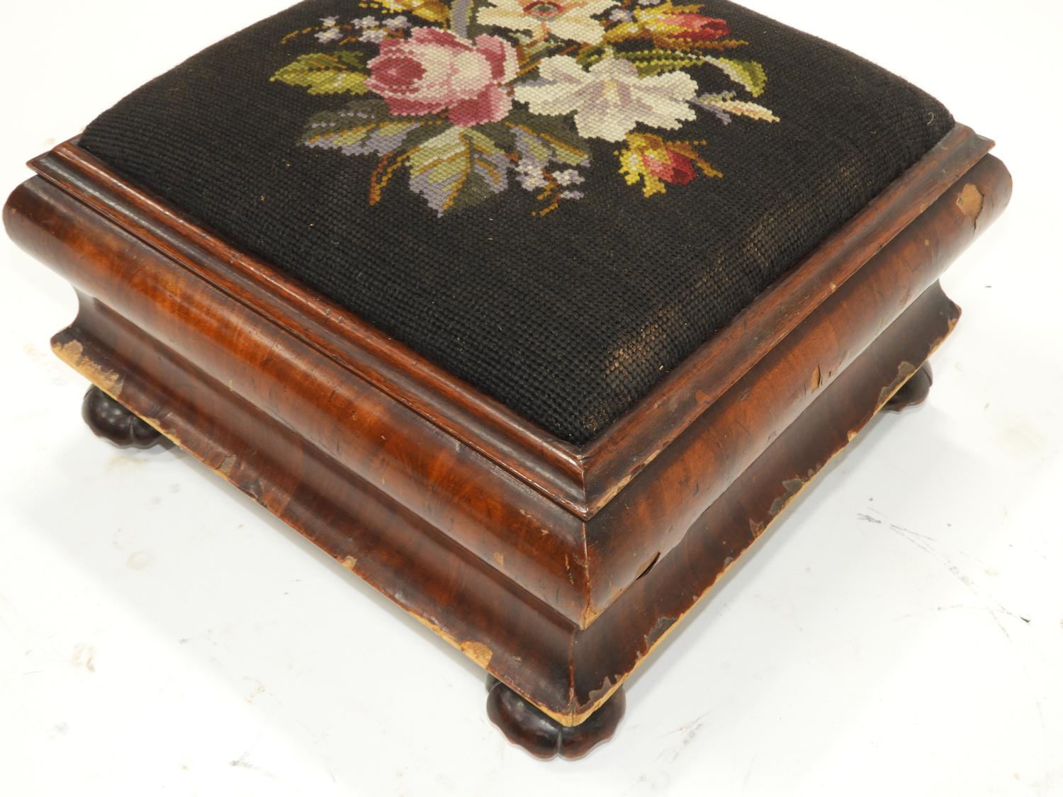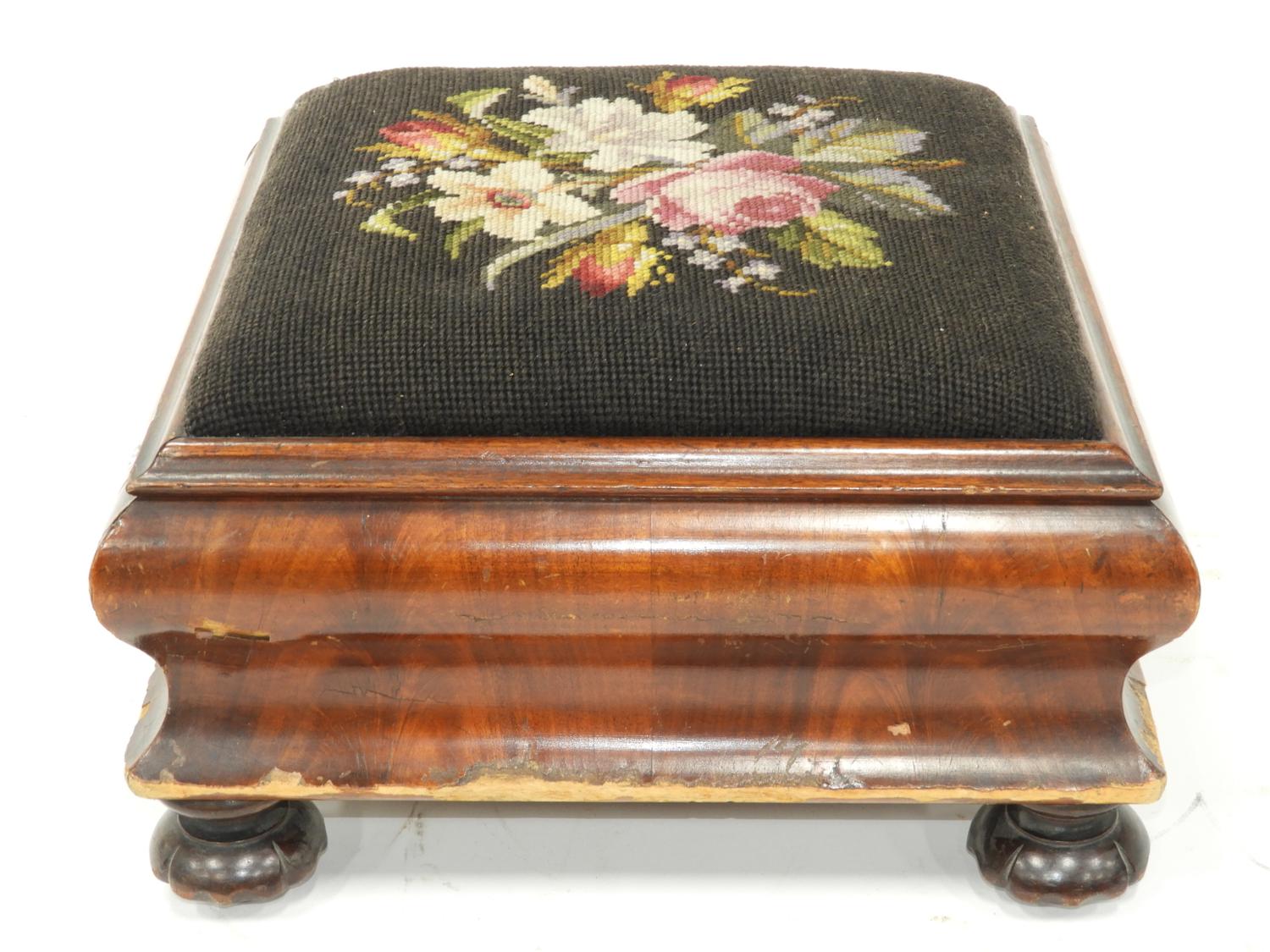 victorian needlework upholstered mahogany footstool, 9 1/2" x 14 1/2" x 14 1/2"