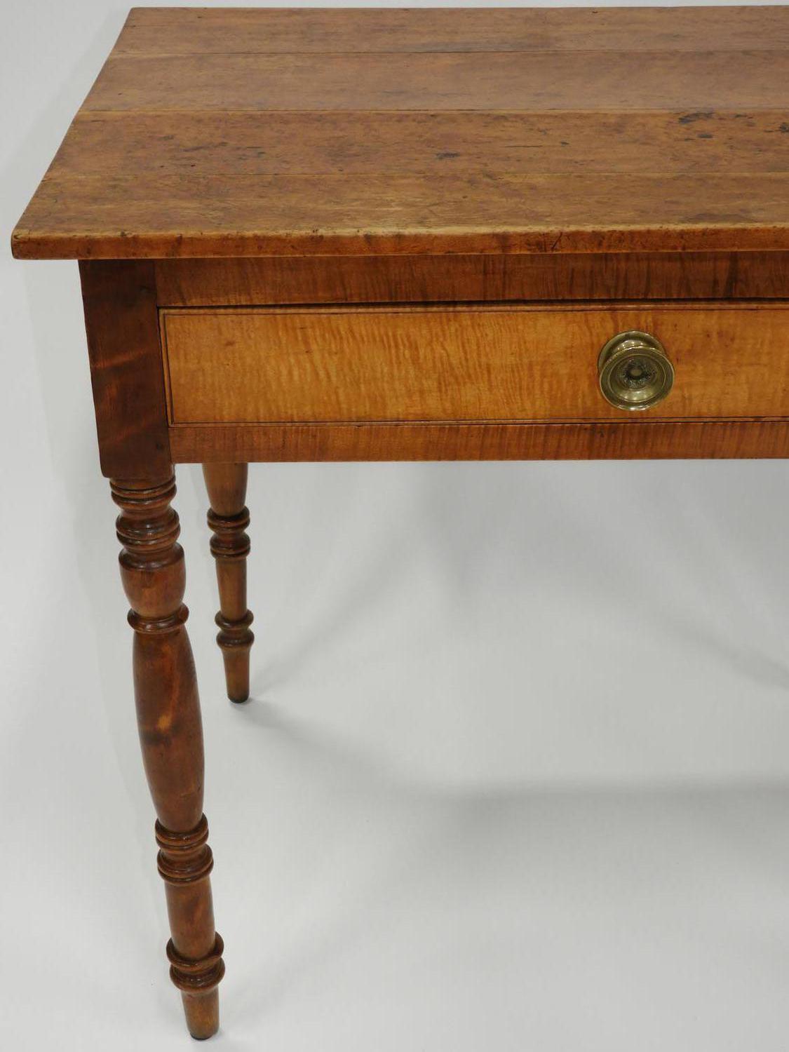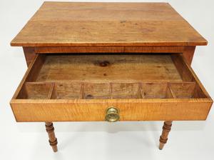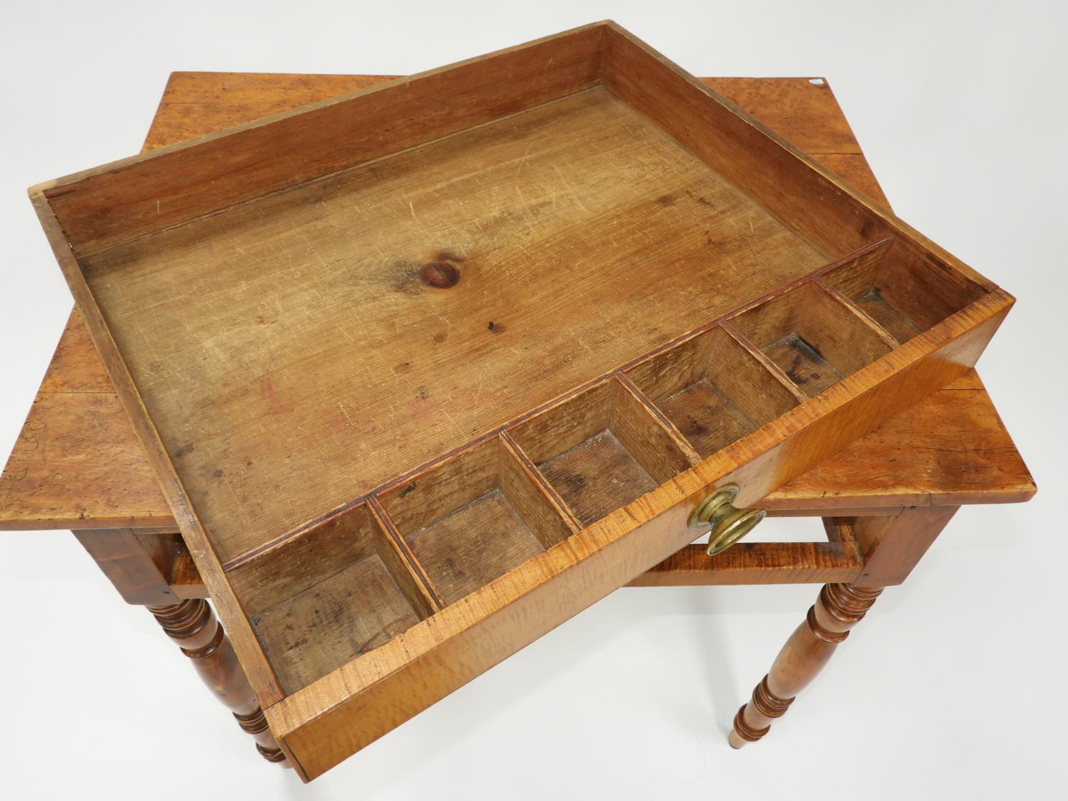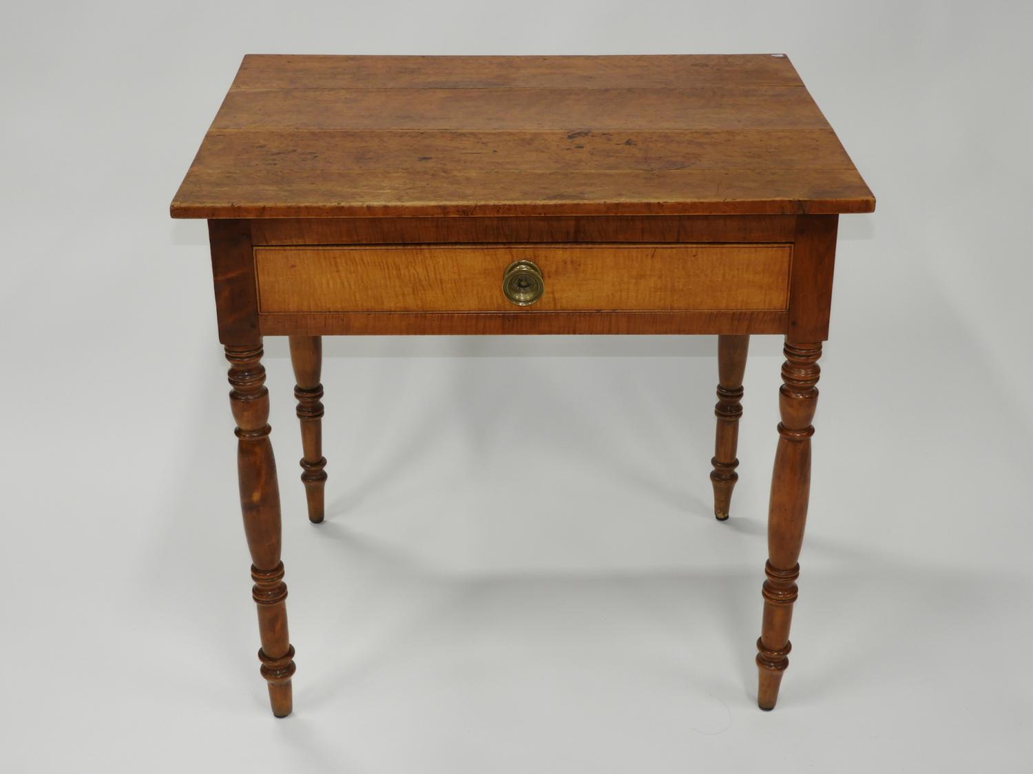 birds eye maple single drawer work table with turned legs, canadian, 19th century, 29 1/2" x 30 1/2" x 23 3/4"