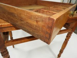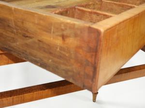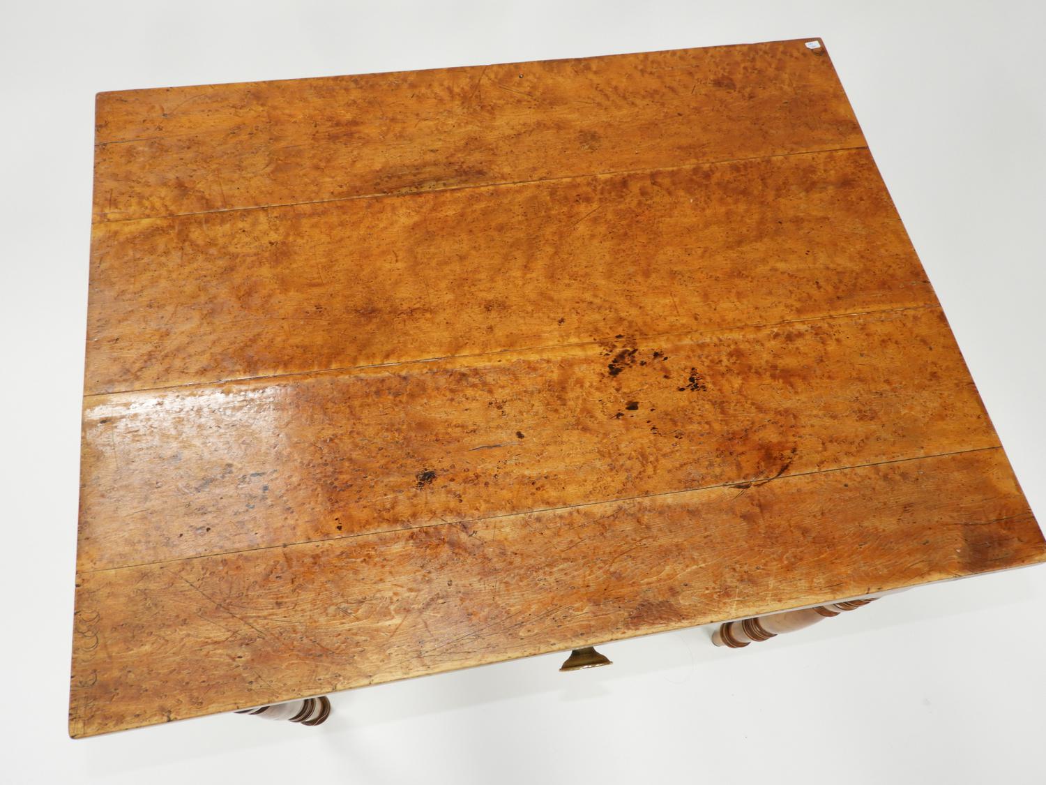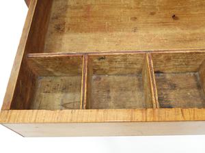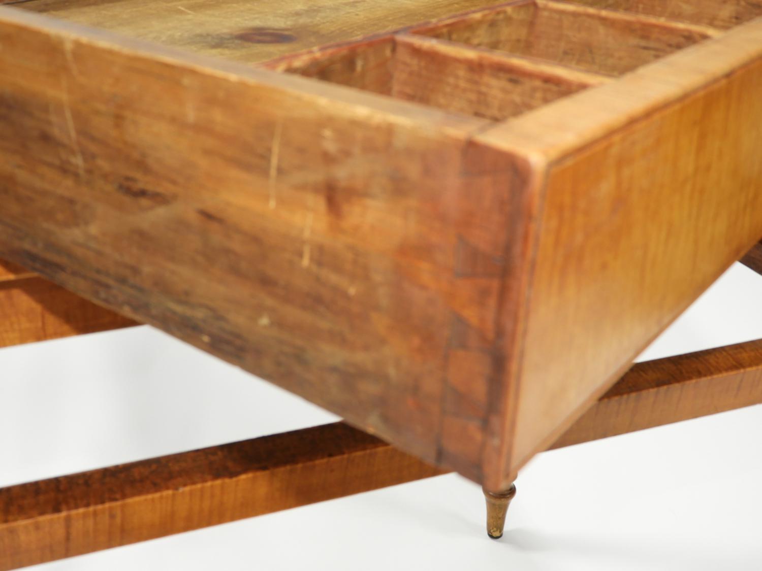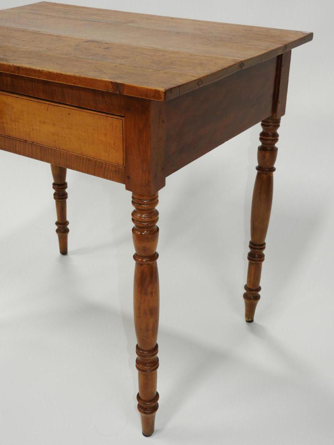 birds eye maple single drawer work table with turned legs, canadian, 19th century, 29 1/2" x 30 1/2" x 23 3/4"