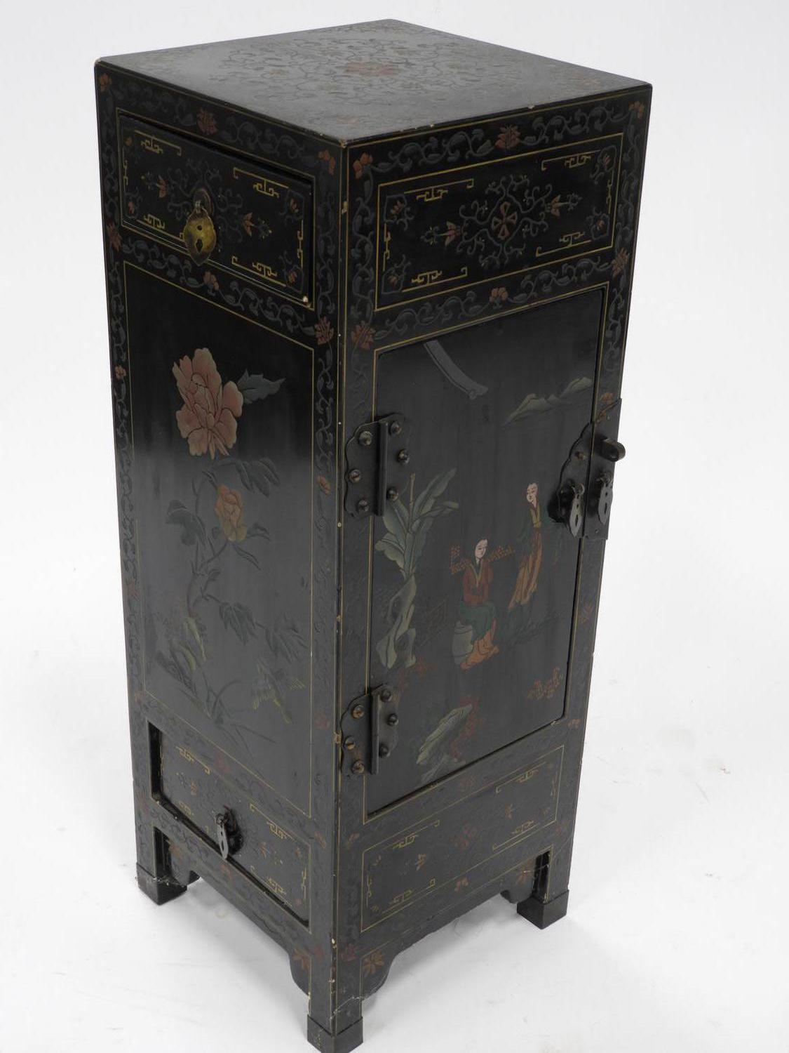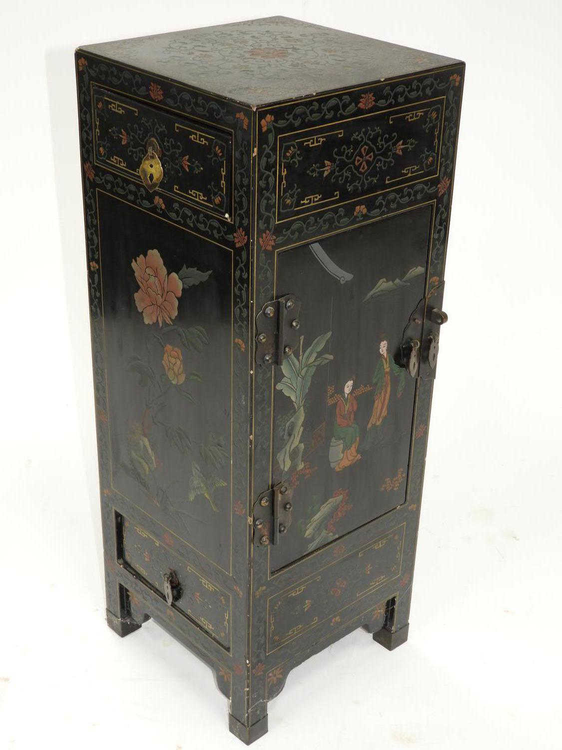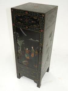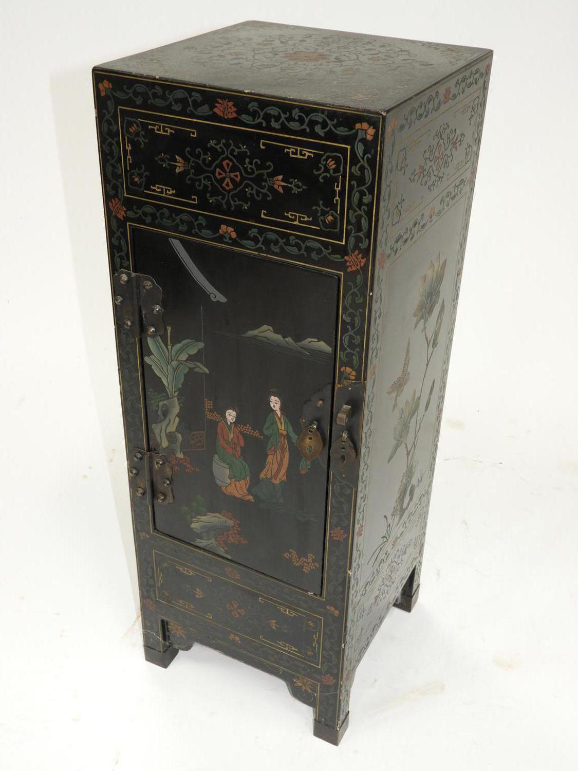 asian painted and lacquered side cabinet, mid 20th century, 30" x 11" x 11"