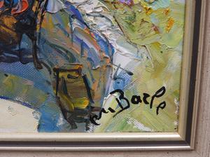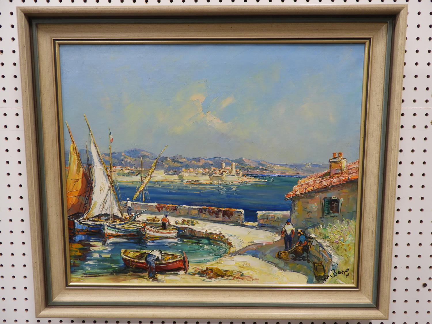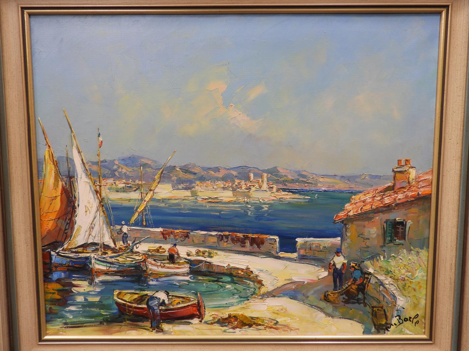 mediterranean school signed m. barp, oil on canvas, 20" x 24", "harbour scene"