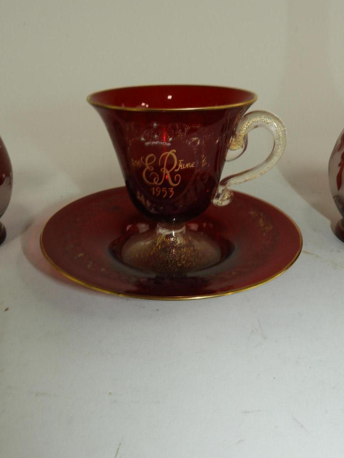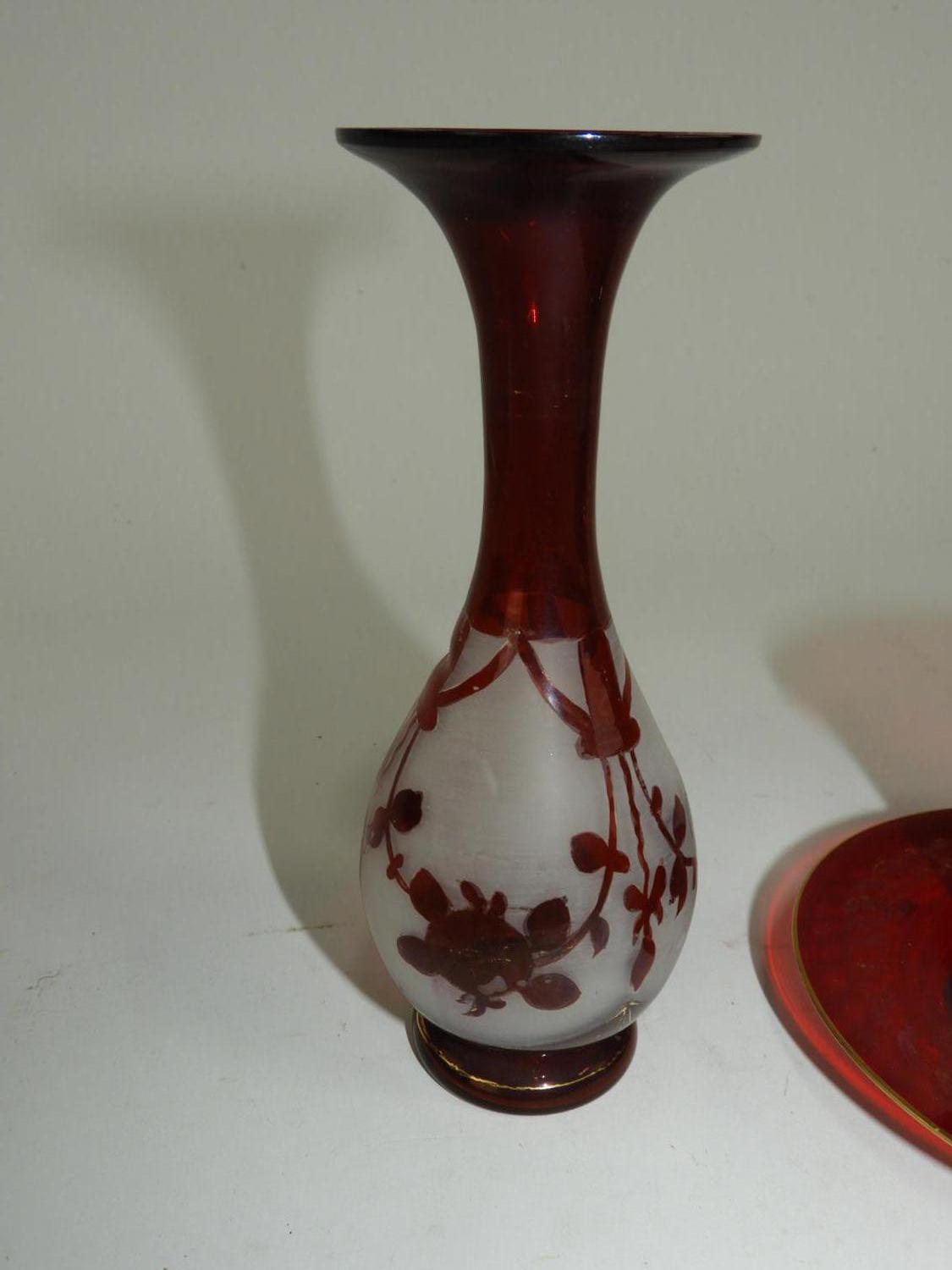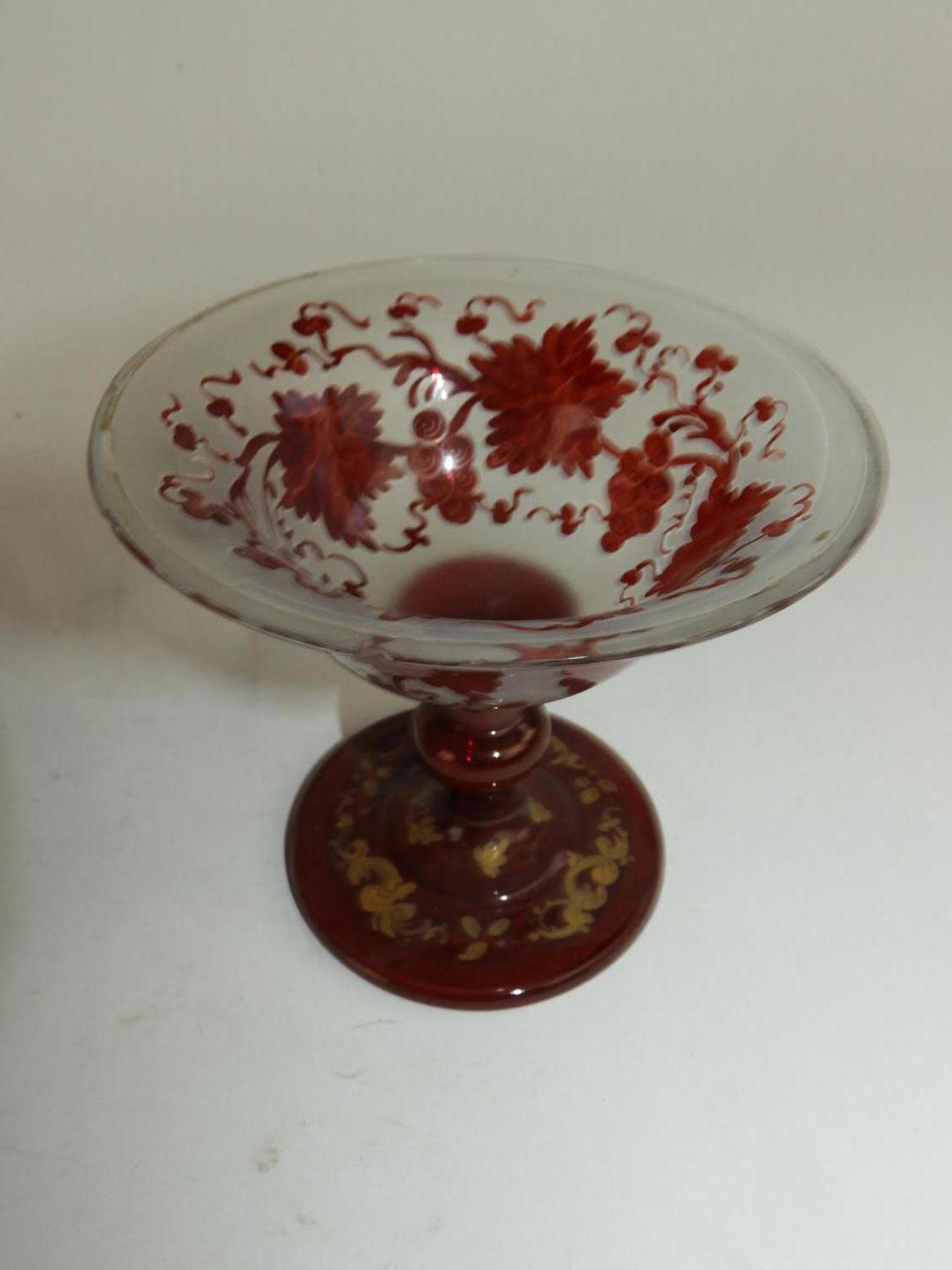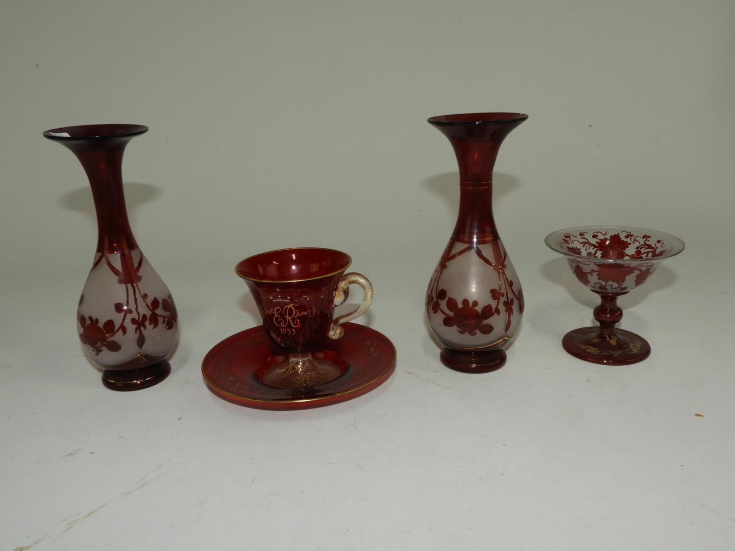 two cut ruby glass vases, pedestal dish, teacup and saucer