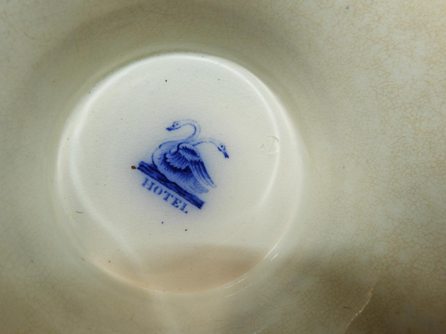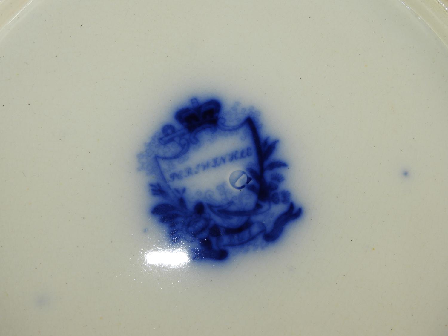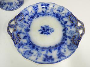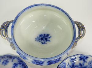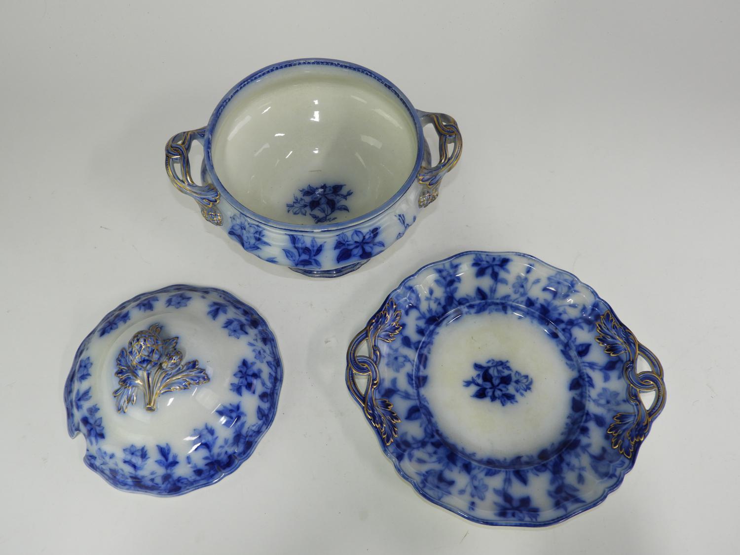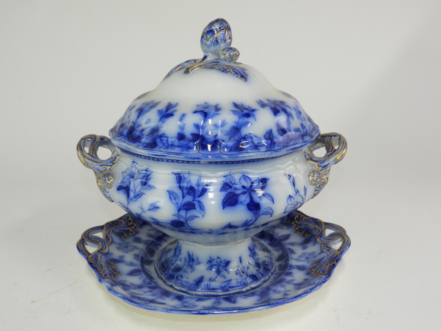 flow blue covered pedestal soup tureen on stand, late 19th century