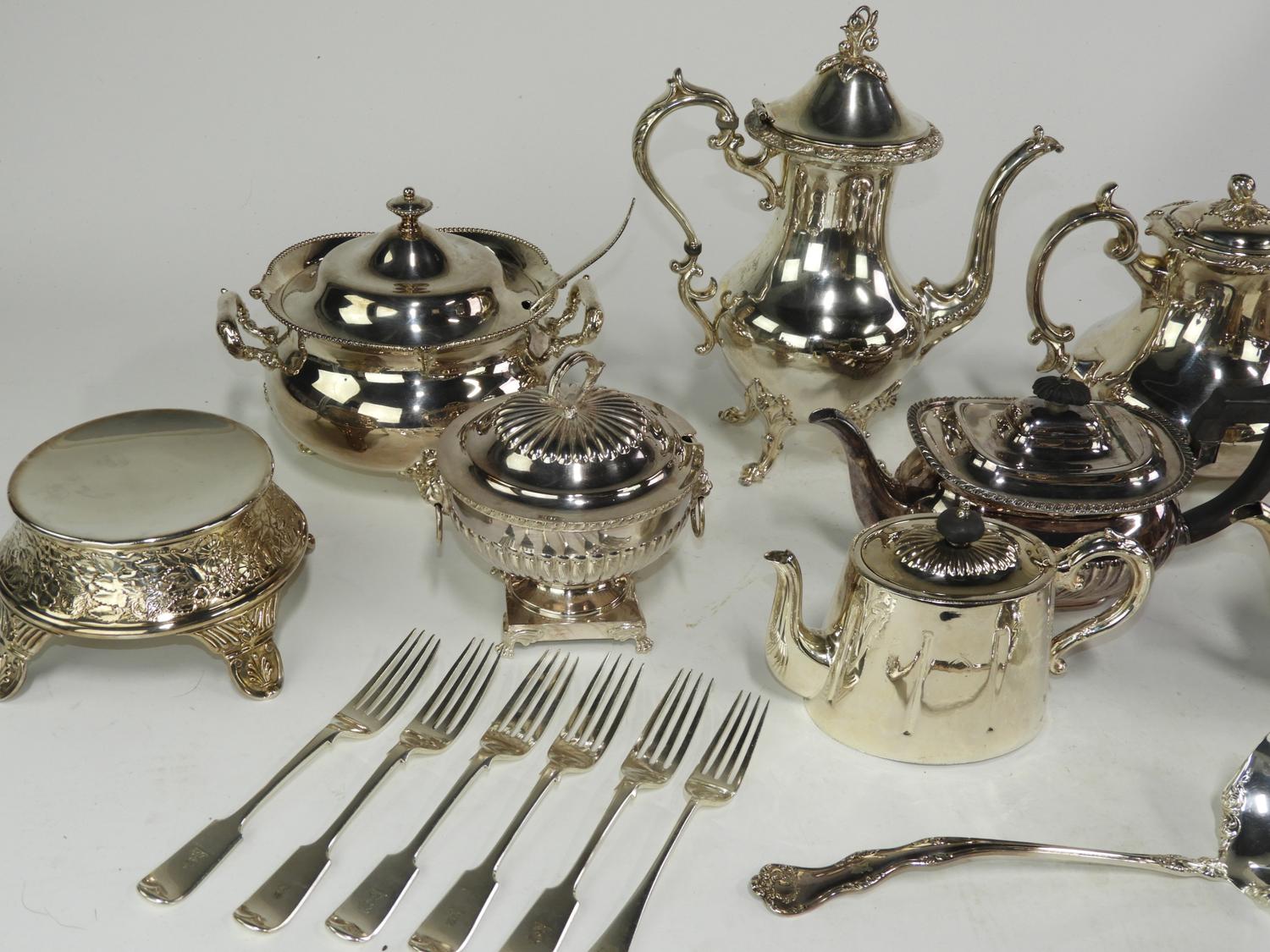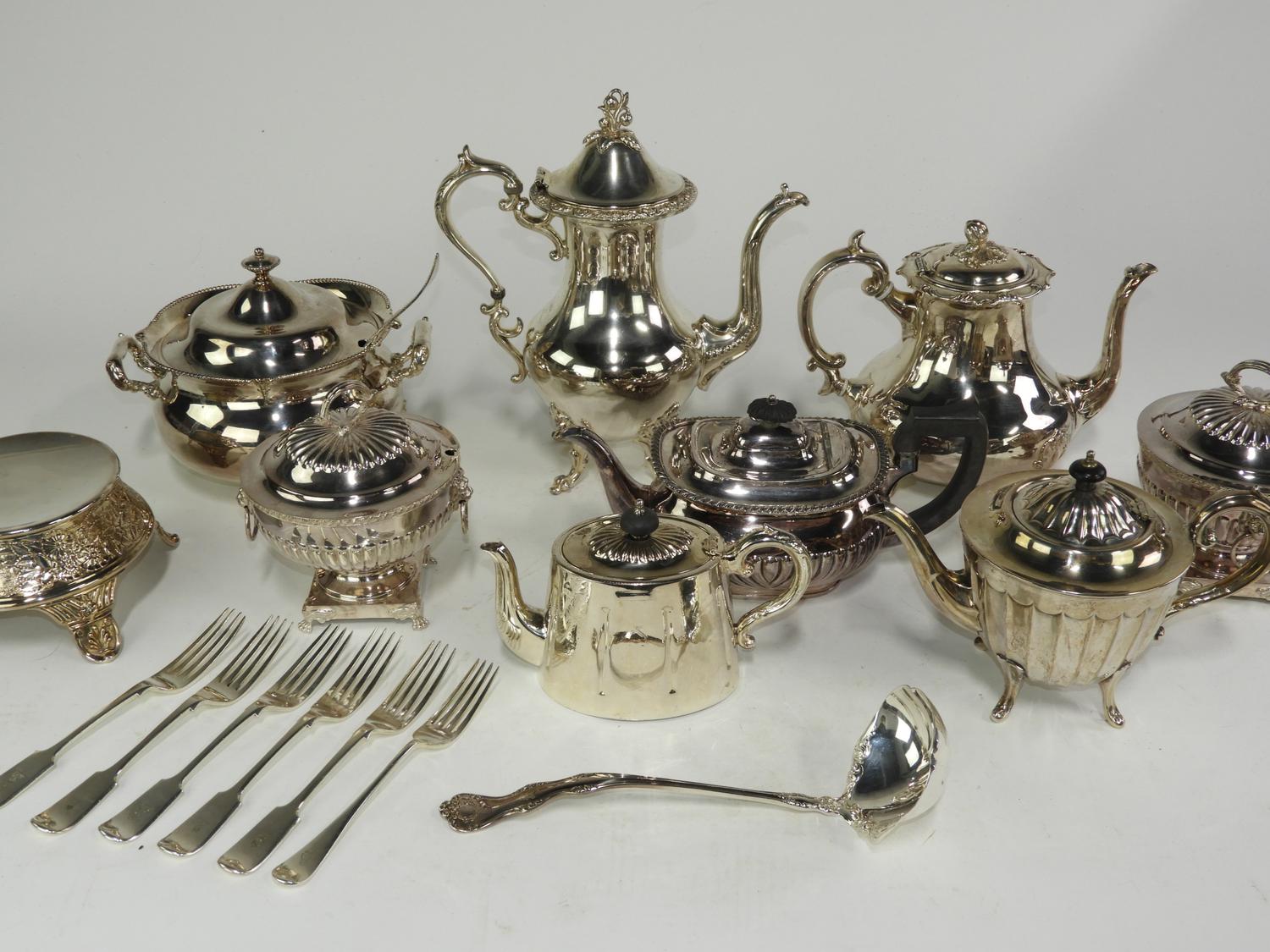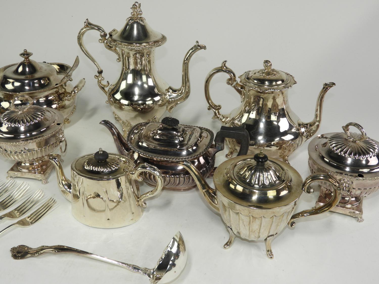 lot of 8 silver plated tea pots and serving items