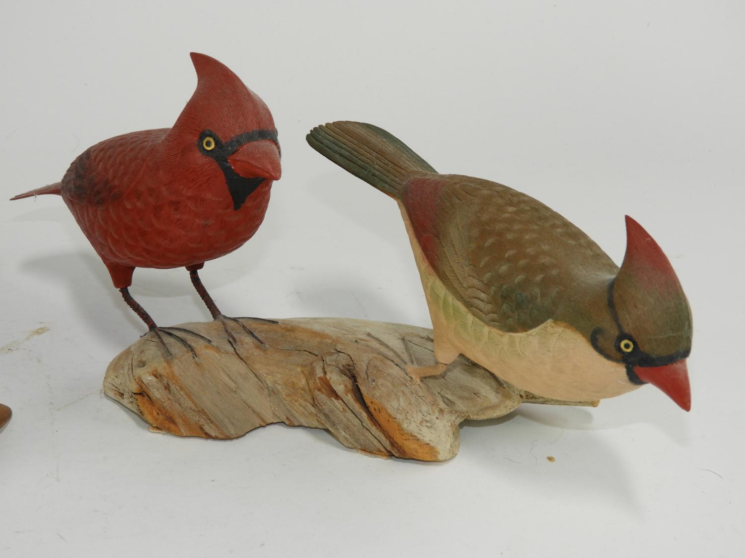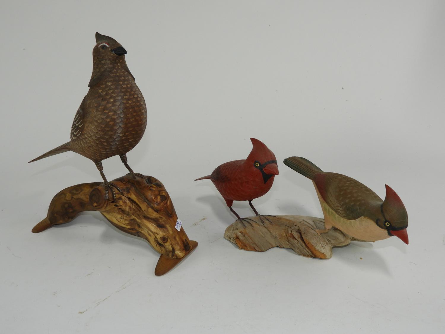 carved and painted decoys "ruffed grouse" & "males and female cardinals"
